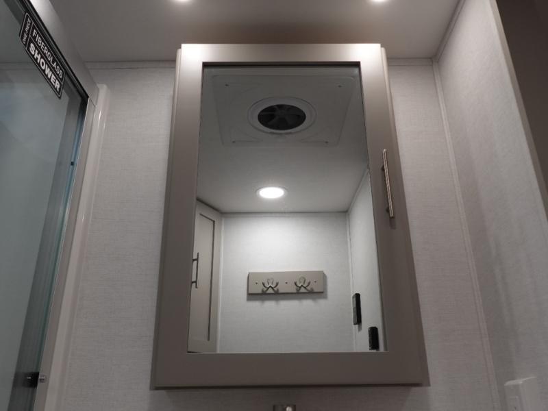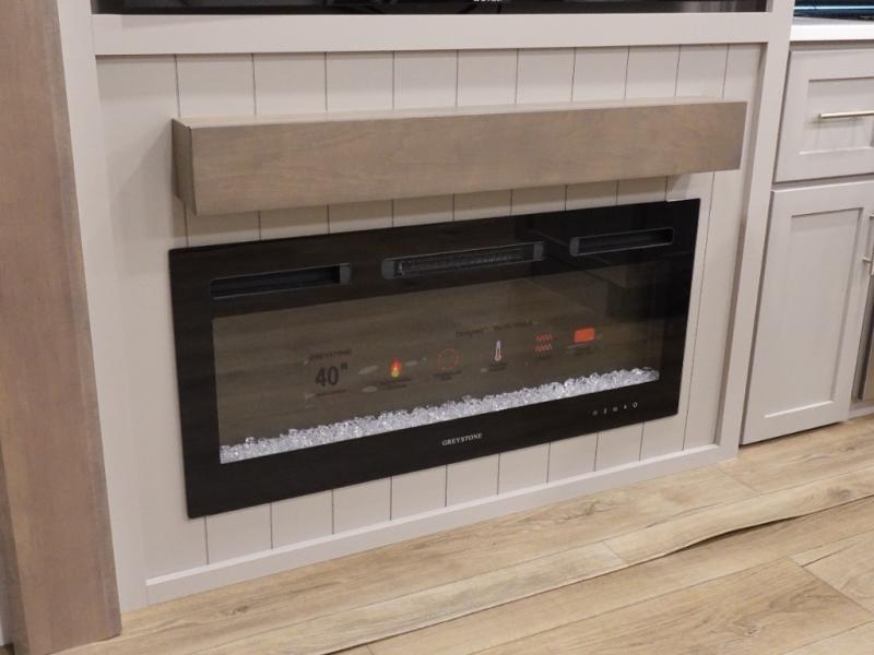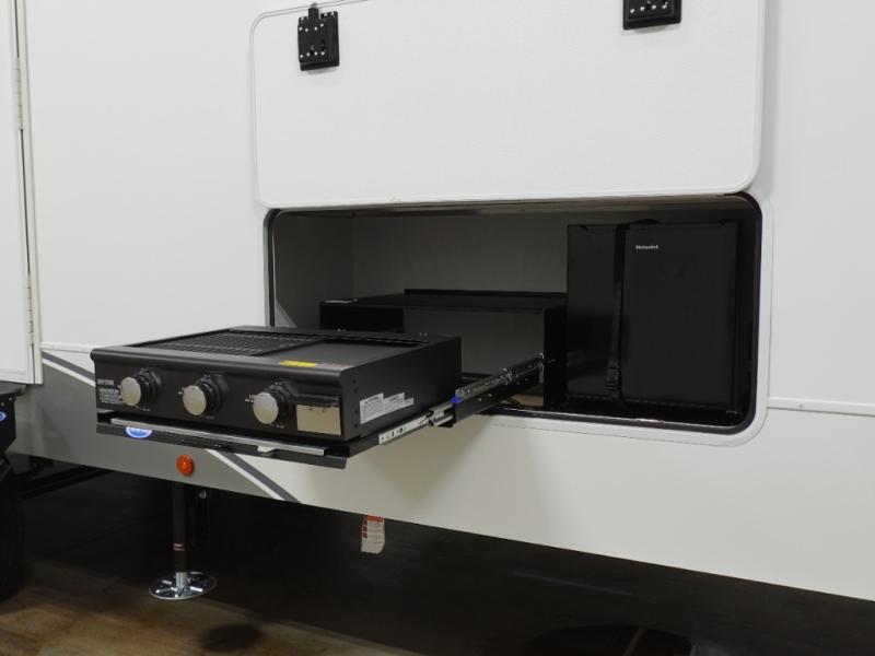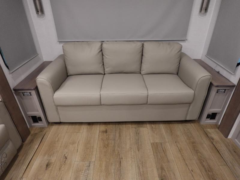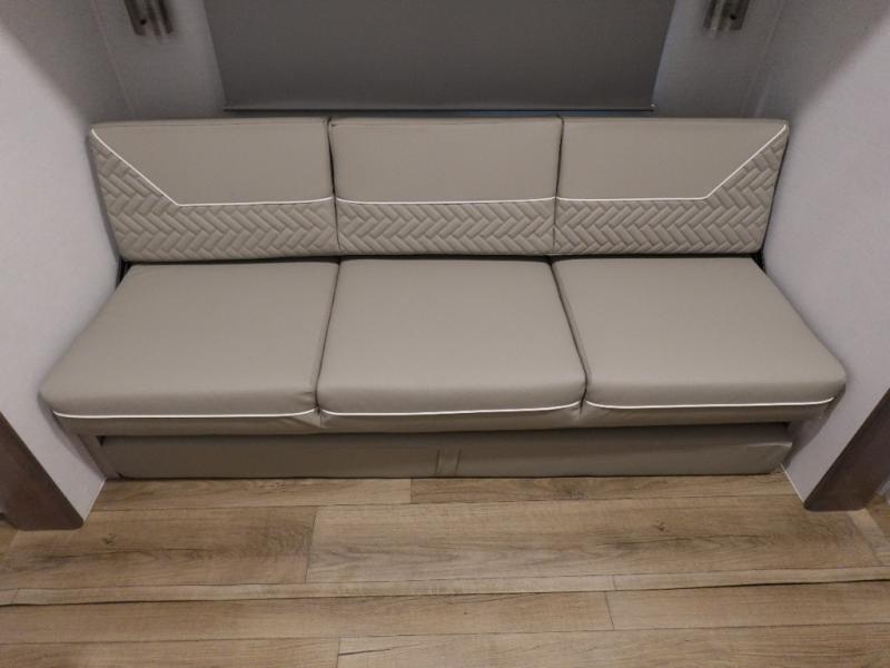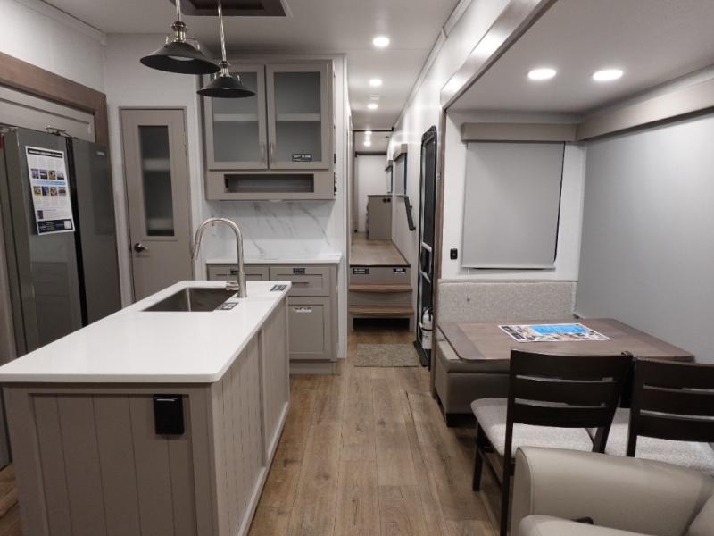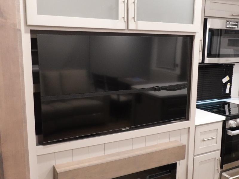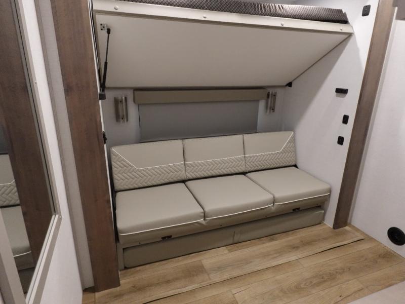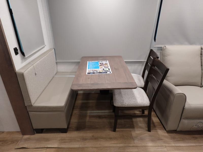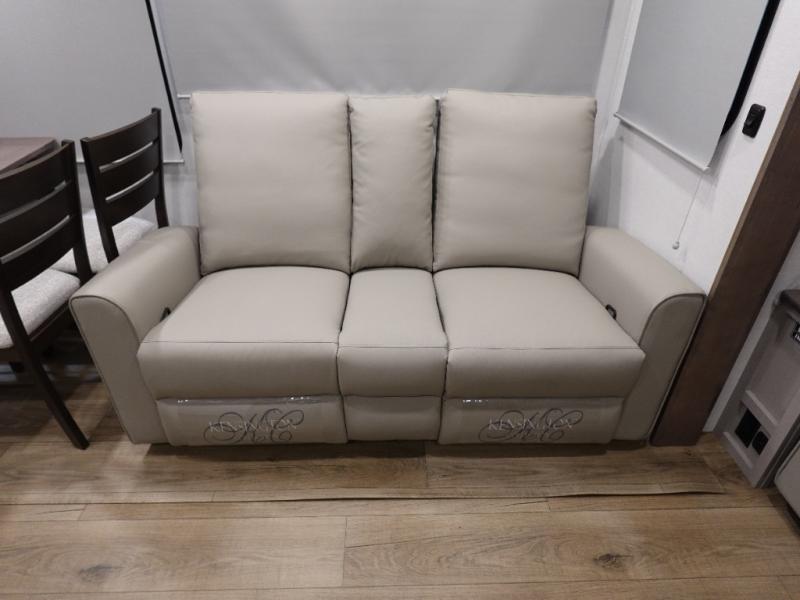Life will be easy in this fifth wheel! The floating dinette table has two chairs on one side and a movable ottoman with flip up storage on the other side to keep your games or extra table cloths in. The kitchen island makes it easy to prepare a delicious home cooked meal. You can store your dishes and snacks inside the hutch/pantry or in the second pantry. The front private bedroom has a king bed slide. There is also a dresser and large wardrobe for storage, and either side of the wardrobe with washer and dryer prep. The rear living area features a dual recliner theater seat across from an entertainment center with a 50" class HDTV with hidden storage behind it, and easy for all to see even at the rear sleeper sofa. Plus, you have a second bedroom with a slide that houses a sleeper sofa bunk and trundle across from a dresser with a 40" TV above it!