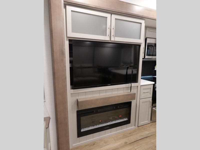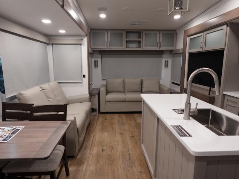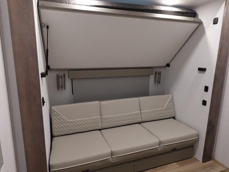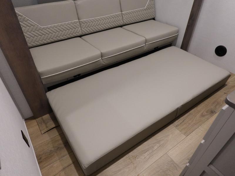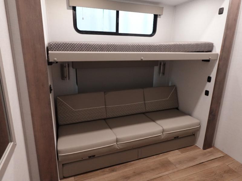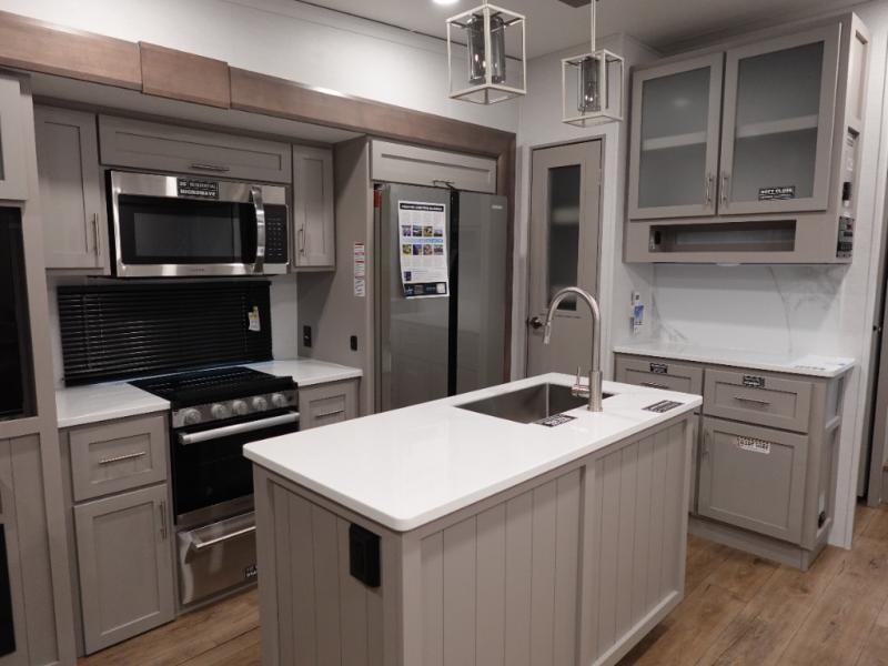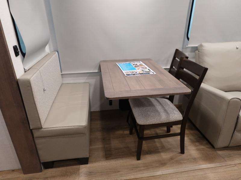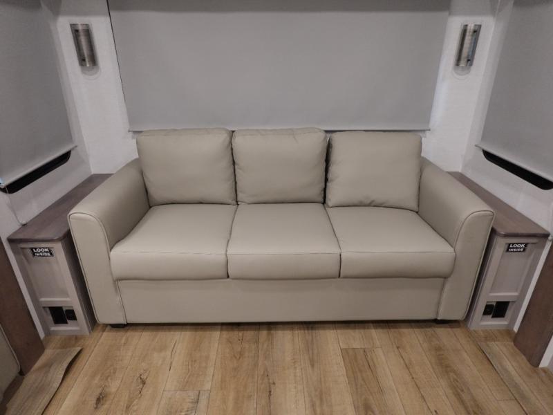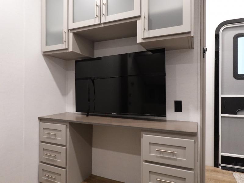 Life will be easy in this fifth wheel! The floating dinette table has two chairs on one side and a movable ottoman with flip up storage on the other side to keep your games or extra table cloths in. The kitchen island makes it easy to prepare a delicious home cooked meal. You can store your dishes and snacks inside the hutch/pantry or in the second pantry. The front private bedroom has a king bed slide. There is also a dresser and large wardrobe for storage, and either side of the wardrobe with washer and dryer prep. The rear living area features a dual recliner theater seat across from an entertainment center with a 50" class HDTV with hidden storage behind it, and easy for all to see even at the rear sleeper sofa. Plus, you have a second bedroom with a slide that houses a sleeper sofa bunk and trundle across from a dresser with a 40" TV above it!