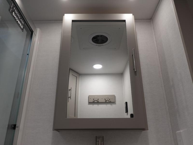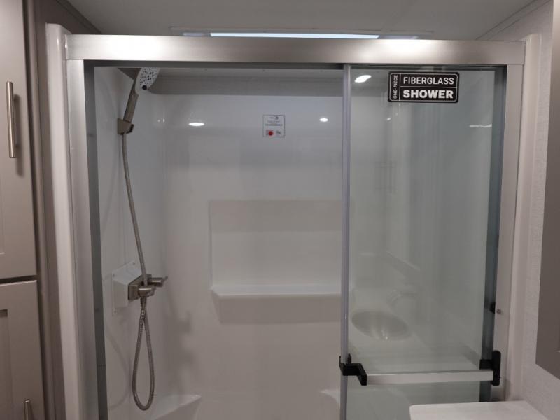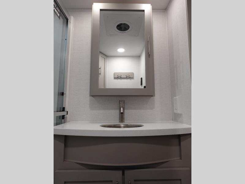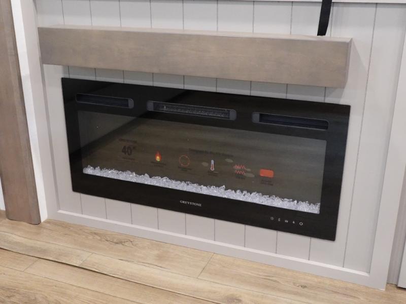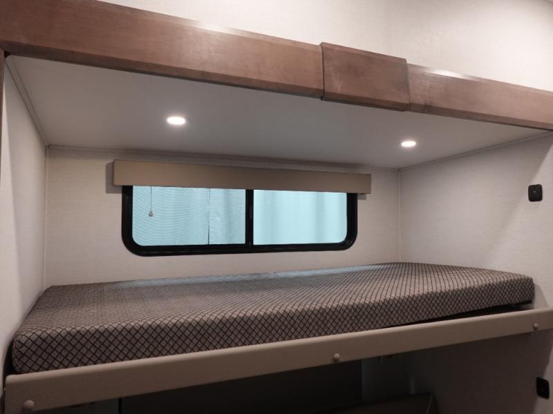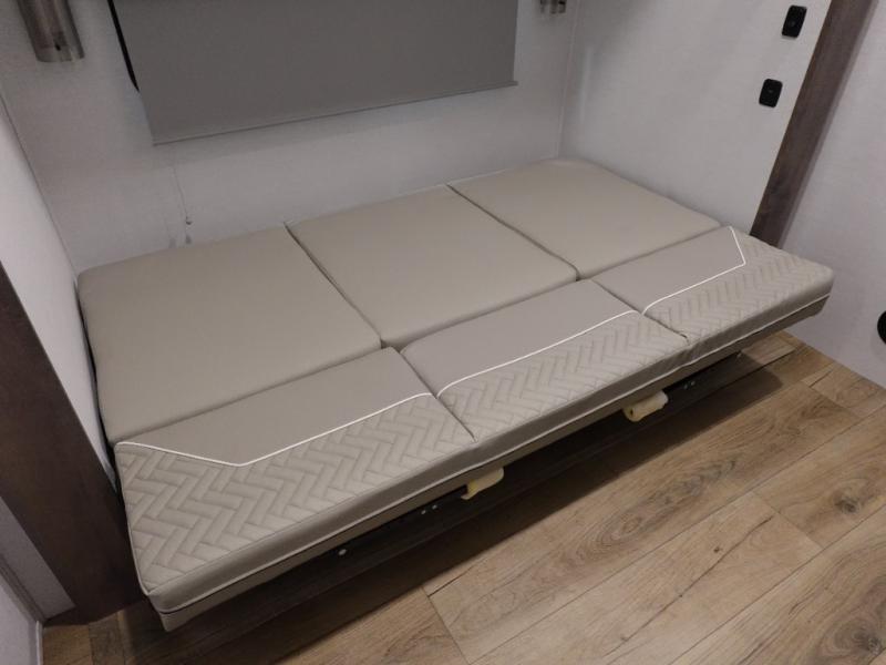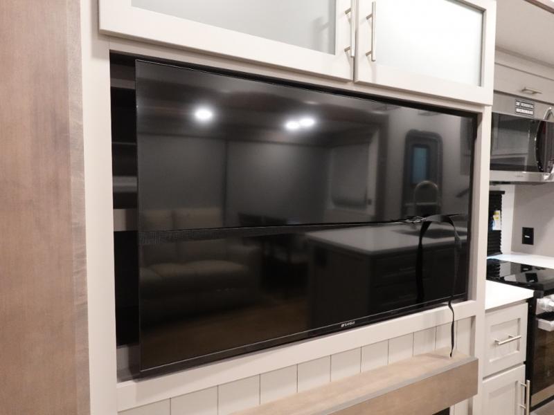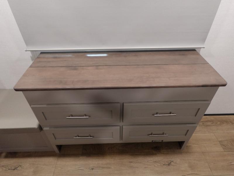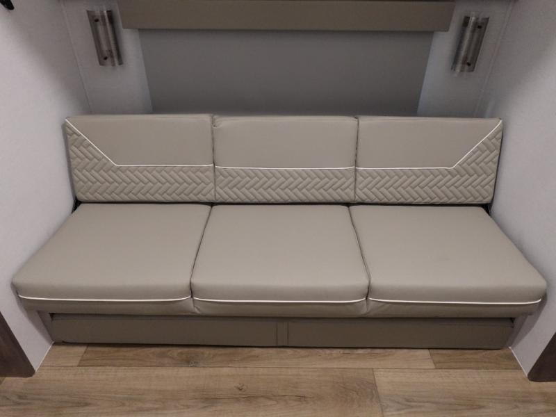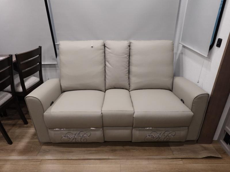Life will be easy in this fifth wheel! The floating dinette table has two chairs on one side and a movable ottoman with flip up storage on the other side to keep your games or extra table cloths in. The kitchen island makes it easy to prepare a delicious home cooked meal. You can store your dishes and snacks inside the hutch/pantry or in the second pantry. The front private bedroom has a king bed slide. There is also a dresser and large wardrobe for storage, and either side of the wardrobe with washer and dryer prep. The rear living area features a dual recliner theater seat across from an entertainment center with a 50" class HDTV with hidden storage behind it, and easy for all to see even at the rear sleeper sofa. Plus, you have a second bedroom with a slide that houses a sleeper sofa bunk and trundle across from a dresser with a 40" TV above it!