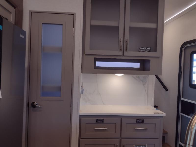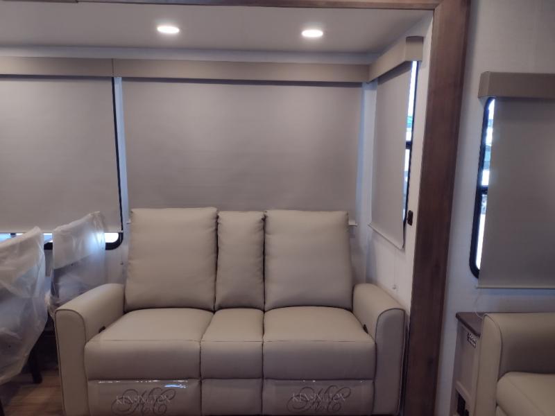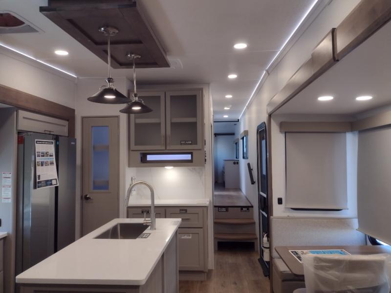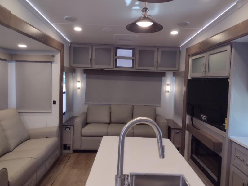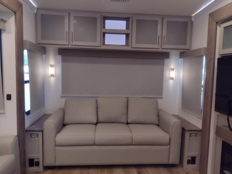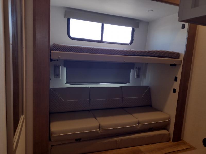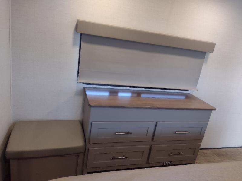 Life will be easy in this fifth wheel! The floating dinette table has two chairs on one side and a movable ottoman with flip up storage on the other side to keep your games or extra table cloths in. The kitchen island makes it easy to prepare a delicious home cooked meal. You can store your dishes and snacks inside the hutch/pantry or in the second pantry. The front private bedroom has a queen bed slide but can be switched out for the optional king bed if you like. There is also a dresser and large wardrobe for storage, and either side of the wardrobe with washer and dryer prep. The rear living area features a dual recliner theater seat across from an entertainment center with a 50" class HDTV with hidden storage behind it, and easy for all to see even at the rear sleeper sofa. Plus, you have a second bedroom with a slide that houses a sleeper sofa bunk and trundle across from a dresser with a 40" TV above it!
