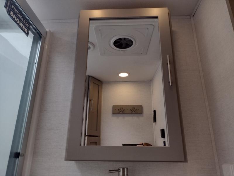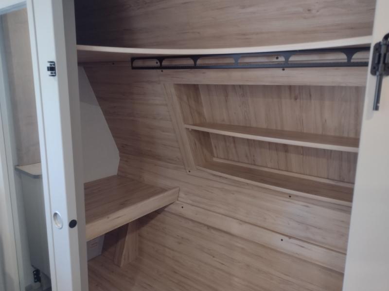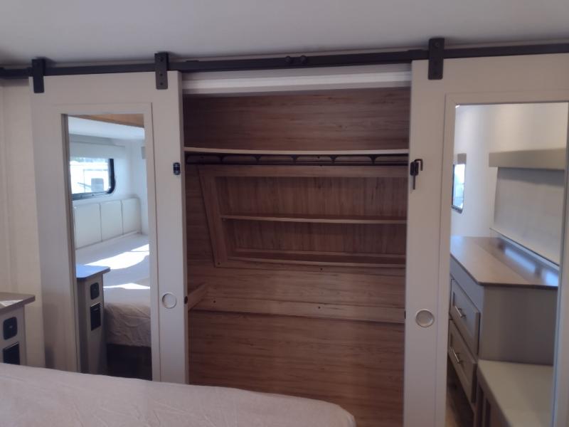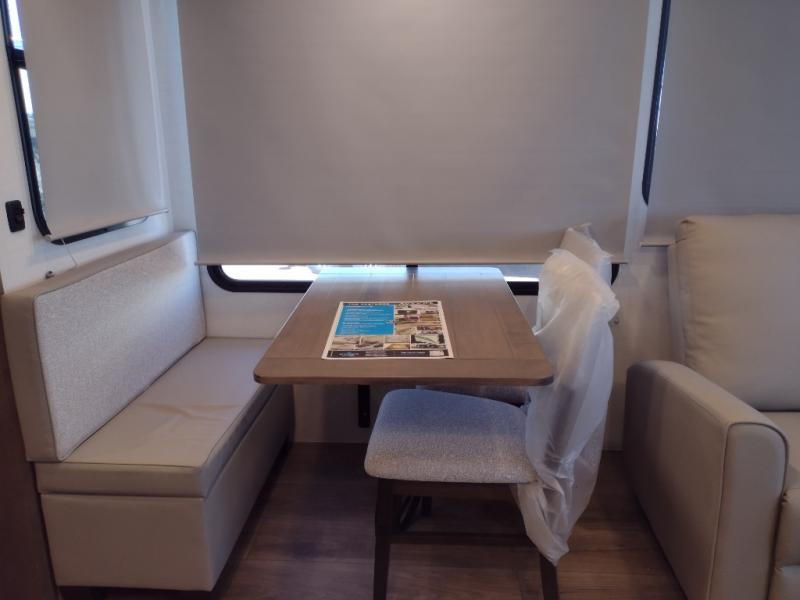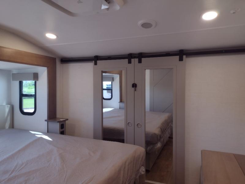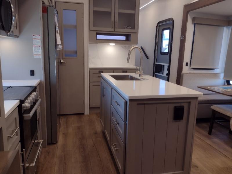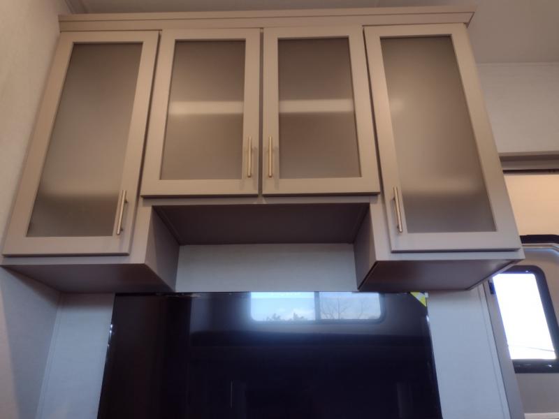 Life will be easy in this fifth wheel! The floating dinette table has two chairs on one side and a movable ottoman with flip up storage on the other side to keep your games or extra table cloths in. The kitchen island makes it easy to prepare a delicious home cooked meal. You can store your dishes and snacks inside the hutch/pantry or in the second pantry. The front private bedroom has a queen bed slide but can be switched out for the optional king bed if you like. There is also a dresser and large wardrobe for storage, and either side of the wardrobe with washer and dryer prep. The rear living area features a dual recliner theater seat across from an entertainment center with a 50" class HDTV with hidden storage behind it, and easy for all to see even at the rear sleeper sofa. Plus, you have a second bedroom with a slide that houses a sleeper sofa bunk and trundle across from a dresser with a 40" TV above it!
