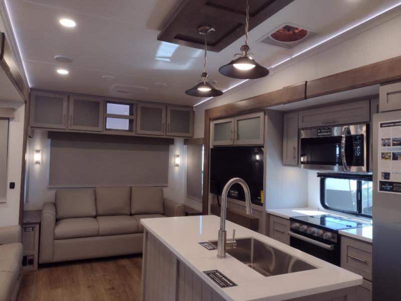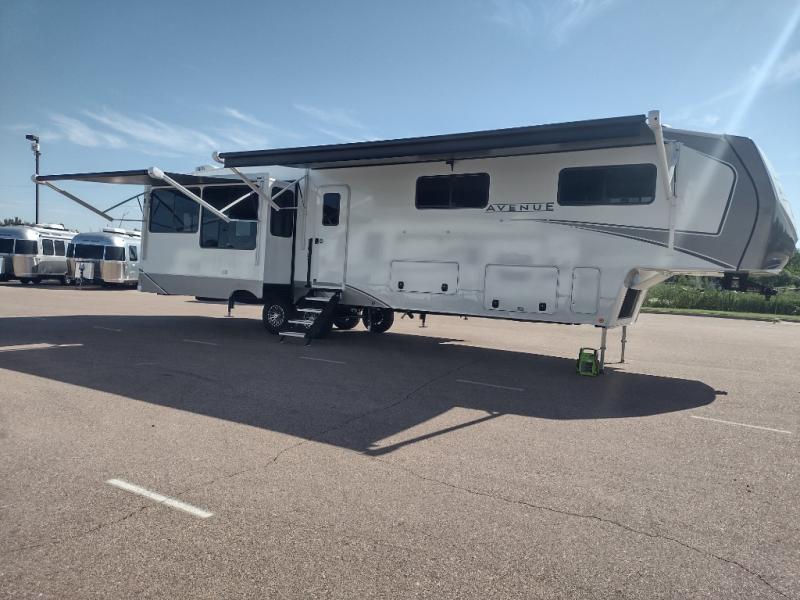 With any Avenue fifth wheel or travel trailer by Alliance RV, you will enjoy more interior space provided by the 8' 5" wide-body construction, and a long list of luxury features. Each is built with Azdel composite sidewalls both inside and out, along with a PVC roof for added strength. There are innovative storage solutions that include hidden storage behind the TV, within end tables and ottomans, and more. Since these units feature no carpet throughout, cleaning will be easier than ever, and there are flush floor slides throughout for seamless living spaces. The Avenue also comes with the OTG Solar Package with a 400 watt solar panel, inverter prep, multiple outlets, and more to keep you charged up!