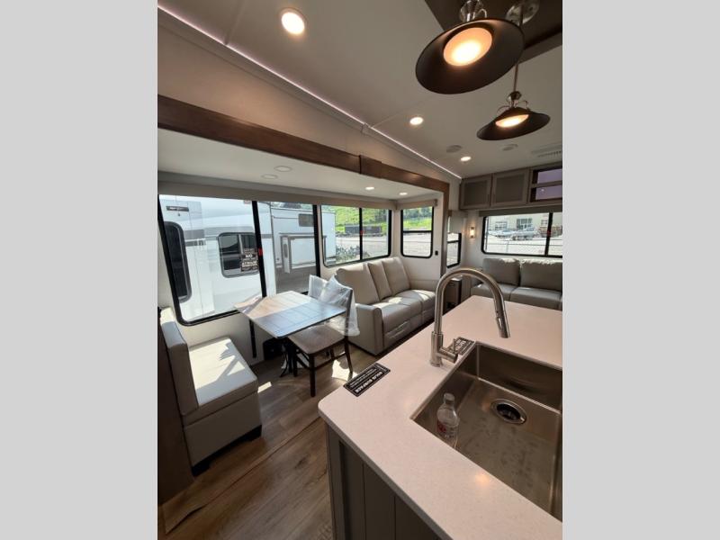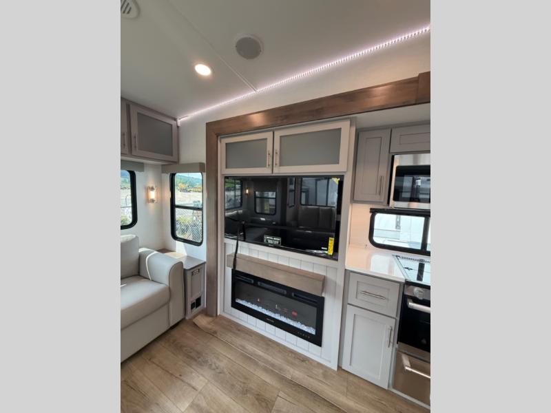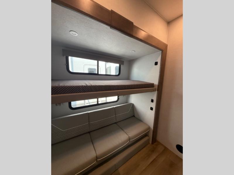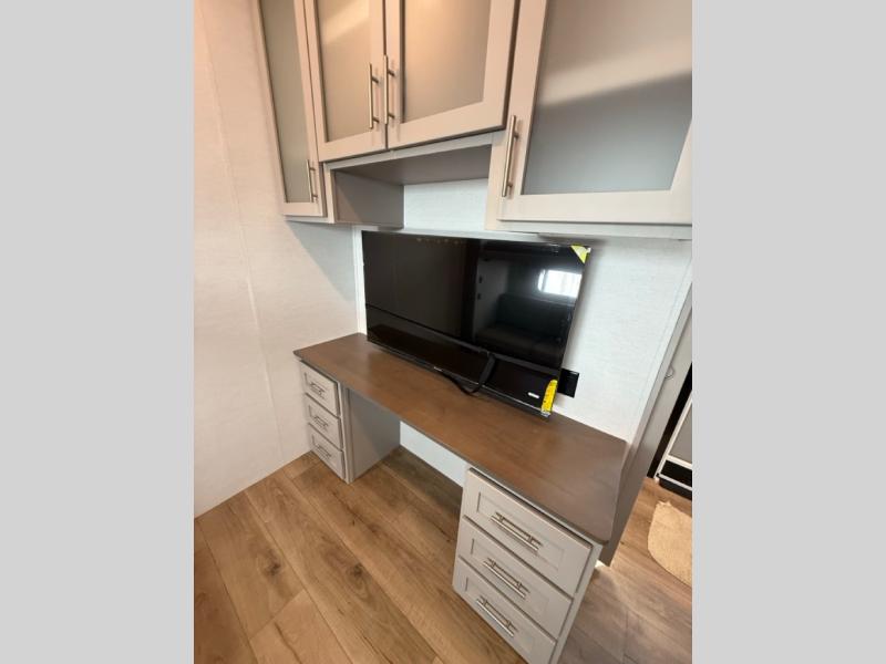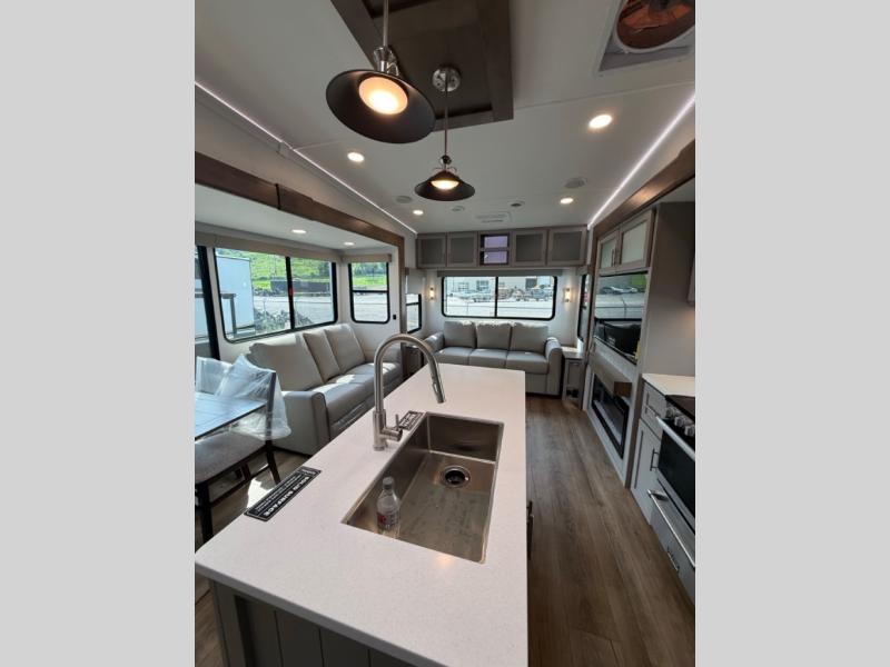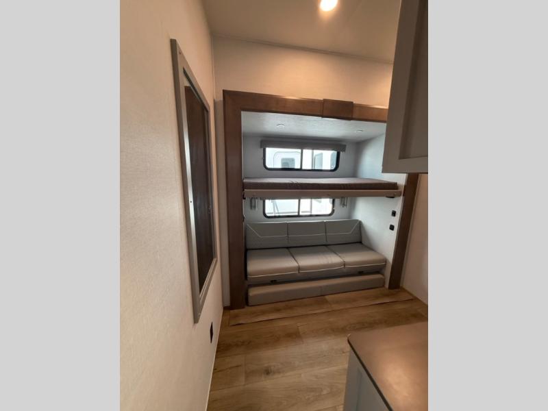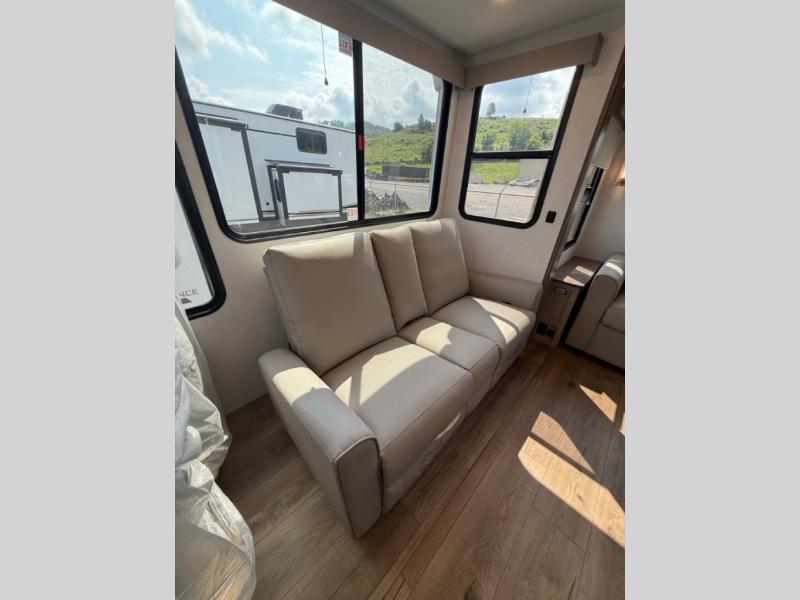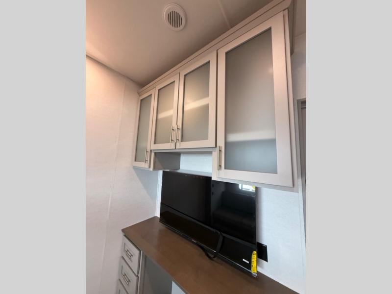 Life will be easy in this fifth wheel! The floating dinette table has two chairs on one side and a movable ottoman with flip up storage on the other side to keep your games or extra table cloths in. The kitchen island makes it easy to prepare a delicious home cooked meal. You can store your dishes and snacks inside the hutch/pantry or in the second pantry. The front private bedroom has a queen bed slide but can be switched out for the optional king bed if you like. There is also a dresser and large wardrobe for storage, and either side of the wardrobe with washer and dryer prep. The rear living area features a dual recliner theater seat across from an entertainment center with a 50" class HDTV with hidden storage behind it, and easy for all to see even at the rear sleeper sofa. Plus, you have a second bedroom with a slide that houses a sleeper sofa bunk and trundle across from a dresser with a 40" TV above it!