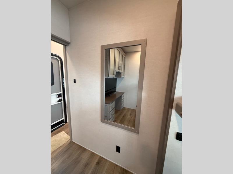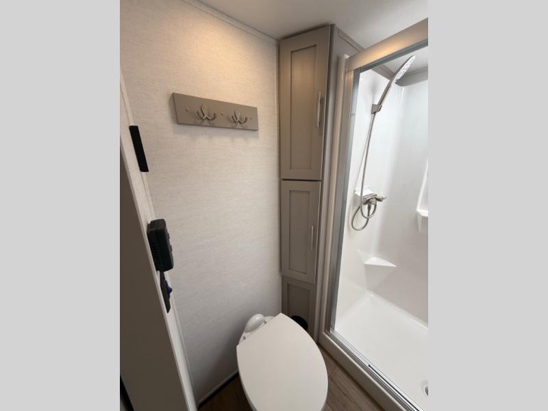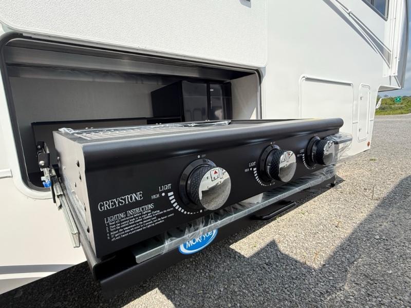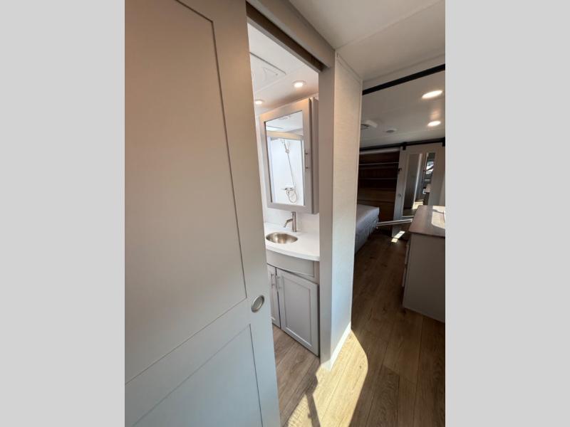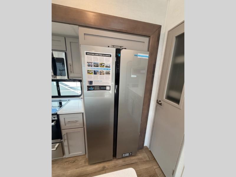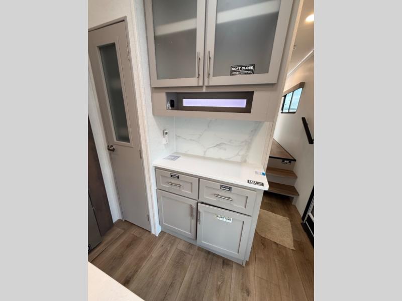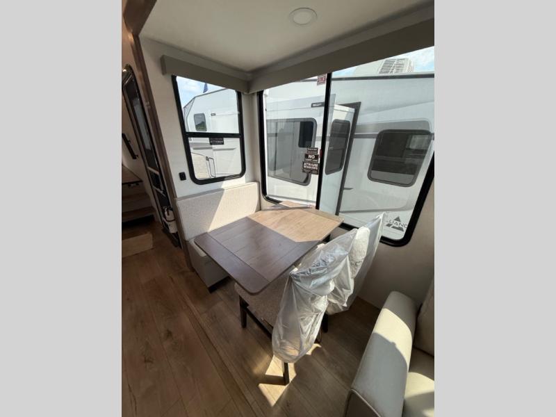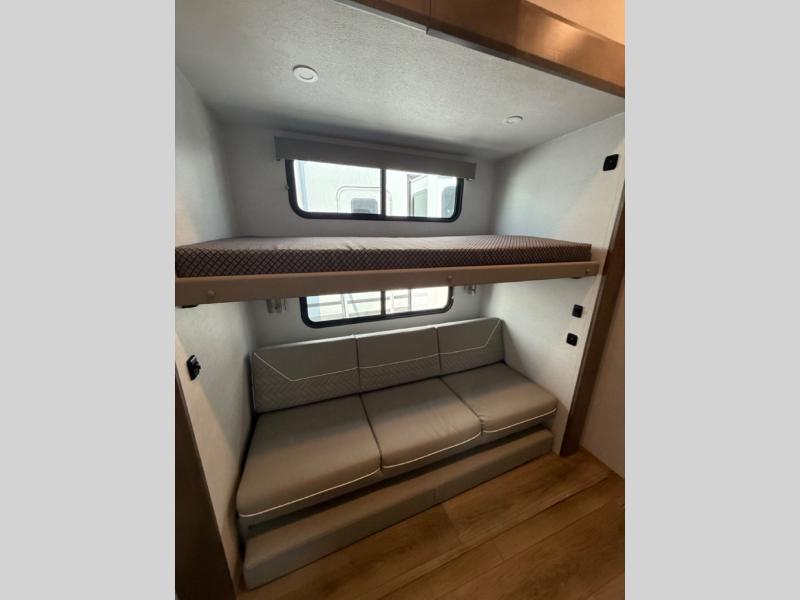 Life will be easy in this fifth wheel! The floating dinette table has two chairs on one side and a movable ottoman with flip up storage on the other side to keep your games or extra table cloths in. The kitchen island makes it easy to prepare a delicious home cooked meal. You can store your dishes and snacks inside the hutch/pantry or in the second pantry. The front private bedroom has a queen bed slide but can be switched out for the optional king bed if you like. There is also a dresser and large wardrobe for storage, and either side of the wardrobe with washer and dryer prep. The rear living area features a dual recliner theater seat across from an entertainment center with a 50" class HDTV with hidden storage behind it, and easy for all to see even at the rear sleeper sofa. Plus, you have a second bedroom with a slide that houses a sleeper sofa bunk and trundle across from a dresser with a 40" TV above it!