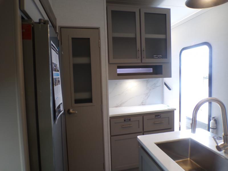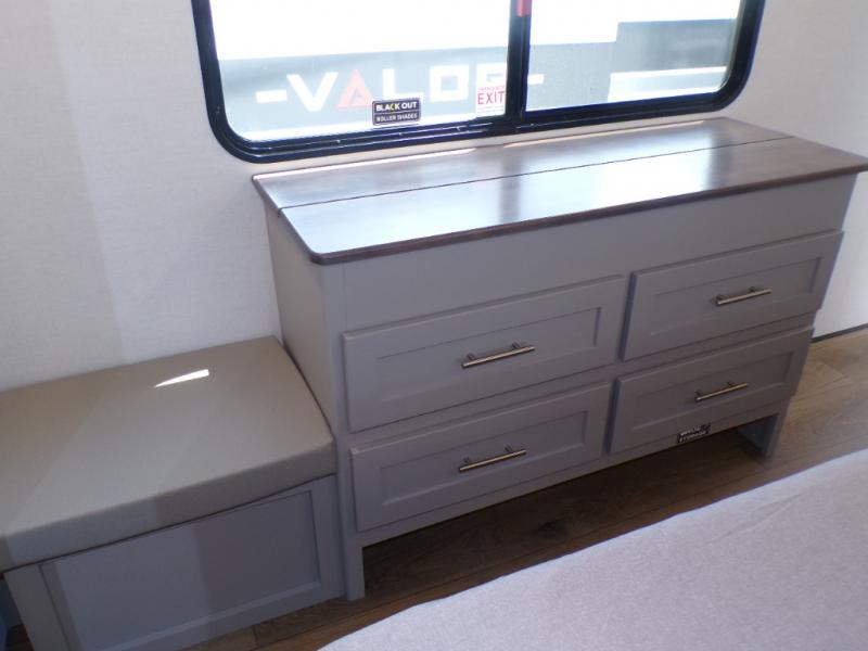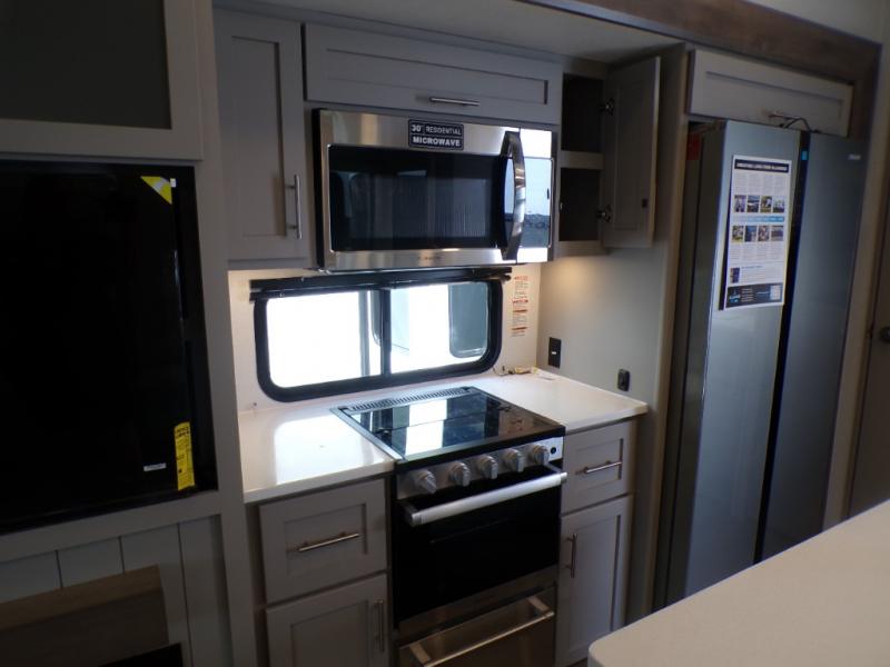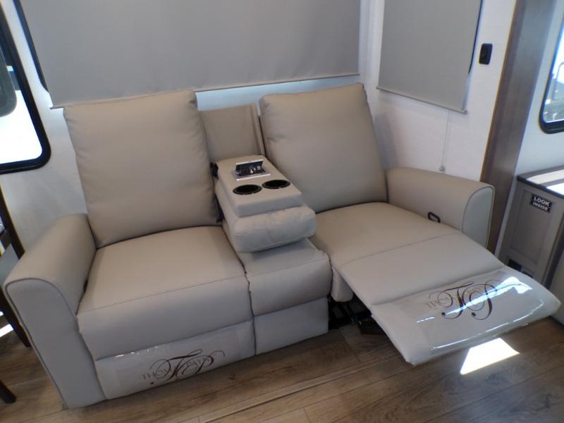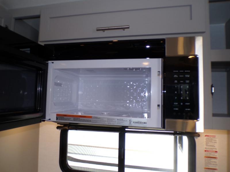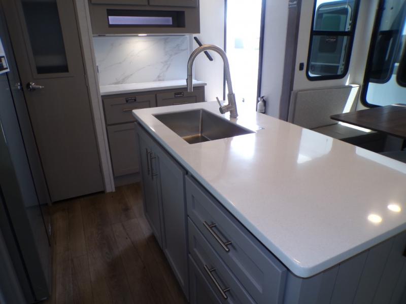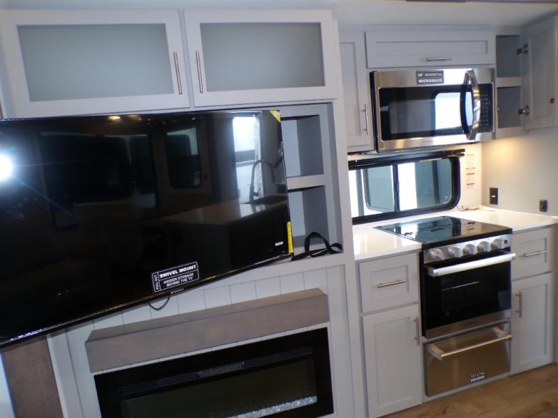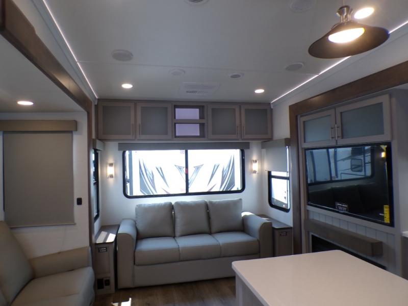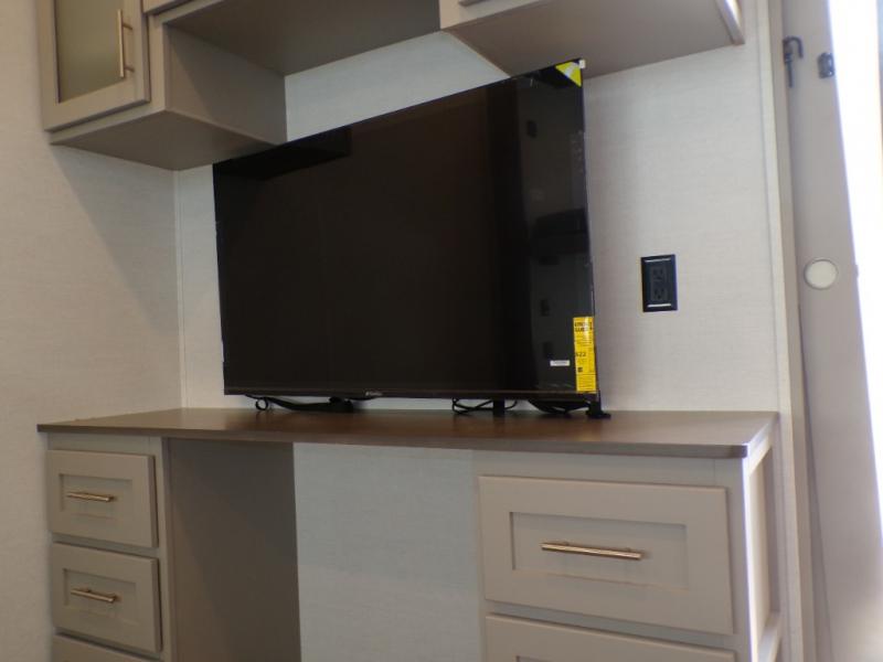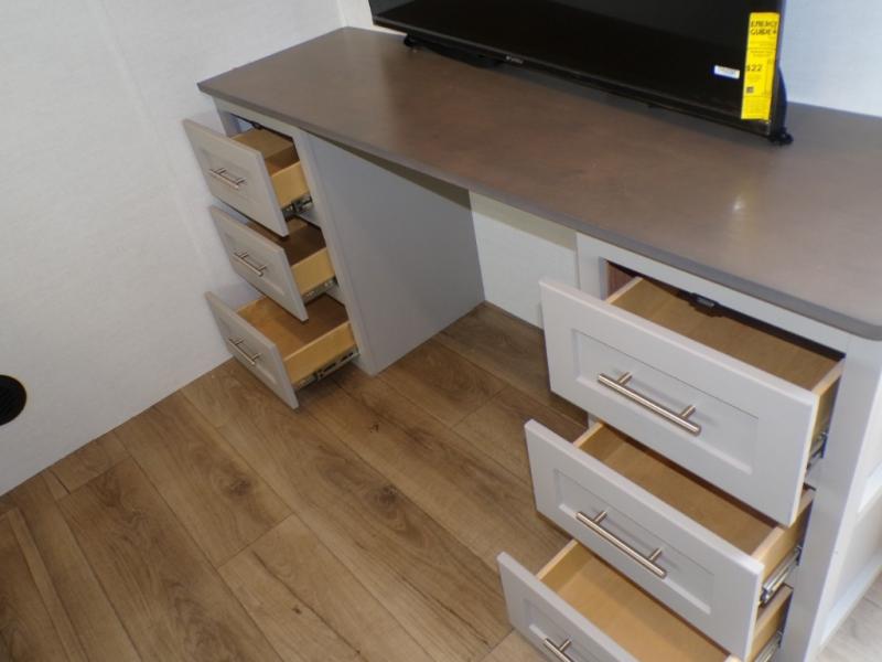 Life will be easy in this fifth wheel! The floating dinette table has two chairs on one side and a movable ottoman with flip up storage on the other side to keep your games or extra table cloths in. The kitchen island makes it easy to prepare a delicious home cooked meal. You can store your dishes and snacks inside the hutch/pantry or in the second pantry. The front private bedroom has a queen bed slide but can be switched out for the optional king bed if you like. There is also a dresser and large wardrobe for storage, and either side of the wardrobe with washer and dryer prep. The rear living area features a dual recliner theater seat across from an entertainment center with a 50" class HDTV with hidden storage behind it, and easy for all to see even at the rear sleeper sofa. Plus, you have a second bedroom with a slide that houses a sleeper sofa bunk and trundle across from a dresser with a 40" TV above it!