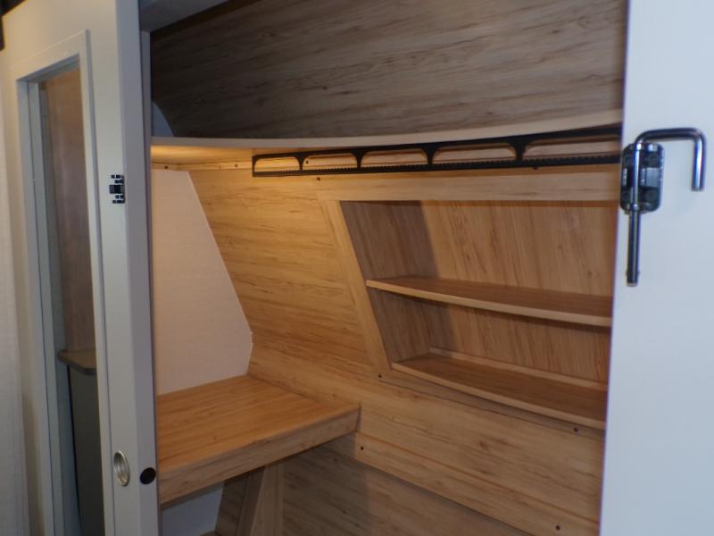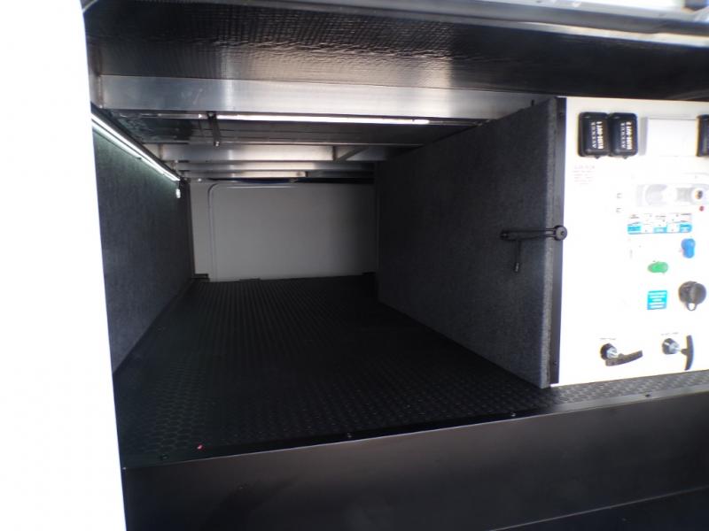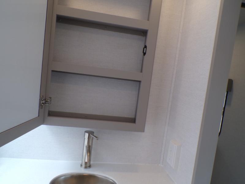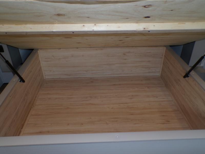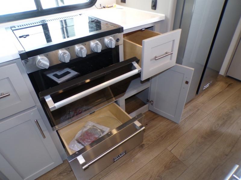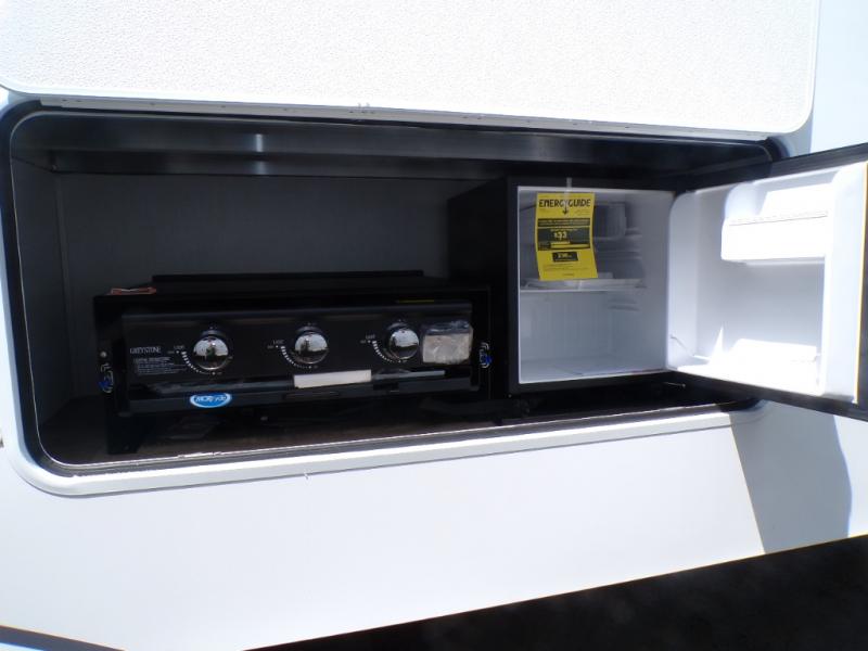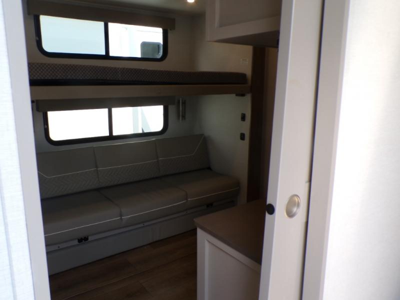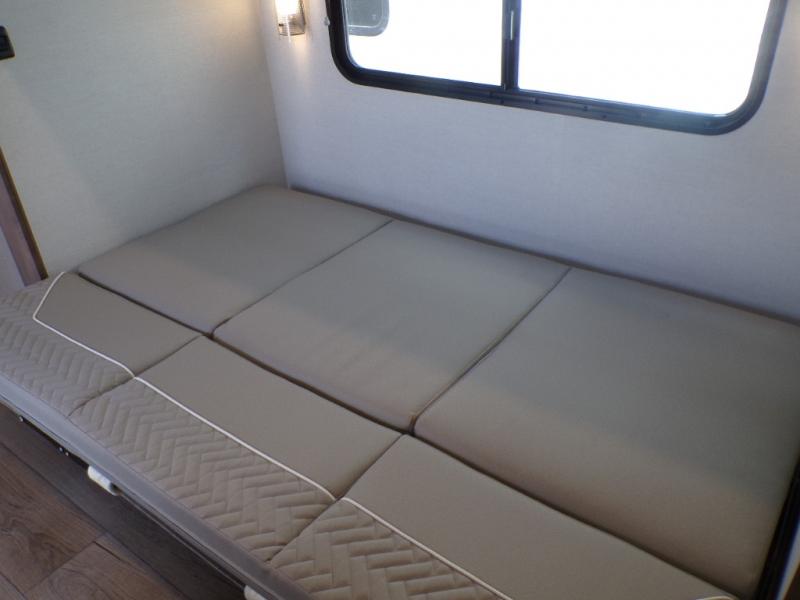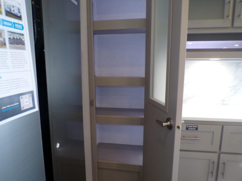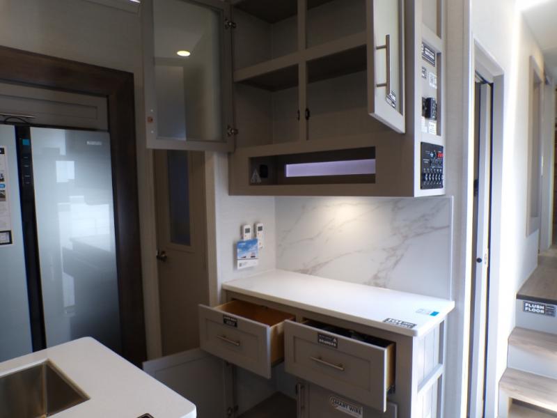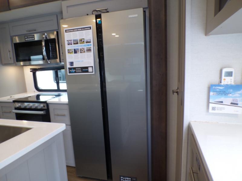 Life will be easy in this fifth wheel! The floating dinette table has two chairs on one side and a movable ottoman with flip up storage on the other side to keep your games or extra table cloths in. The kitchen island makes it easy to prepare a delicious home cooked meal. You can store your dishes and snacks inside the hutch/pantry or in the second pantry. The front private bedroom has a queen bed slide but can be switched out for the optional king bed if you like. There is also a dresser and large wardrobe for storage, and either side of the wardrobe with washer and dryer prep. The rear living area features a dual recliner theater seat across from an entertainment center with a 50" class HDTV with hidden storage behind it, and easy for all to see even at the rear sleeper sofa. Plus, you have a second bedroom with a slide that houses a sleeper sofa bunk and trundle across from a dresser with a 40" TV above it!
