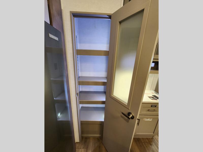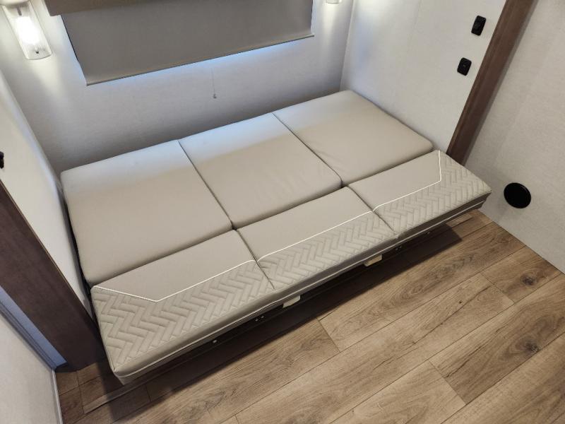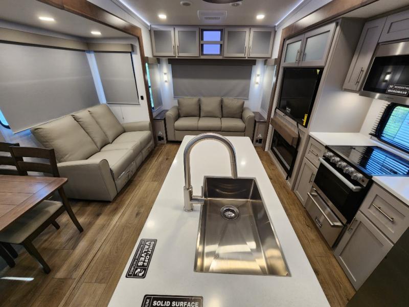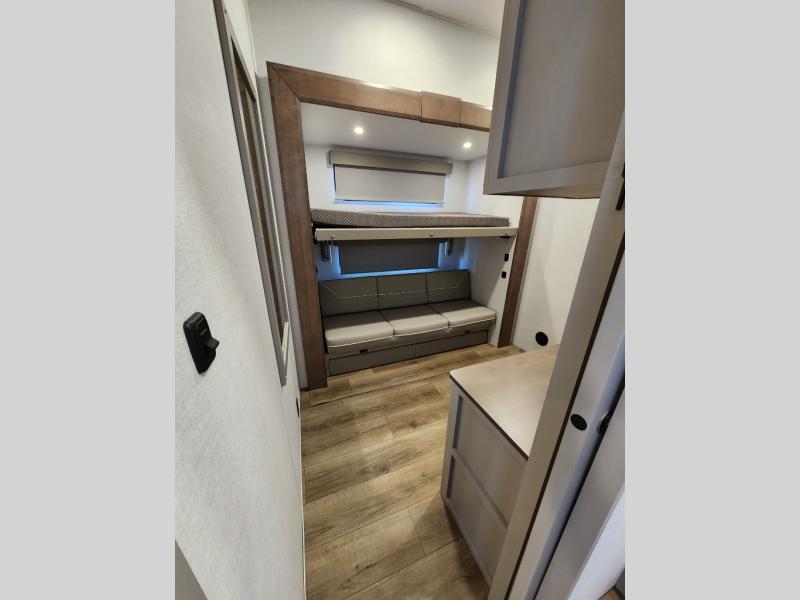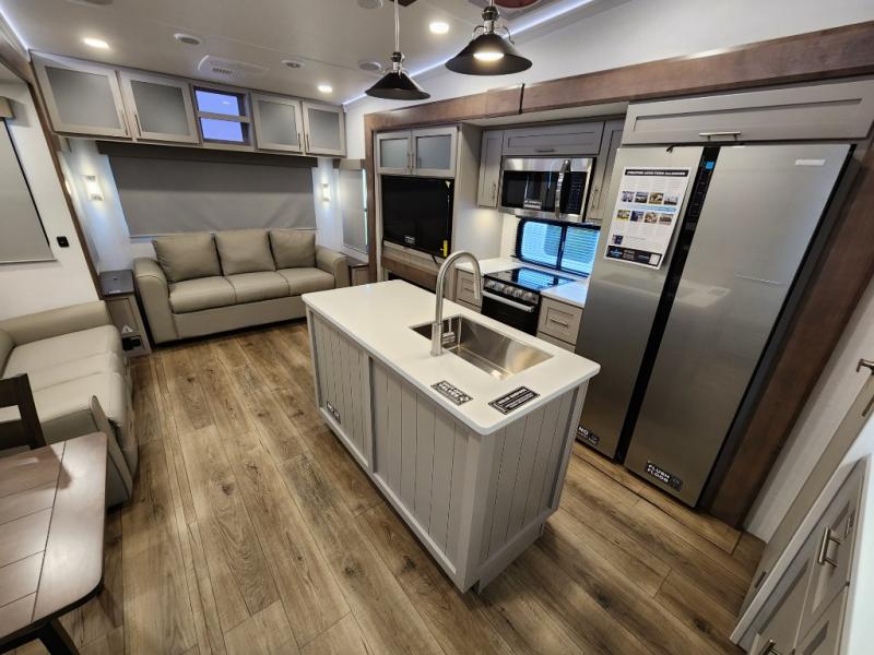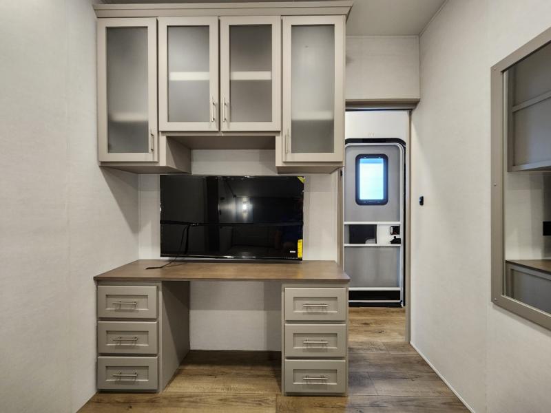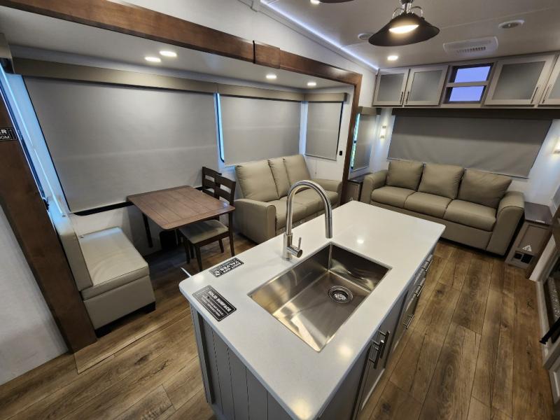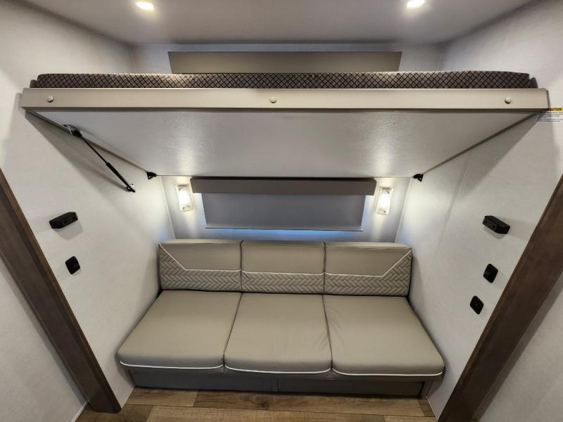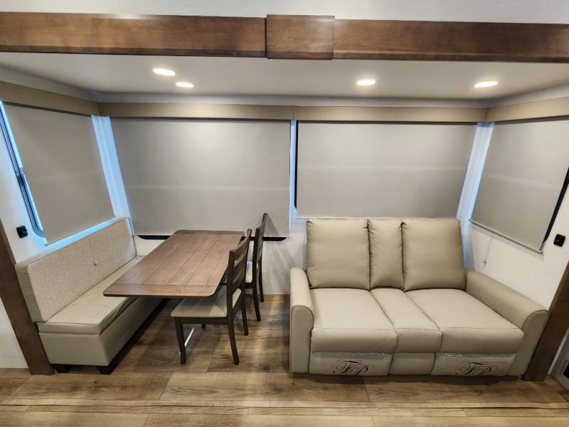 Life will be easy in this fifth wheel! The floating dinette table has two chairs on one side and a movable ottoman with flip up storage on the other side to keep your games or extra table cloths in. The kitchen island makes it easy to prepare a delicious home cooked meal. You can store your dishes and snacks inside the hutch/pantry or in the second pantry. The front private bedroom has a queen bed slide but can be switched out for the optional king bed if you like. There is also a dresser and large wardrobe for storage, and either side of the wardrobe with washer and dryer prep. The rear living area features a dual recliner theater seat across from an entertainment center with a 50" class HDTV with hidden storage behind it, and easy for all to see even at the rear sleeper sofa. Plus, you have a second bedroom with a slide that houses a sleeper sofa bunk and trundle across from a dresser with a 40" TV above it!