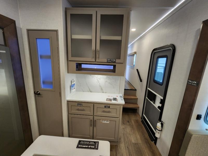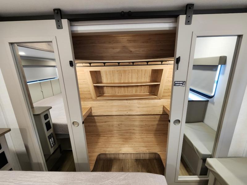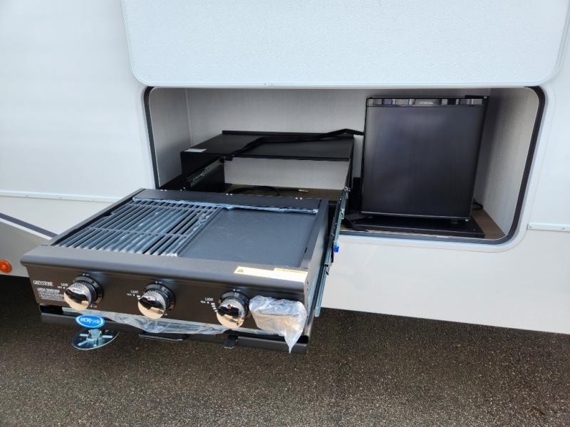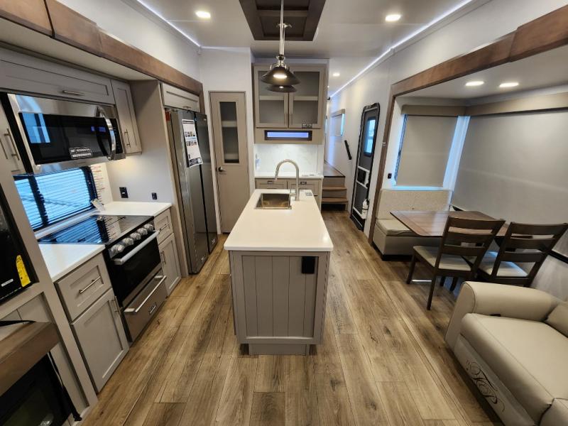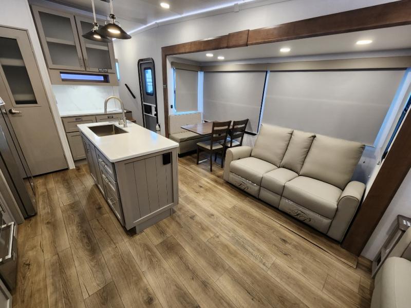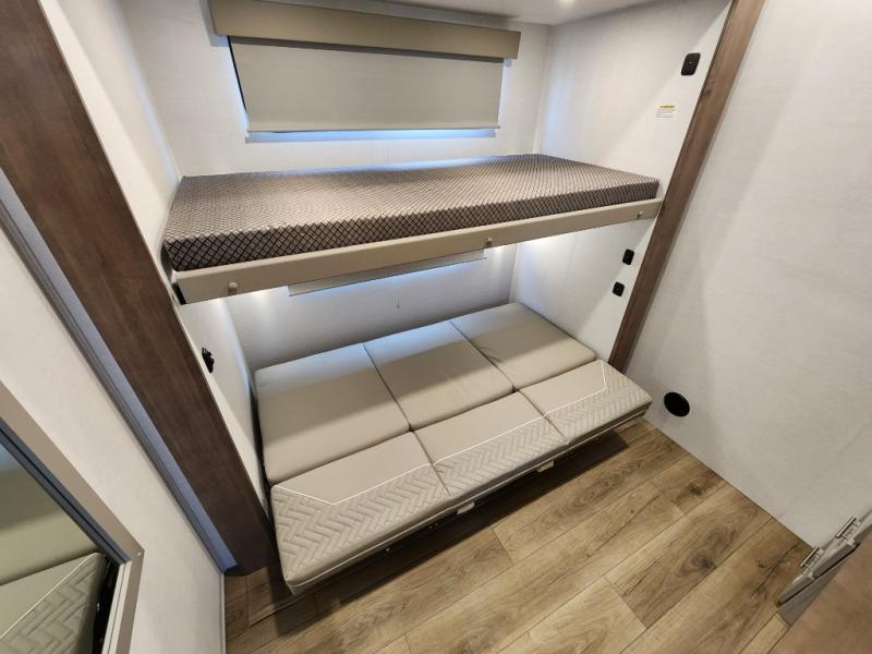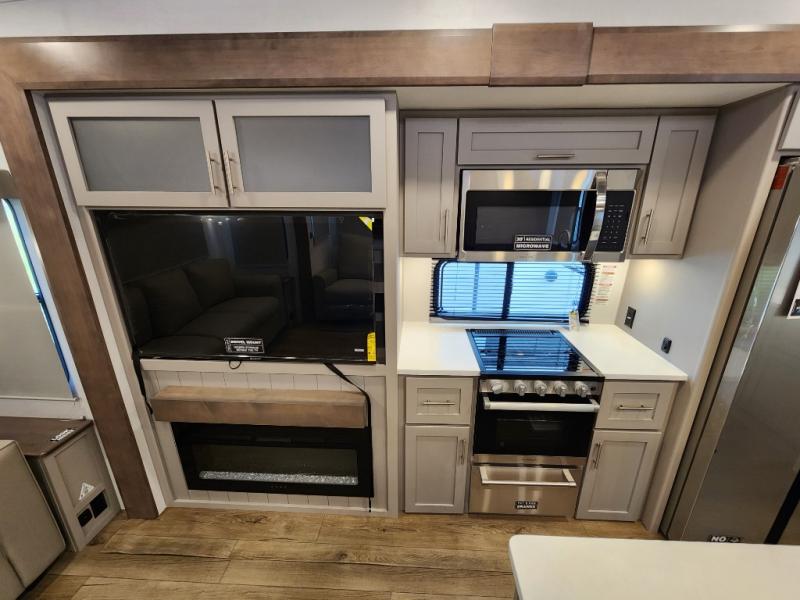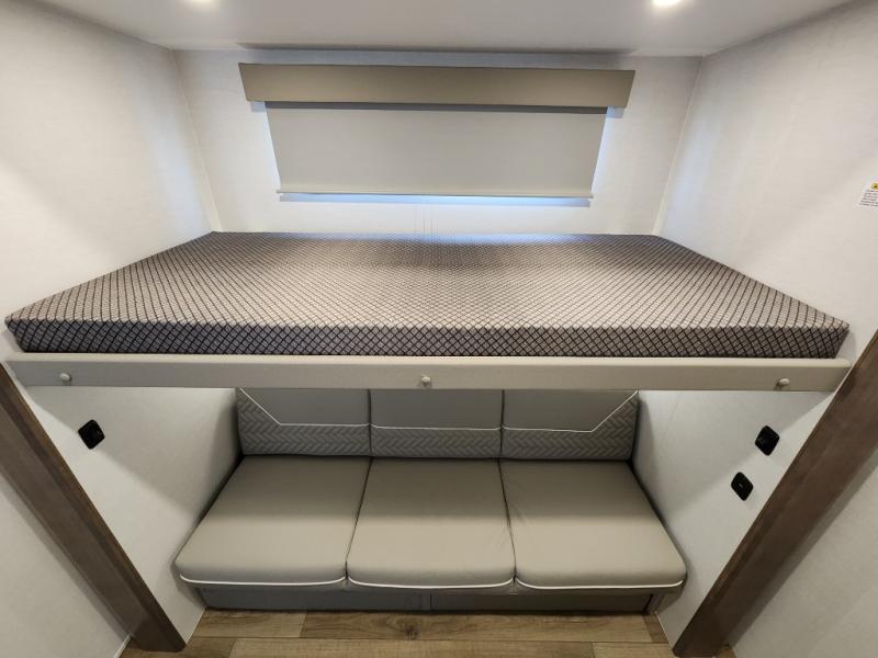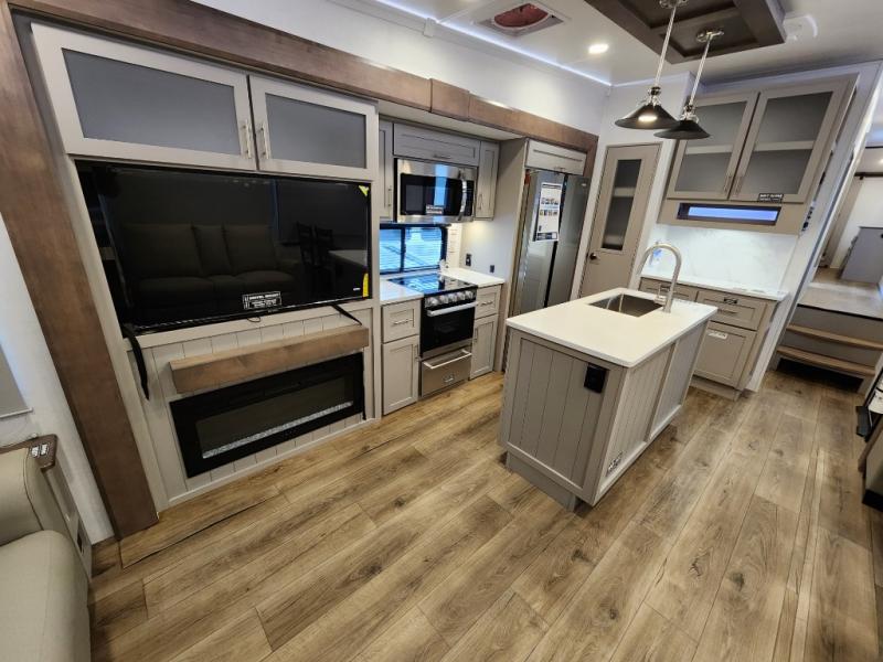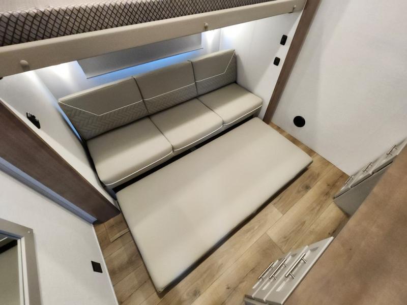Life will be easy in this fifth wheel! The floating dinette table has two chairs on one side and a movable ottoman with flip up storage on the other side to keep your games or extra table cloths in. The kitchen island makes it easy to prepare a delicious home cooked meal. You can store your dishes and snacks inside the hutch/pantry or in the second pantry. The front private bedroom has a queen bed slide but can be switched out for the optional king bed if you like. There is also a dresser and large wardrobe for storage, and either side of the wardrobe with washer and dryer prep. The rear living area features a dual recliner theater seat across from an entertainment center with a 50" class HDTV with hidden storage behind it, and easy for all to see even at the rear sleeper sofa. Plus, you have a second bedroom with a slide that houses a sleeper sofa bunk and trundle across from a dresser with a 40" TV above it!