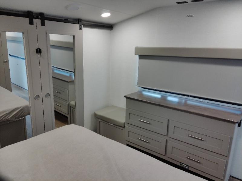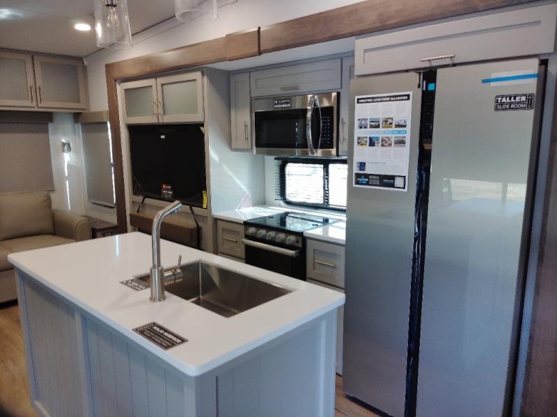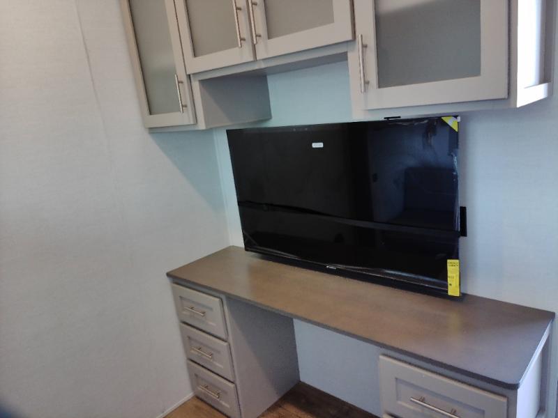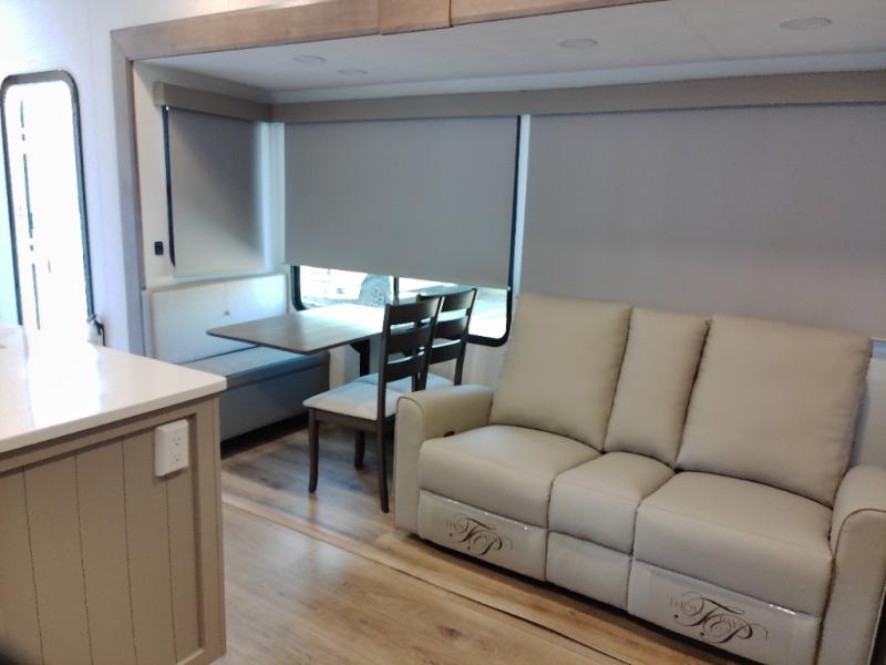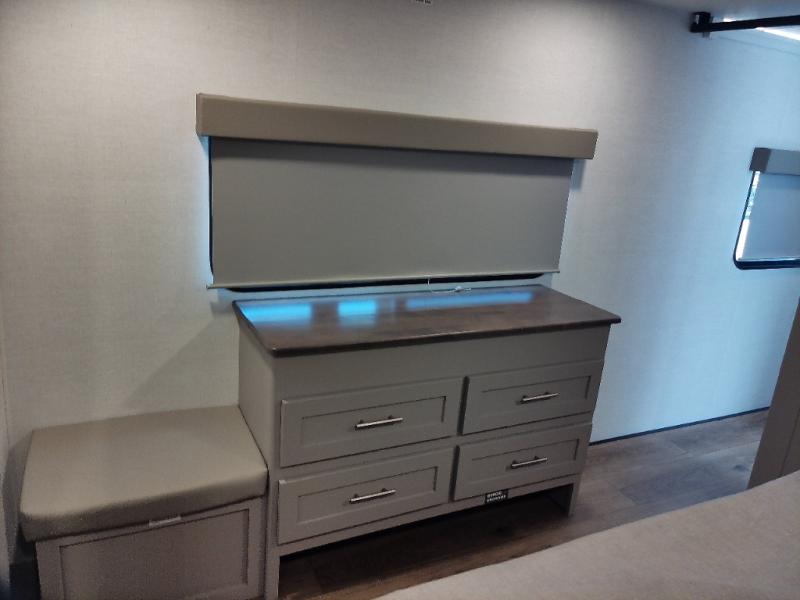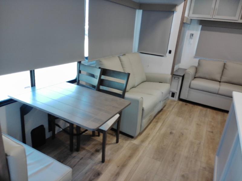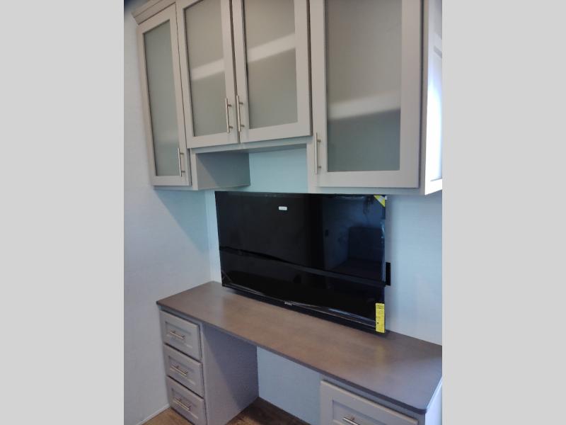 Life will be easy in this fifth wheel! The floating dinette table has two chairs on one side and a movable ottoman with flip up storage on the other side to keep your games or extra table cloths in. The kitchen island makes it easy to prepare a delicious home cooked meal. You can store your dishes and snacks inside the hutch/pantry or in the second pantry. The front private bedroom has a queen bed slide but can be switched out for the optional king bed if you like. There is also a dresser and large wardrobe for storage, and either side of the wardrobe with washer and dryer prep. The rear living area features a dual recliner theater seat across from an entertainment center with a 50" class HDTV with hidden storage behind it, and easy for all to see even at the rear sleeper sofa. Plus, you have a second bedroom with a slide that houses a sleeper sofa bunk and trundle across from a dresser with a 40" TV above it!