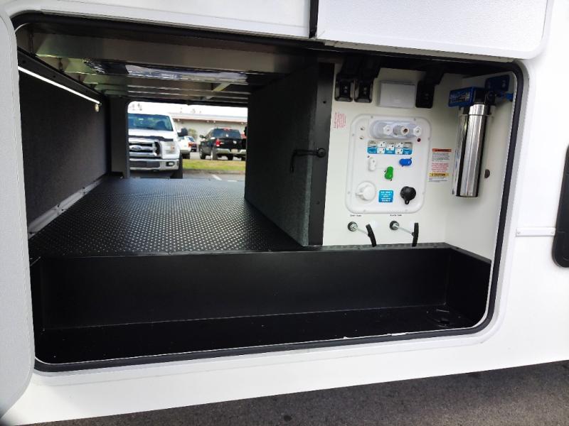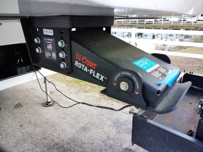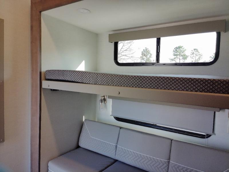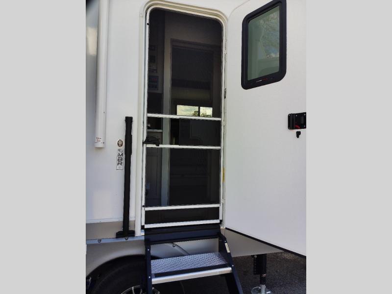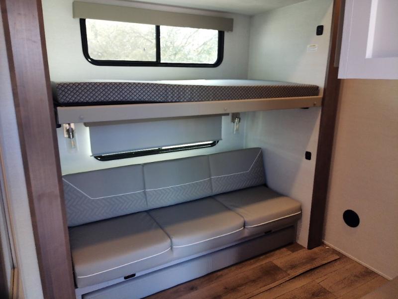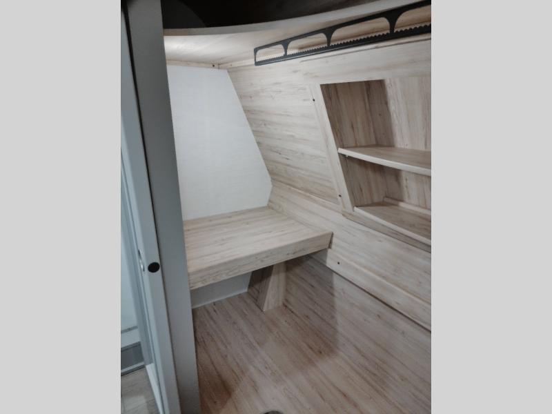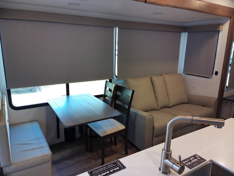 Life will be easy in this fifth wheel! The floating dinette table has two chairs on one side and a movable ottoman with flip up storage on the other side to keep your games or extra table cloths in. The kitchen island makes it easy to prepare a delicious home cooked meal. You can store your dishes and snacks inside the hutch/pantry or in the second pantry. The front private bedroom has a queen bed slide but can be switched out for the optional king bed if you like. There is also a dresser and large wardrobe for storage, and either side of the wardrobe with washer and dryer prep. The rear living area features a dual recliner theater seat across from an entertainment center with a 50" class HDTV with hidden storage behind it, and easy for all to see even at the rear sleeper sofa. Plus, you have a second bedroom with a slide that houses a sleeper sofa bunk and trundle across from a dresser with a 40" TV above it!