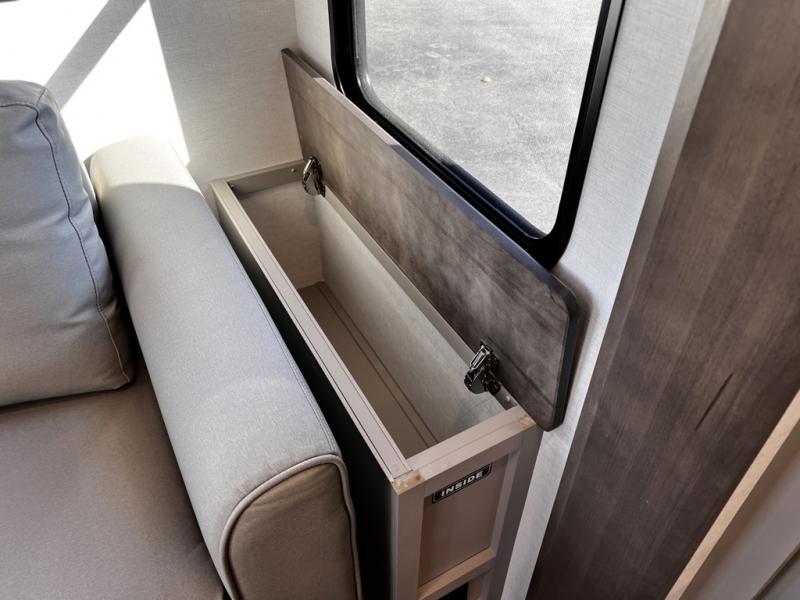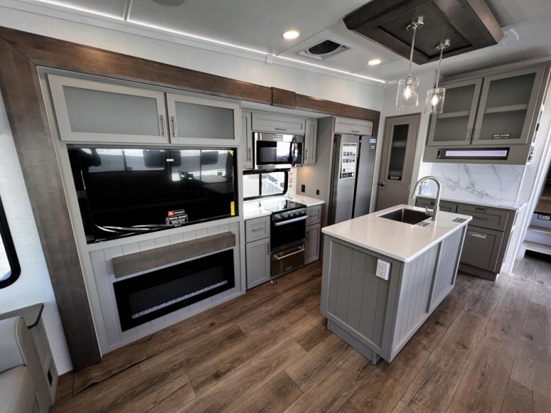 Life will be easy in this fifth wheel! The floating dinette table has two chairs on one side and a movable ottoman with flip up storage on the other side to keep your games or extra table cloths in. The kitchen island makes it easy to prepare a delicious home cooked meal. You can store your dishes and snacks inside the hutch/pantry or in the second pantry. The front private bedroom has a queen bed slide but can be switched out for the optional king bed if you like. There is also a dresser and large wardrobe for storage, and either side of the wardrobe with washer and dryer prep. The rear living area features a dual recliner theater seat across from an entertainment center with a 50" class HDTV with hidden storage behind it, and easy for all to see even at the rear sleeper sofa. Plus, you have a second bedroom with a slide that houses a sleeper sofa bunk and trundle across from a dresser with a 40" TV above it!