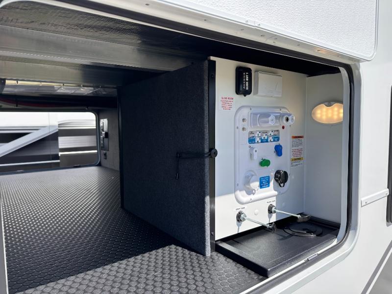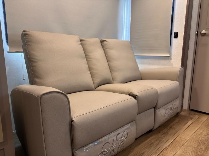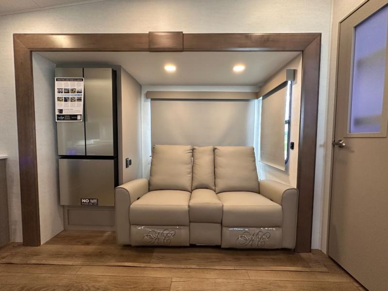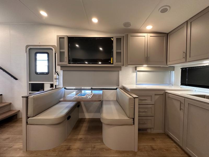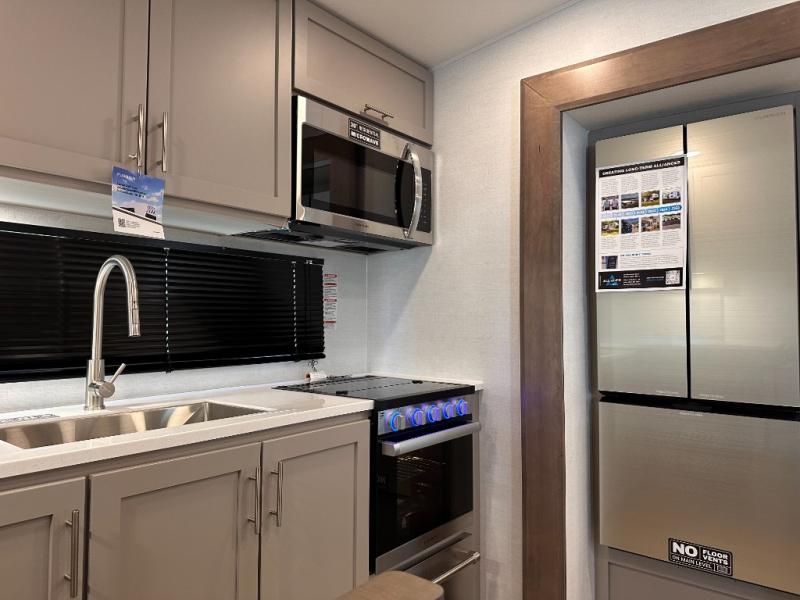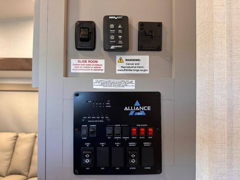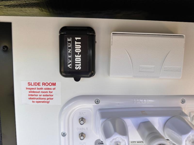 A benchmark chassis creates a space saver upper deck with each one of these Avenue All-Access fifth wheels by Alliance RV! The 101 in. wide-body construction gives you more room to walk around and the flush slide out floors throughout prevent any tripping. There are Azdel composite sidewalls inside and out, and a seamless fully walkable PVC roof for extreme durability and zero maintenance. You are sure to love no carpet throughout making each Avenue All-Access easy to clean and allergen free, not to mention pet friendly. You can maximize your space throughout with innovative storage solutions like the hidden storage behind the TV, inside the end tables, ottoman, and dinette chairs. These units also include the OTG Solar Package with a 200 watt solar panel, 15 amp MPPT charger, multiple outlets, and more to keep you powered up!