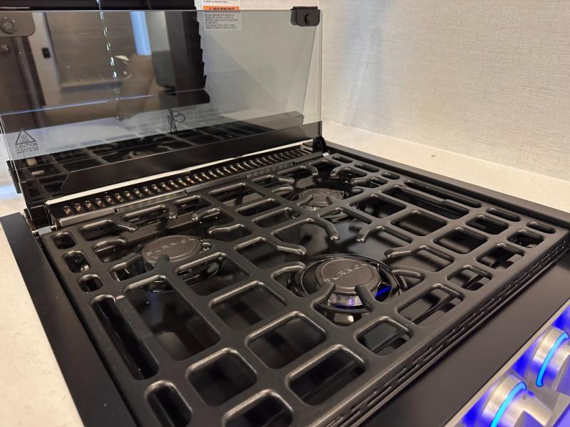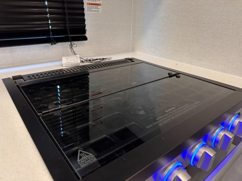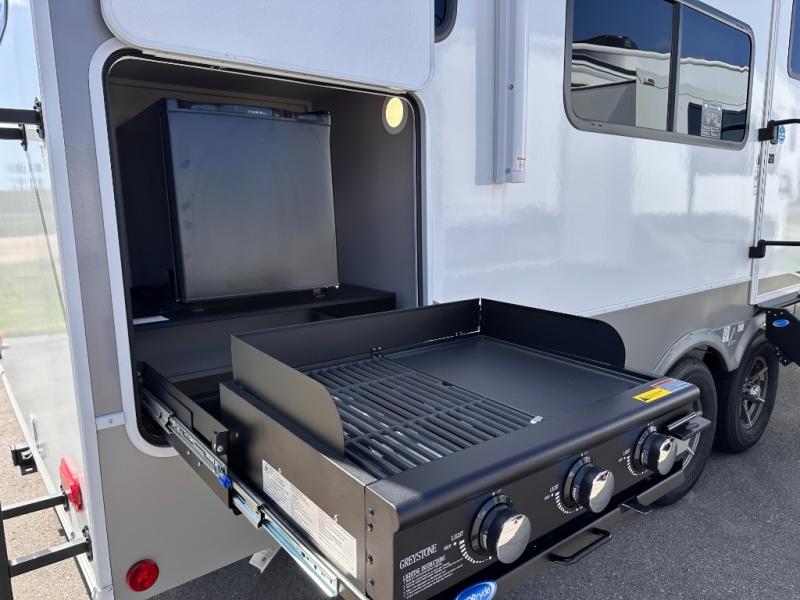 This fifth wheel is ready for adventure when you are! Once you arrive at the campground, you can put out the 16' awning, then start lunch on the exterior griddle. A booth dinette and theater sofa provide seating space inside, and there is a 50" Class HDTV to enjoy movies. The chef will also love the interior kitchen with its ample counter space, and there is plenty of storage with a hutch/pantry, second pantry, and 10 cu. ft. 12V refrigerator. Freshen up in the full bath before heading off to bed in the front private bedroom. Here, you'll find a queen bed, dual nightstands and overhead storage, plus a wardrobe with washer and dryer prep if you choose to add those appliances!