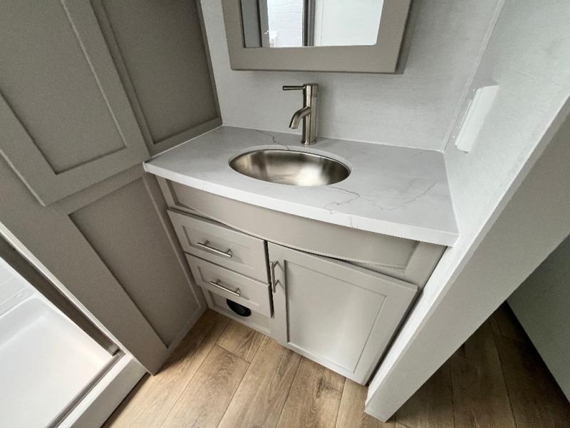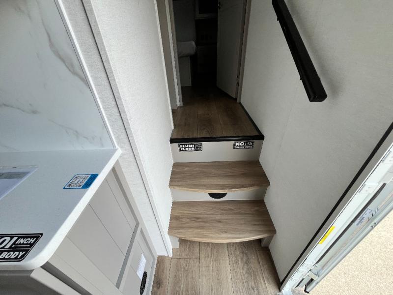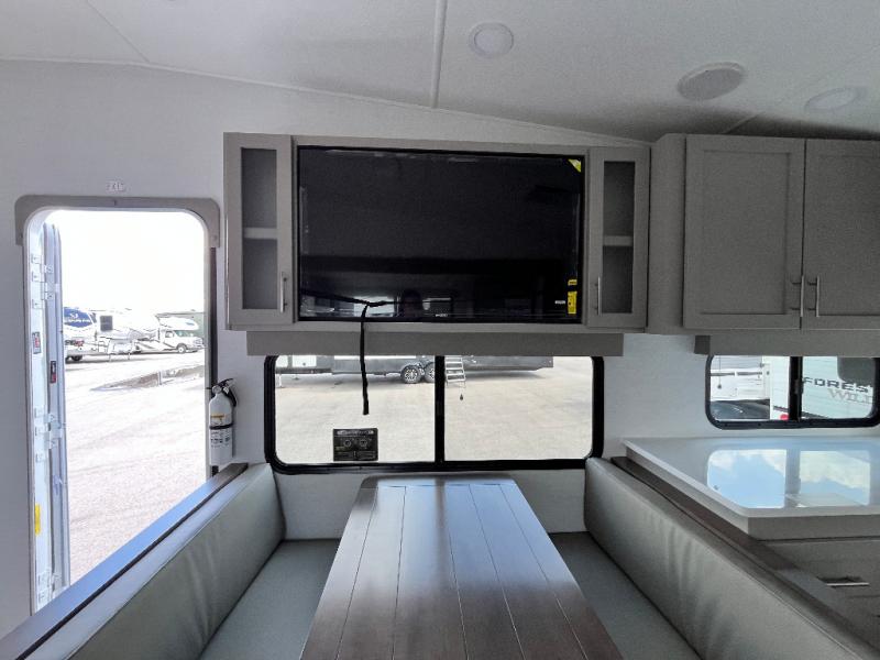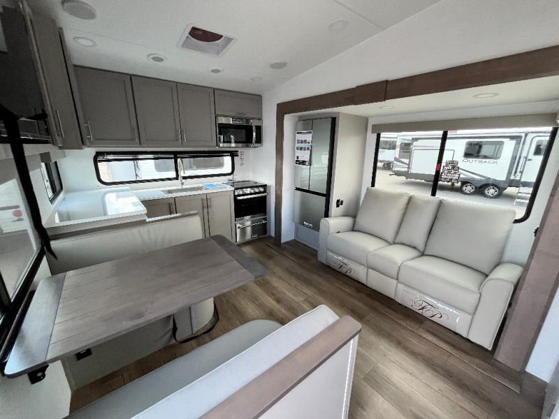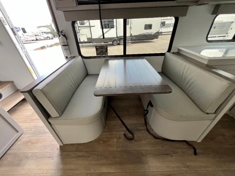 A benchmark chassis creates a space saver upper deck with each one of these Avenue All-Access fifth wheels by Alliance RV! The 101 in. wide-body construction gives you more room to walk around and the flush slide out floors throughout prevent any tripping. There are Azdel composite sidewalls inside and out, and a seamless fully walkable PVC roof for extreme durability and zero maintenance. You are sure to love no carpet throughout making each Avenue All-Access easy to clean and allergen free, not to mention pet friendly. You can maximize your space throughout with innovative storage solutions like the hidden storage behind the TV, inside the end tables, ottoman, and dinette chairs. These units also include the OTG Solar Package with a 200 watt solar panel, 15 amp MPPT charger, multiple outlets, and more to keep you powered up!