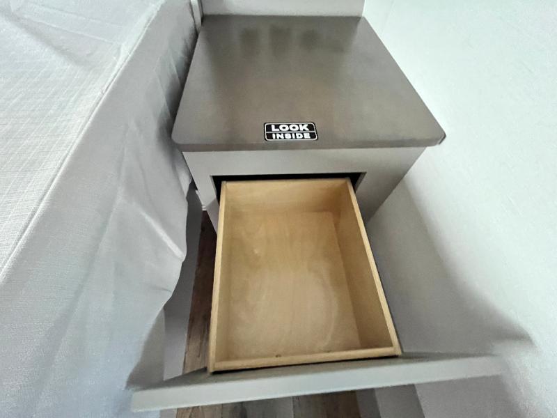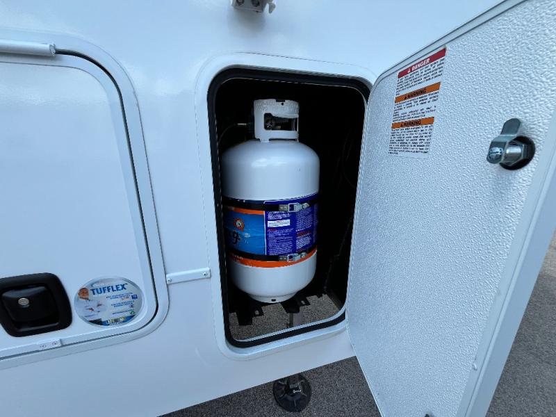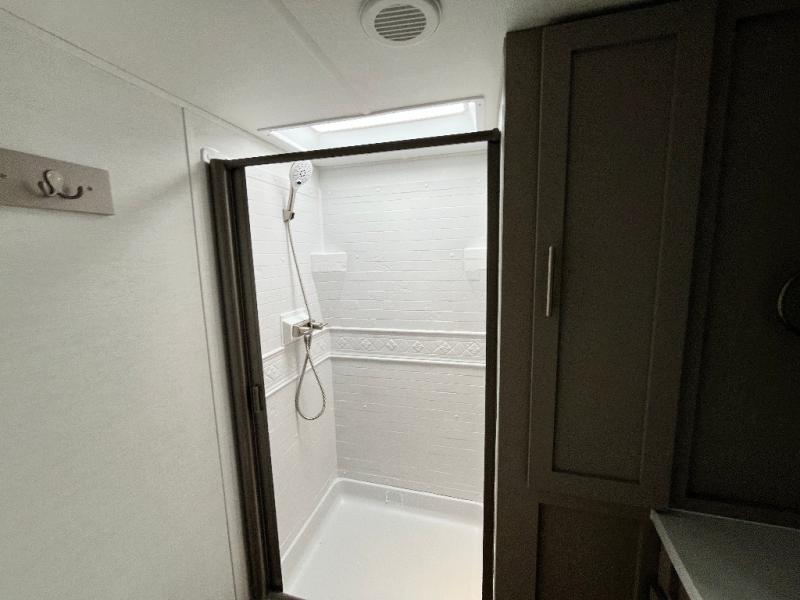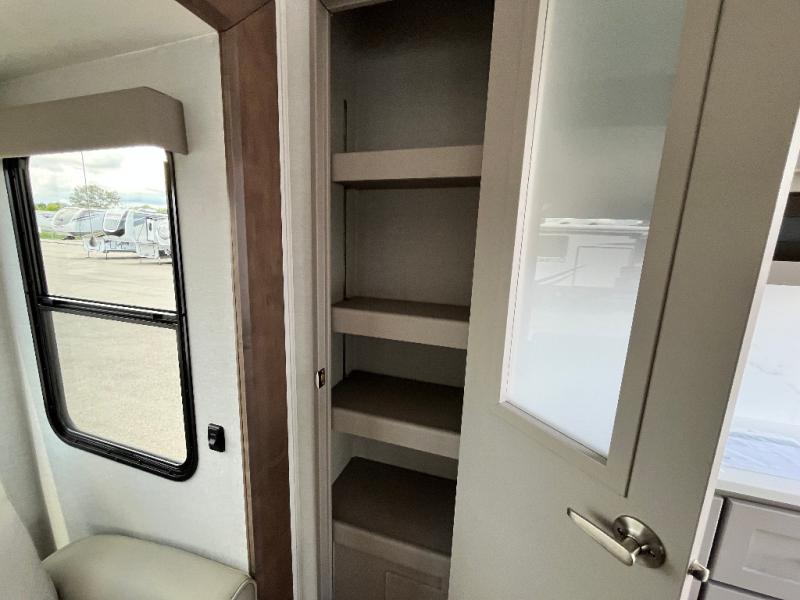 This fifth wheel is ready for adventure when you are! Once you arrive at the campground, you can put out the 16' awning, then start lunch on the exterior griddle. A booth dinette and theater sofa provide seating space inside, and there is a 50" Class HDTV to enjoy movies. The chef will also love the interior kitchen with its ample counter space, and there is plenty of storage with a hutch/pantry, second pantry, and 10 cu. ft. 12V refrigerator. Freshen up in the full bath before heading off to bed in the front private bedroom. Here, you'll find a queen bed, dual nightstands and overhead storage, plus a wardrobe with washer and dryer prep if you choose to add those appliances!