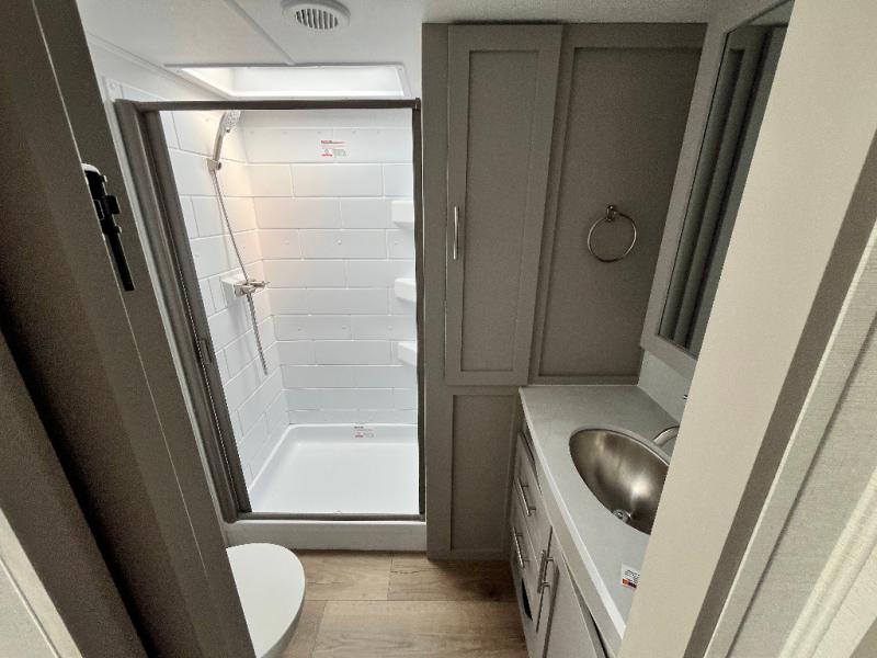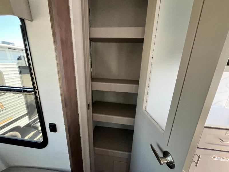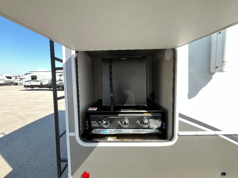 This fifth wheel is ready for adventure when you are! Once you arrive at the campground, you can put out the 16' awning, then start lunch on the exterior griddle. A booth dinette and theater sofa provide seating space inside, and there is a 50" Class HDTV to enjoy movies. The chef will also love the interior kitchen with its ample counter space, and there is plenty of storage with a hutch/pantry, second pantry, and 10 cu. ft. 12V refrigerator. Freshen up in the full bath before heading off to bed in the front private bedroom. Here, you'll find a queen bed, dual nightstands and overhead storage, plus a wardrobe with washer and dryer prep if you choose to add those appliances!