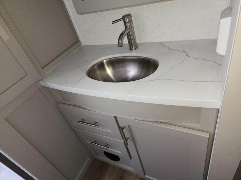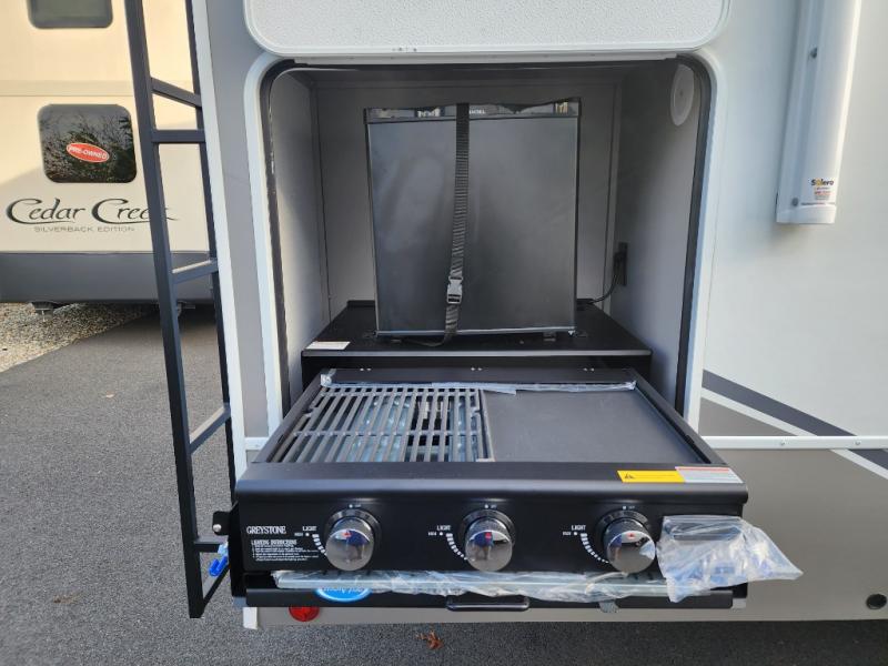 This fifth wheel is ready for adventure when you are! Once you arrive at the campground, you can put out the 16' awning, then start lunch on the exterior griddle. A booth dinette and theater sofa provide seating space inside, and there is a 50" Class HDTV to enjoy movies. The chef will also love the interior kitchen with its ample counter space, and there is plenty of storage with a hutch/pantry, second pantry, and 10 cu. ft. 12V refrigerator. Freshen up in the full bath before heading off to bed in the front private bedroom. Here, you'll find a queen bed, dual nightstands and overhead storage, plus a wardrobe with washer and dryer prep if you choose to add those appliances!