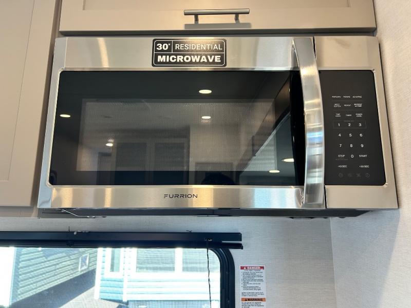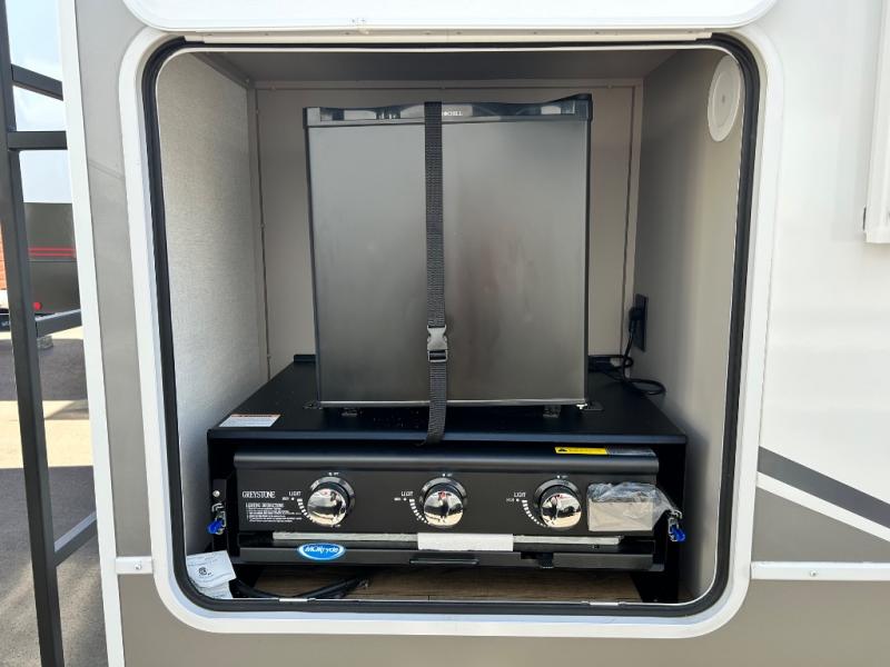 This fifth wheel is ready for adventure when you are! Once you arrive at the campground, you can put out the 16' awning, then start lunch on the exterior griddle. A booth dinette and theater sofa provide seating space inside, and there is a 50" Class HDTV to enjoy movies. The chef will also love the interior kitchen with its ample counter space, and there is plenty of storage with a hutch/pantry, second pantry, and 10 cu. ft. 12V refrigerator. Freshen up in the full bath before heading off to bed in the front private bedroom. Here, you'll find a queen bed, dual nightstands and overhead storage, plus a wardrobe with washer and dryer prep if you choose to add those appliances!