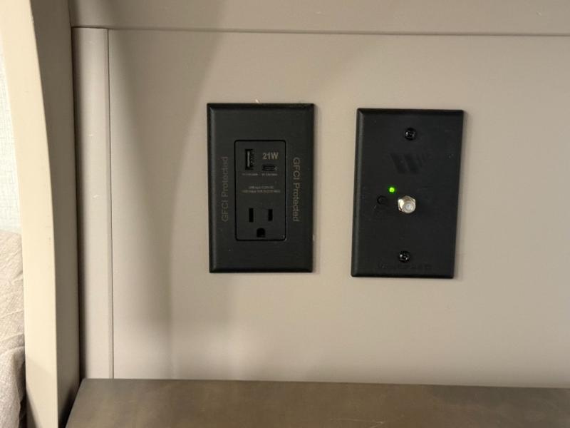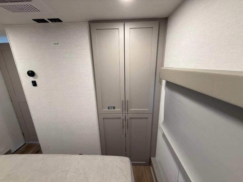 Private Front Bedroom: Queen bed with dual nightstands and overhead storage.