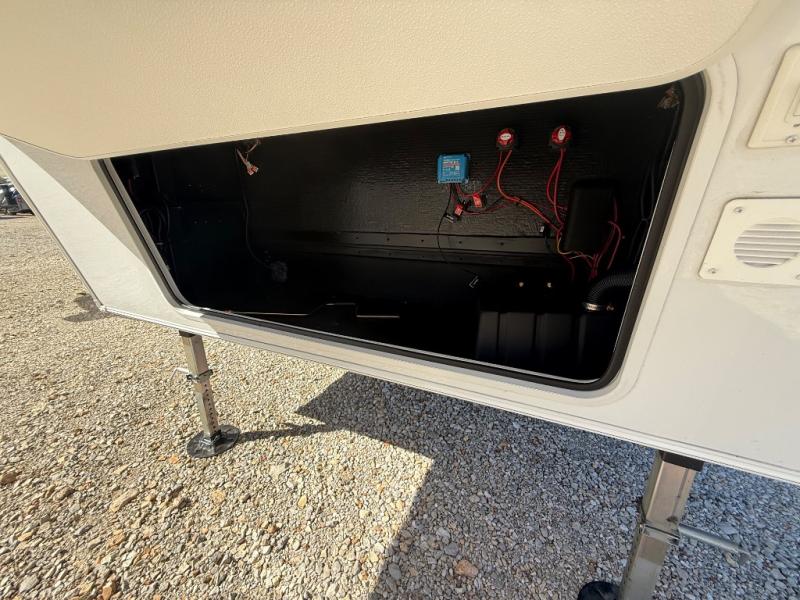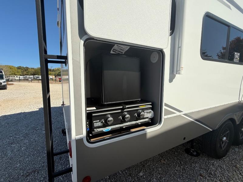 This fifth wheel is ready for adventure when you are! Once you arrive at the campground, you can put out the 16' awning, then start lunch on the exterior griddle. A booth dinette and theater sofa provide seating space inside, and there is a 50" Class HDTV to enjoy movies. The chef will also love the interior kitchen with its ample counter space, and there is plenty of storage with a hutch/pantry, second pantry, and 10 cu. ft. 12V refrigerator. Freshen up in the full bath before heading off to bed in the front private bedroom. Here, you'll find a queen bed, dual nightstands and overhead storage, plus a wardrobe with washer and dryer prep if you choose to add those appliances!