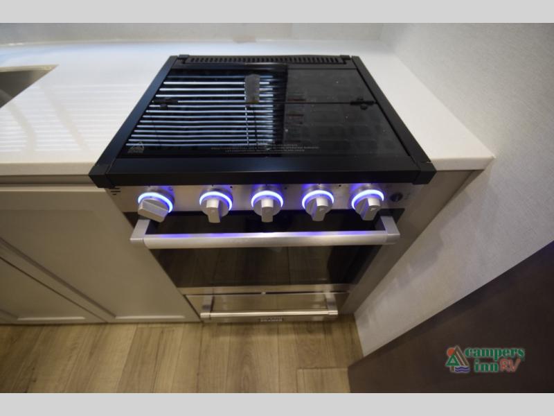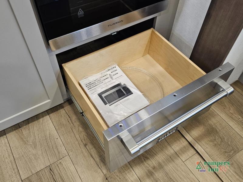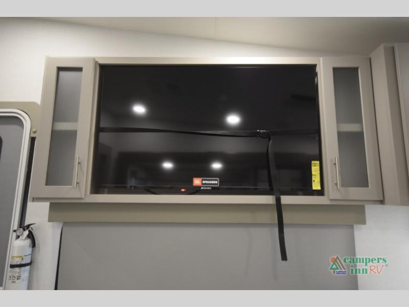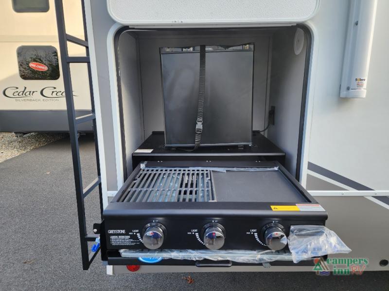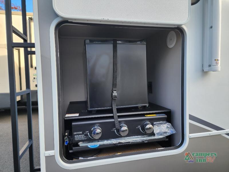 This fifth wheel is ready for adventure when you are! Once you arrive at the campground, you can put out the 16' awning, then start lunch on the exterior griddle. A booth dinette and theater sofa provide seating space inside, and there is a 50" Class HDTV to enjoy movies. The chef will also love the interior kitchen with its ample counter space, and there is plenty of storage with a hutch/pantry, second pantry, and 10 cu. ft. 12V refrigerator. Freshen up in the full bath before heading off to bed in the front private bedroom. Here, you'll find a queen bed, dual nightstands and overhead storage, plus a wardrobe with washer and dryer prep if you choose to add those appliances!