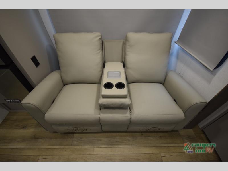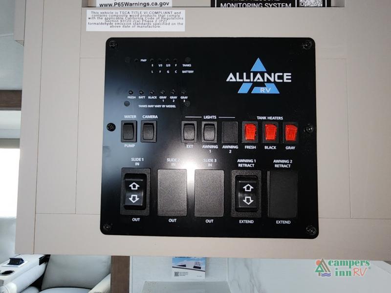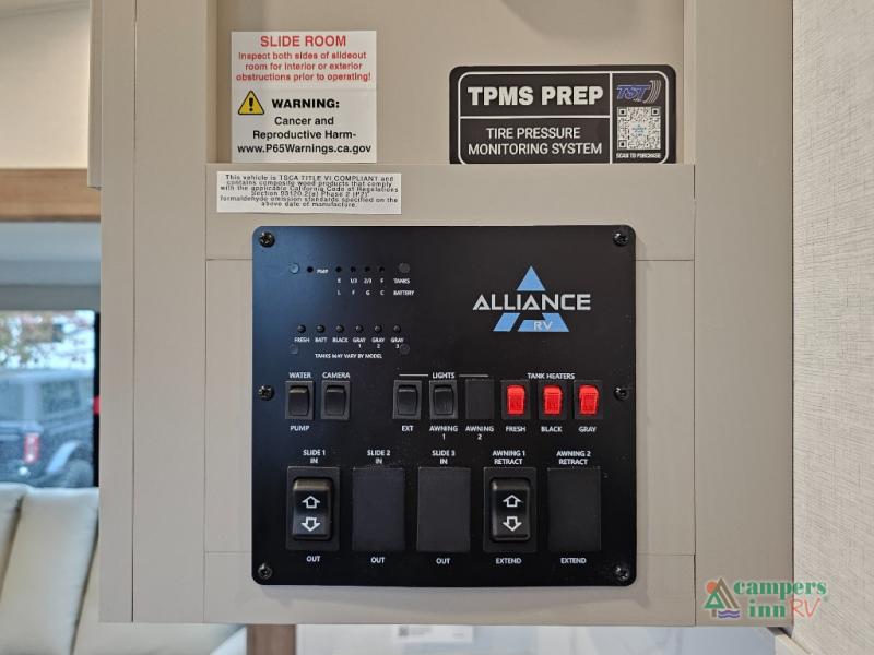 A benchmark chassis creates a space saver upper deck with each one of these Avenue All-Access fifth wheels by Alliance RV! The 101 in. wide-body construction gives you more room to walk around and the flush slide out floors throughout prevent any tripping. There are Azdel composite sidewalls inside and out, and a seamless fully walkable PVC roof for extreme durability and zero maintenance. You are sure to love no carpet throughout making each Avenue All-Access easy to clean and allergen free, not to mention pet friendly. You can maximize your space throughout with innovative storage solutions like the hidden storage behind the TV, inside the end tables, ottoman, and dinette chairs. These units also include the OTG Solar Package with a 200 watt solar panel, 15 amp MPPT charger, multiple outlets, and more to keep you powered up!