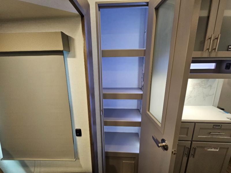 This fifth wheel is ready for adventure when you are! Once you arrive at the campground, you can put out the 16' awning, then start lunch on the exterior griddle. A booth dinette and theater sofa provide seating space inside, and there is a 50" Class HDTV to enjoy movies. The chef will also love the interior kitchen with its ample counter space, and there is plenty of storage with a hutch/pantry, second pantry, and 10 cu. ft. 12V refrigerator. Freshen up in the full bath before heading off to bed in the front private bedroom. Here, you'll find a queen bed, dual nightstands and overhead storage, plus a wardrobe with washer and dryer prep if you choose to add those appliances!