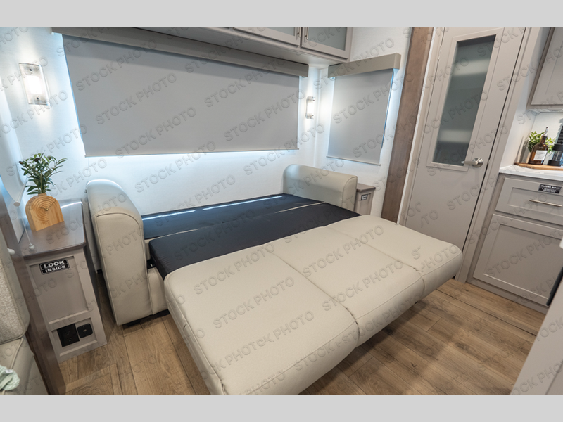 Perfect for families, couples, and travelers who crave space and style. The heart of this fifth wheel is the spacious living area, featuring a tri-fold sleeper sofa that's perfect for lounging and sleeping. Gather around the table with chairs and a bench for meals or socializing. The kitchen is fully equipped with a kitchen island, pantry, hutch, and overhead cabinets, providing ample storage and counter space. The microwave and 10 cu 12V refrigerator ensure that meal preparation and storage are convenient and easy. The full bathroom offers a private space for personal care, ensuring a comfortable and refreshing experience, and the front bedroom is a peaceful retreat, featuring a queen bed, nightstands, and overhead storage.
