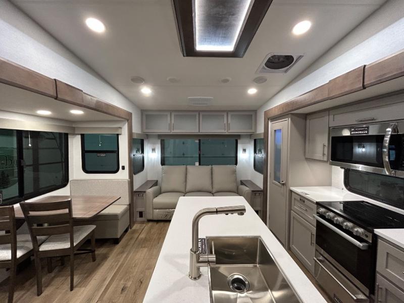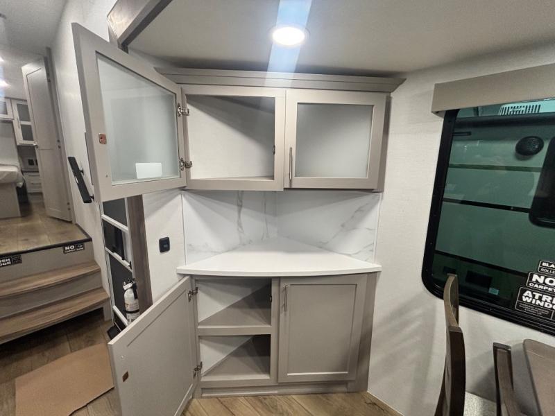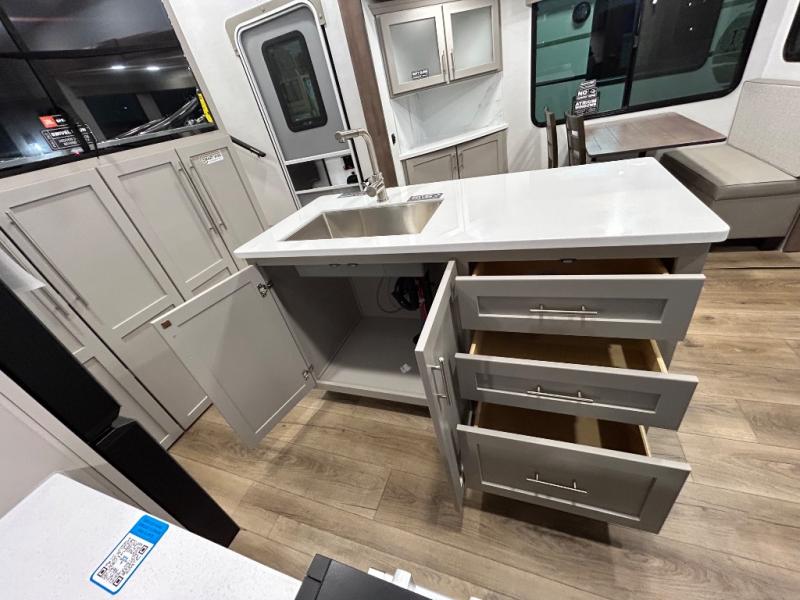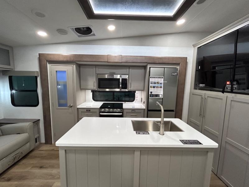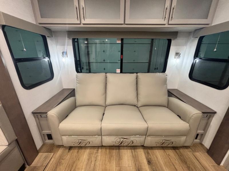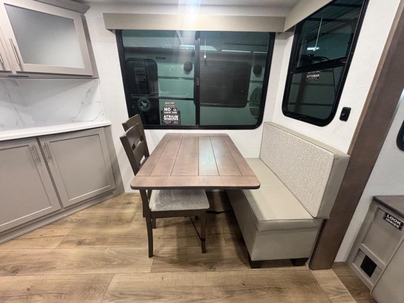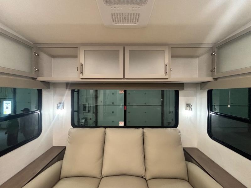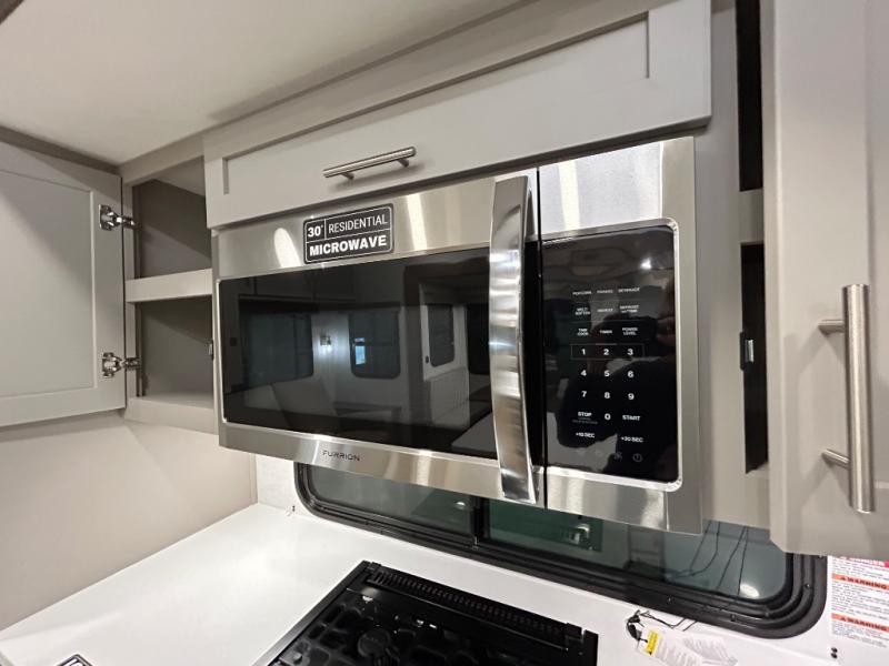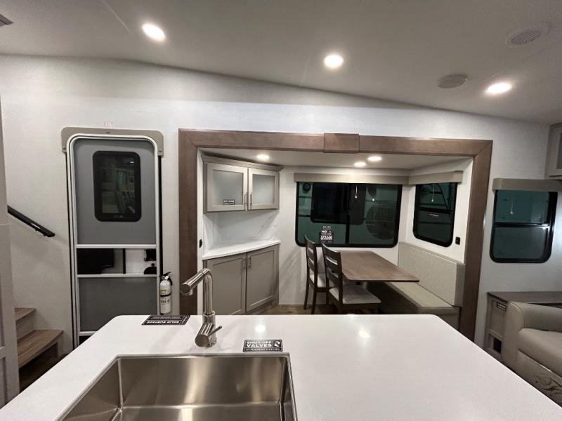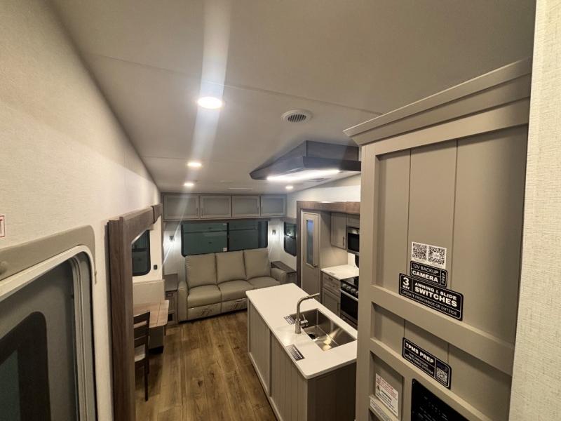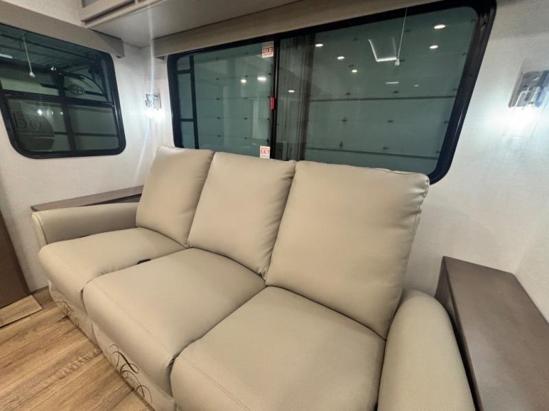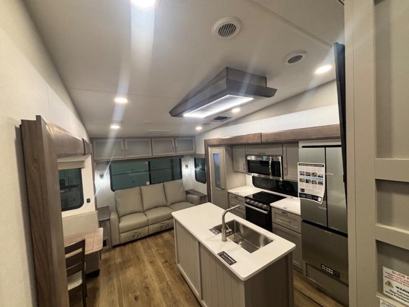 Perfect for families, couples, and travelers who crave space and style. The heart of this fifth wheel is the spacious living area, featuring a tri-fold sleeper sofa that's perfect for lounging and sleeping. Gather around the table with chairs and a bench for meals or socializing. The kitchen is fully equipped with a kitchen island, pantry, hutch, and overhead cabinets, providing ample storage and counter space. The microwave and 10 cu 12V refrigerator ensure that meal preparation and storage are convenient and easy. The full bathroom offers a private space for personal care, ensuring a comfortable and refreshing experience, and the front bedroom is a peaceful retreat, featuring a queen bed, nightstands, and overhead storage.
