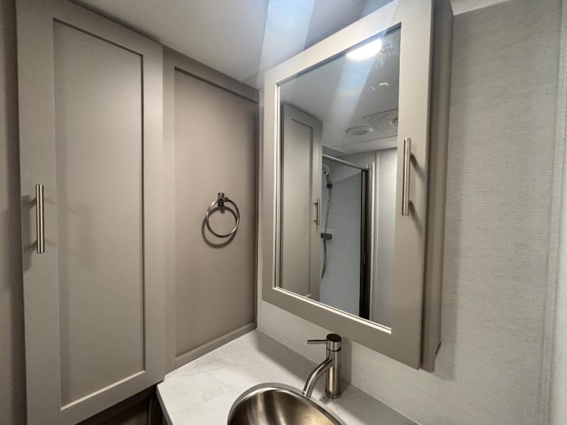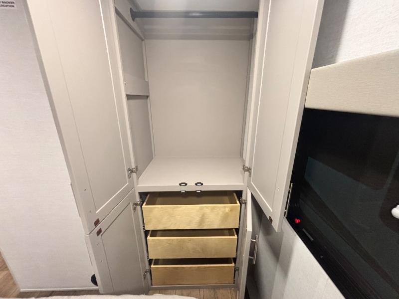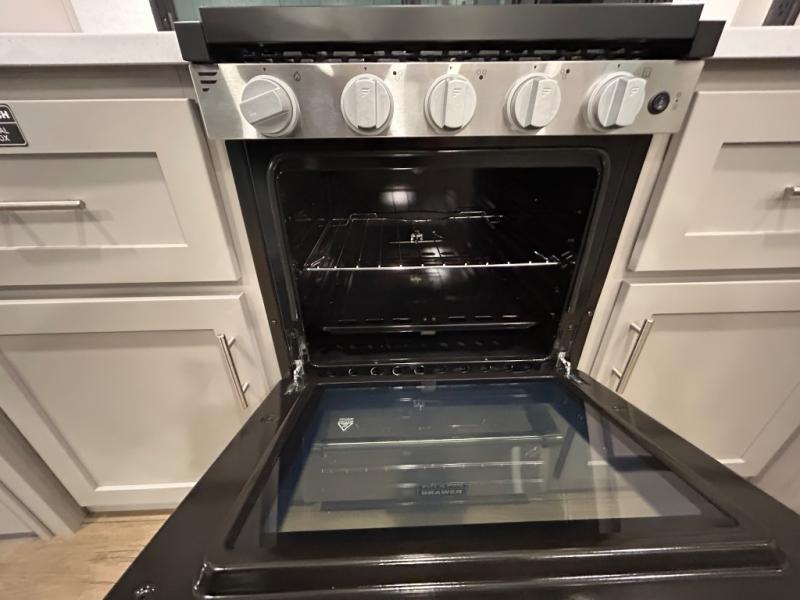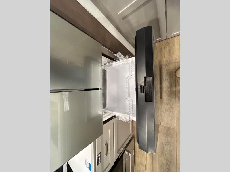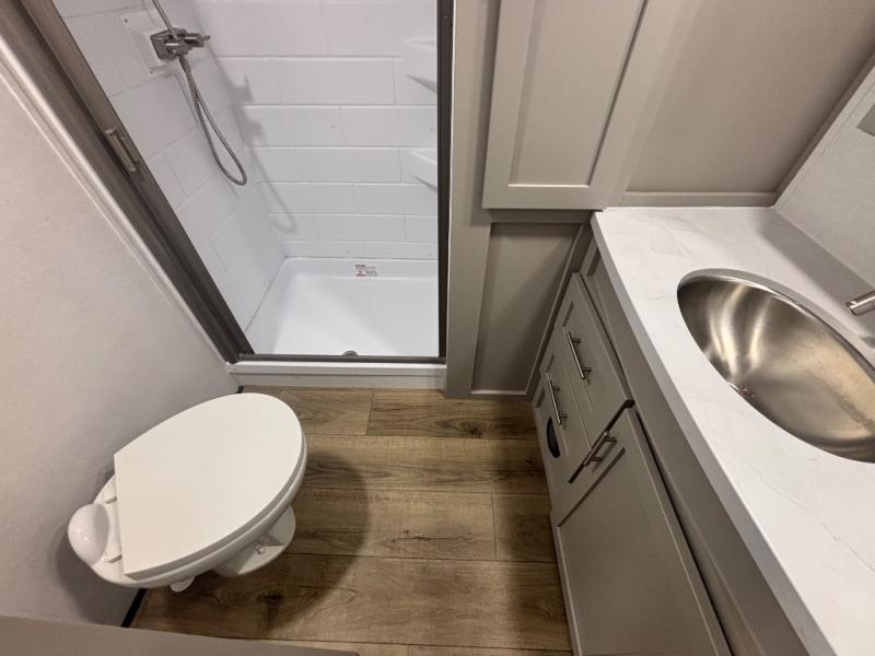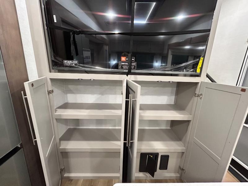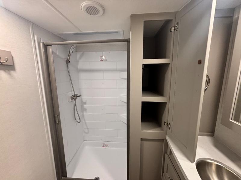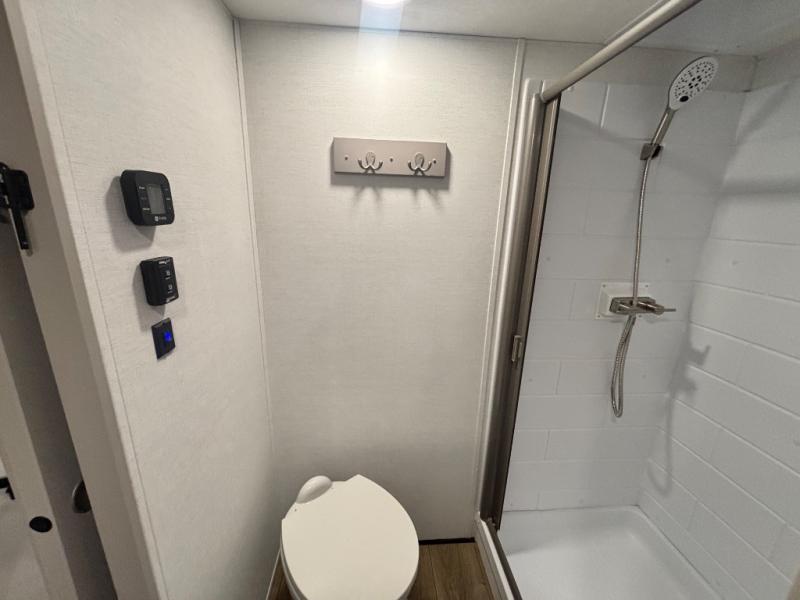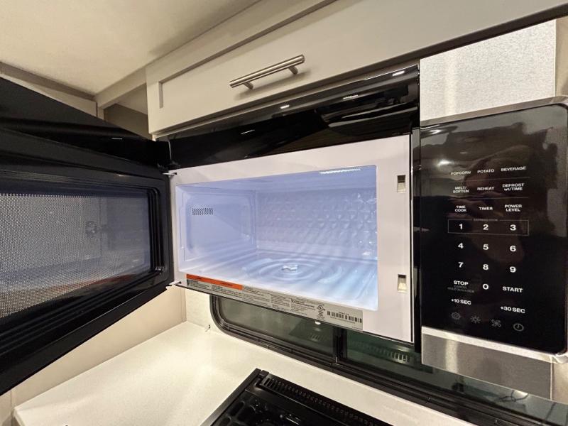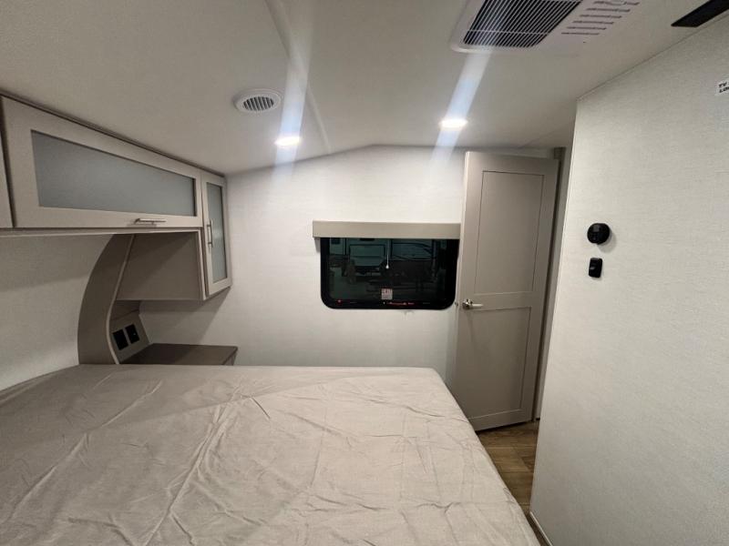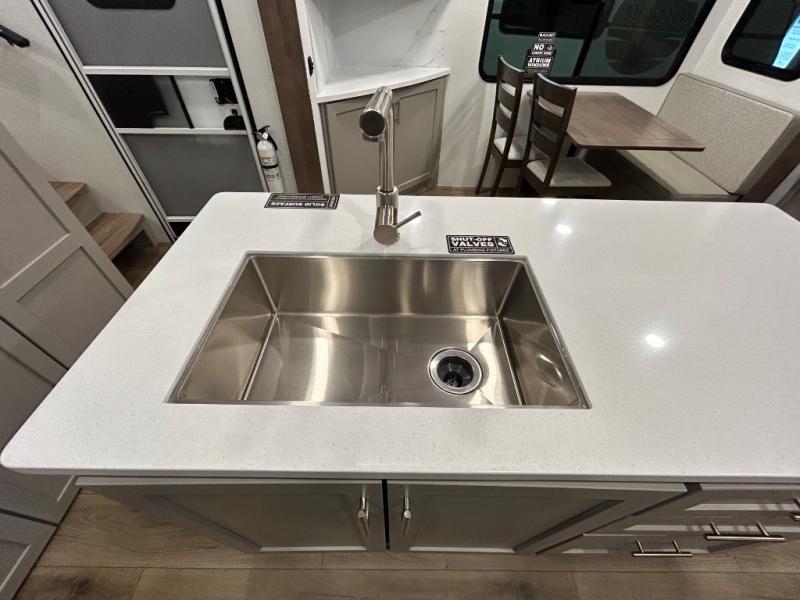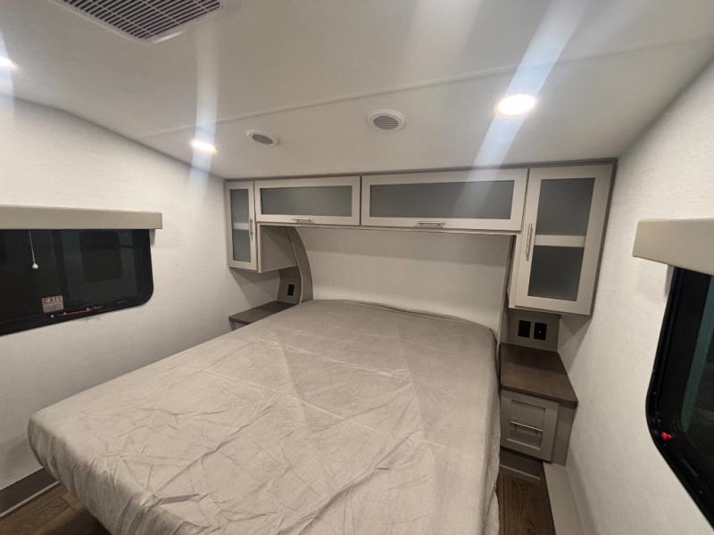 Perfect for families, couples, and travelers who crave space and style. The heart of this fifth wheel is the spacious living area, featuring a tri-fold sleeper sofa that's perfect for lounging and sleeping. Gather around the table with chairs and a bench for meals or socializing. The kitchen is fully equipped with a kitchen island, pantry, hutch, and overhead cabinets, providing ample storage and counter space. The microwave and 10 cu 12V refrigerator ensure that meal preparation and storage are convenient and easy. The full bathroom offers a private space for personal care, ensuring a comfortable and refreshing experience, and the front bedroom is a peaceful retreat, featuring a queen bed, nightstands, and overhead storage.