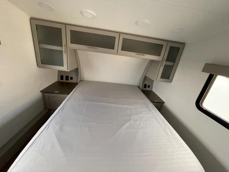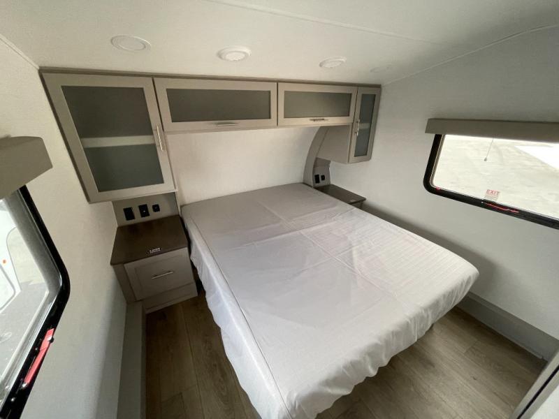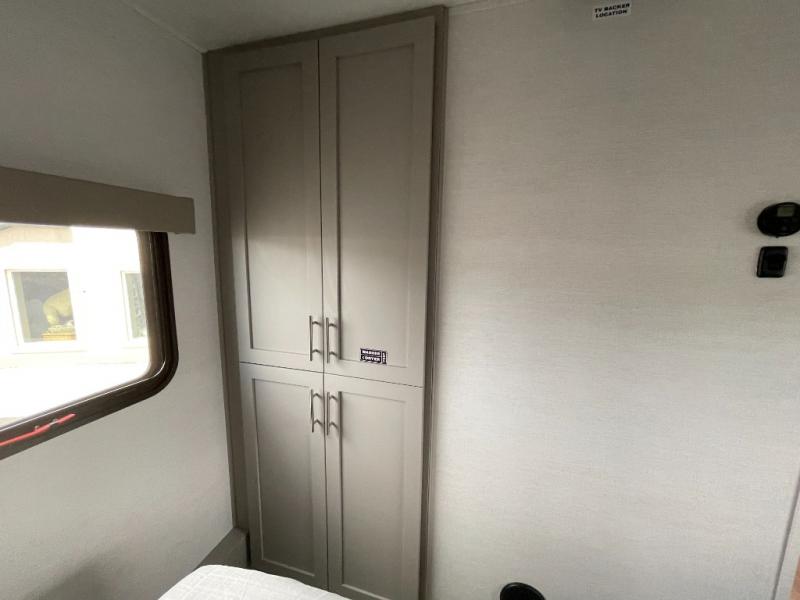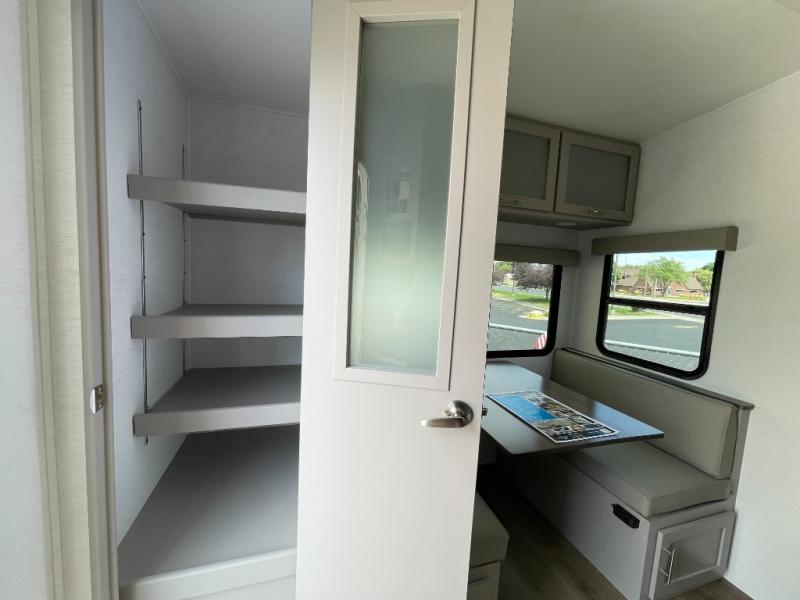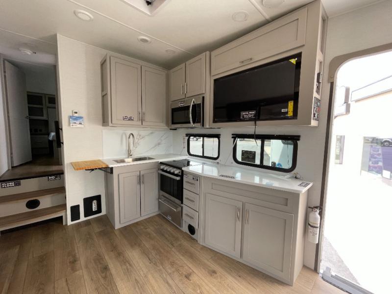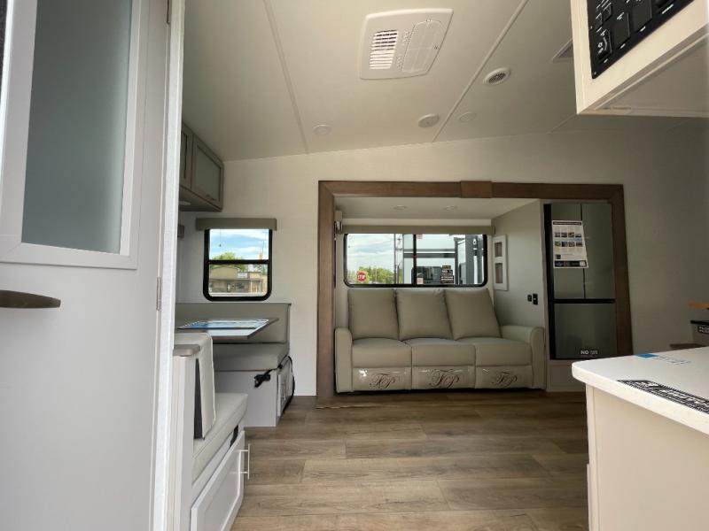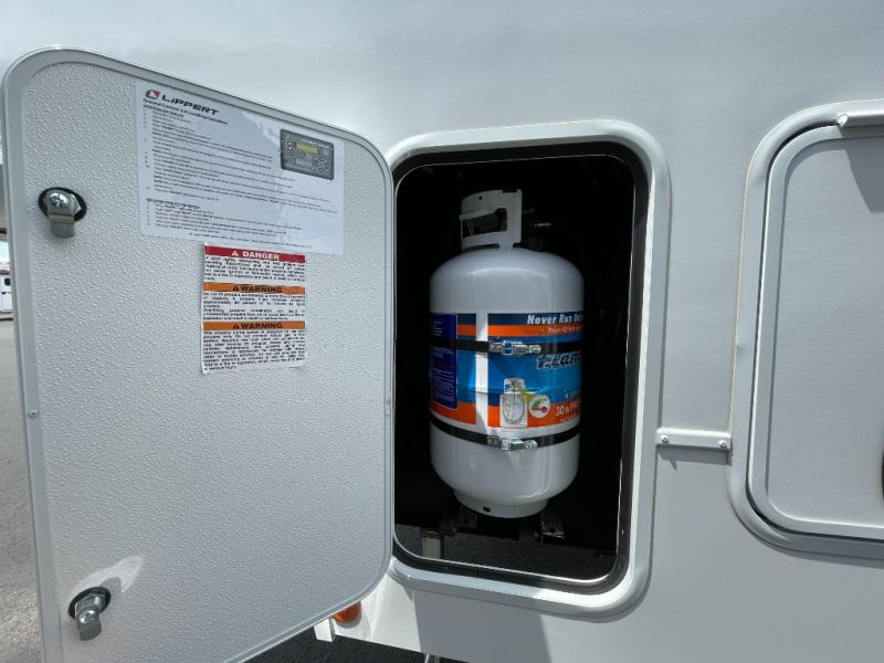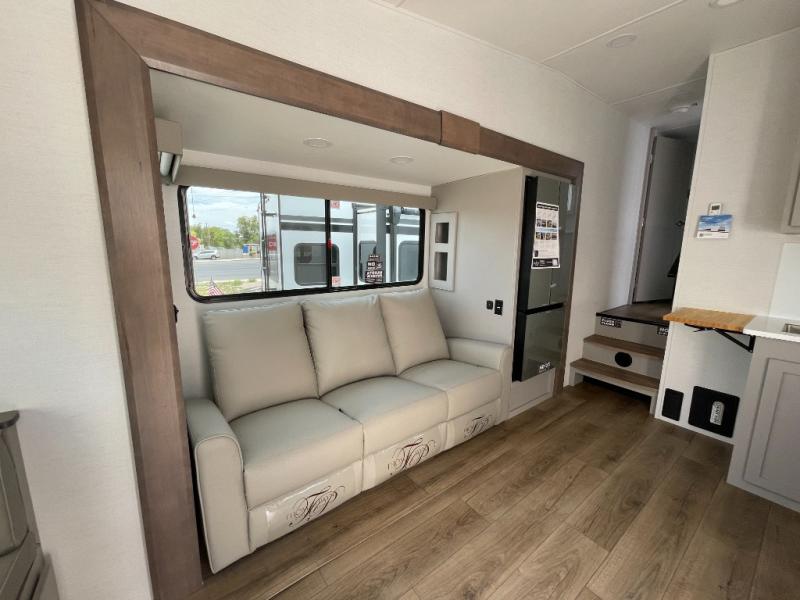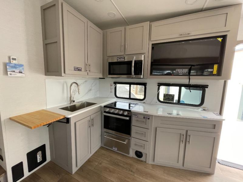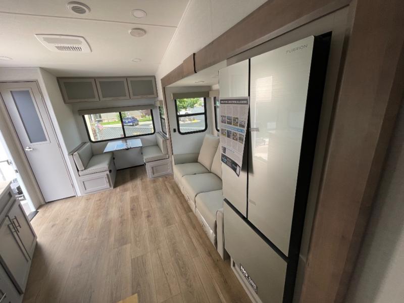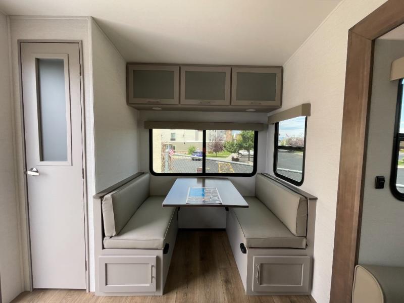 Escape to your favorite destinations with your favorite person in this fifth wheel! The front private bedroom has a queen bed with nightstands on either side to set a glass of water on, and a wardrobe to keep your clothes looking nice. Freshen up each morning in the full bathroom with a 30" x 36" shower, and grab a towel stored close by in the linen closet. Now that you're ready for the day, you can head to the kitchen and grab some eggs from the 10 cu. ft. 12V refrigerator to fry up using the three burner cooktop, plus there is a flip-up butcher block to make dinner prep easier. Spend your evenings in true relaxation seated on the sofa slide out across from the swing mount 40" HDTV. You also have a rear booth dinette with overhead storage!