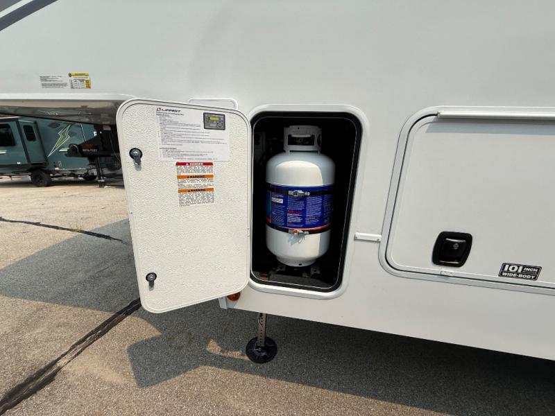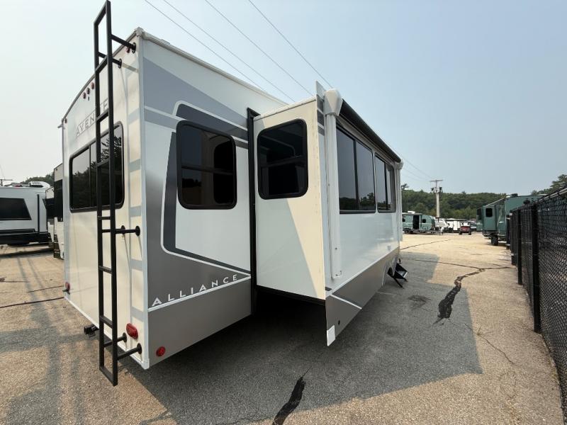 A benchmark chassis creates a space saver upper deck with each one of these Avenue All-Access fifth wheels by Alliance RV! The 101 in. wide-body construction gives you more room to walk around and the flush slide out floors throughout prevent any tripping. There are Azdel composite sidewalls inside and out, and a seamless fully walkable PVC roof for extreme durability and zero maintenance. You are sure to love the "no carpet zone" making each Avenue easy to clean and allergen free, not to mention pet friendly. You can maximize your space throughout with innovative storage solutions like the hidden storage behind the TV, inside the end tables, ottoman, and dinette chairs. These units also include the OTG Solar Package with a 200 watt solar panel, 15 amp MPPT charger, multiple outlets, and more to keep you powered up!