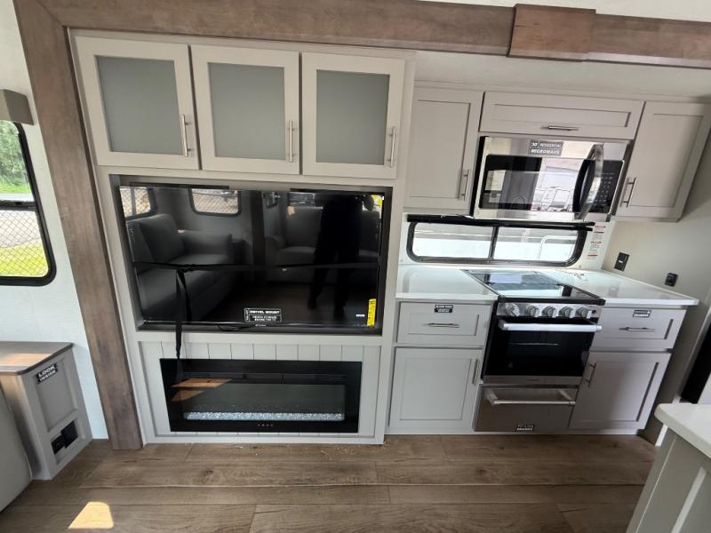Functional Kitchen: Equipped with a 10 cu. ft. 12V refrigerator, three-burner cooktop, and a kitchen island, the kitchen provides ample space for meal preparation. Additional storage is available in the pantry and hutch.?