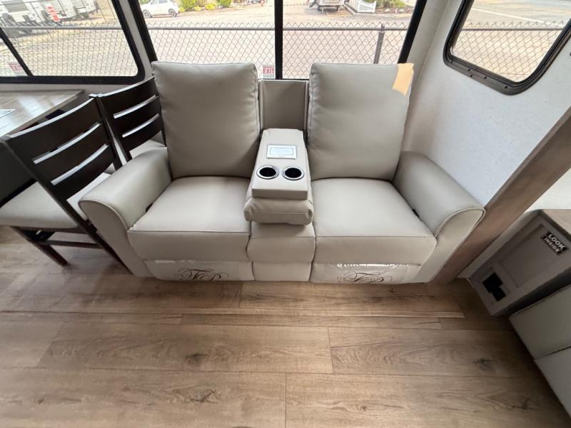 For the couple that enjoys adventures, this rear living coach has everything you need to travel comfortably and take along a couple of friends! The front private bedroom has a queen bed with nightstands on either side for your personal belongings, and a wardrobe to keep your clothes looking nice. Freshen up each morning in the full bathroom with a 30" x 36" shower, and grab a towel stored close by in the linen closet. Now that you're ready for the day, you can head to the kitchen and create a hearty breakfast with the full kitchen amenities. You will appreciate having a 10 cu. ft. 12V refrigerator and three burner cooktop, plus there is a center island with plenty of counter space and a sink to make food prep even easier. Spend your evenings in true relaxation in the dual recliner theater seats across from the swing mount 50" HDTV with hidden storage behind. You will also love the pantry and hutch in the kitchen area for storing all of your dishes and non-perishables. Dine at the floating table with two chairs along with a moveable ottoman featuring storage.