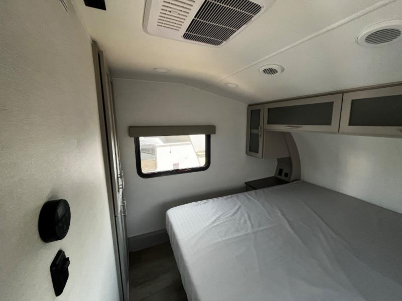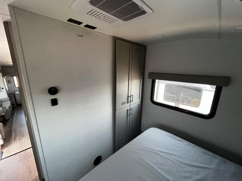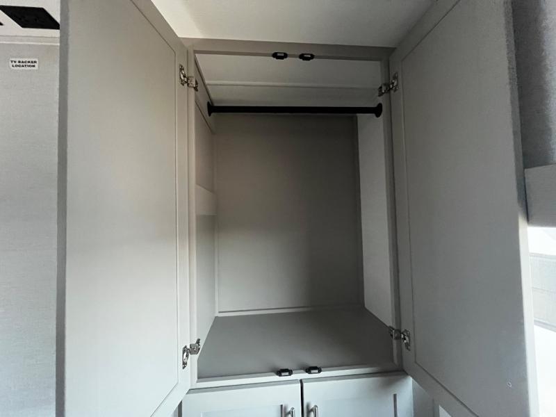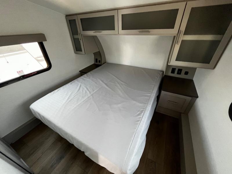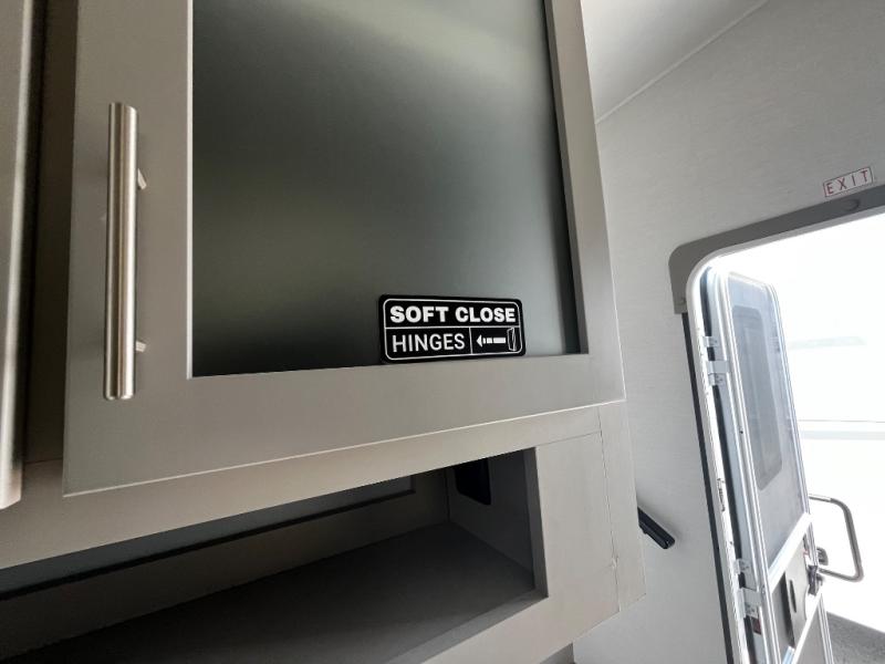 For the couple that enjoys adventures, this rear living coach has everything you need to travel comfortably and take along a couple of friends! The front private bedroom has a queen bed with nightstands on either side for your personal belongings, and a wardrobe to keep your clothes looking nice. Freshen up each morning in the full bathroom with a 30" x 36" shower, and grab a towel stored close by in the linen closet. Now that you're ready for the day, you can head to the kitchen and create a hearty breakfast with the full kitchen amenities. You will appreciate having a 10 cu. ft. 12V refrigerator and three burner cooktop, plus there is a center island with plenty of counter space and a sink to make food prep even easier. Spend your evenings in true relaxation in the dual recliner theater seats across from the swing mount 50" HDTV with hidden storage behind. You will also love the pantry and hutch in the kitchen area for storing all of your dishes and non-perishables. Dine at the floating table with two chairs along with a moveable ottoman featuring storage.