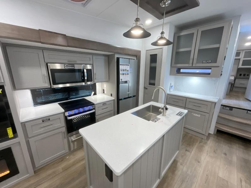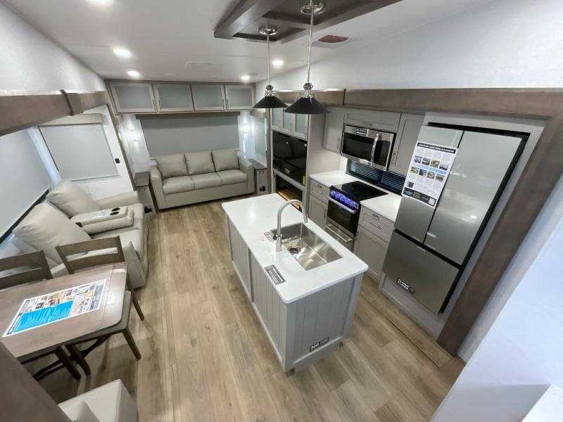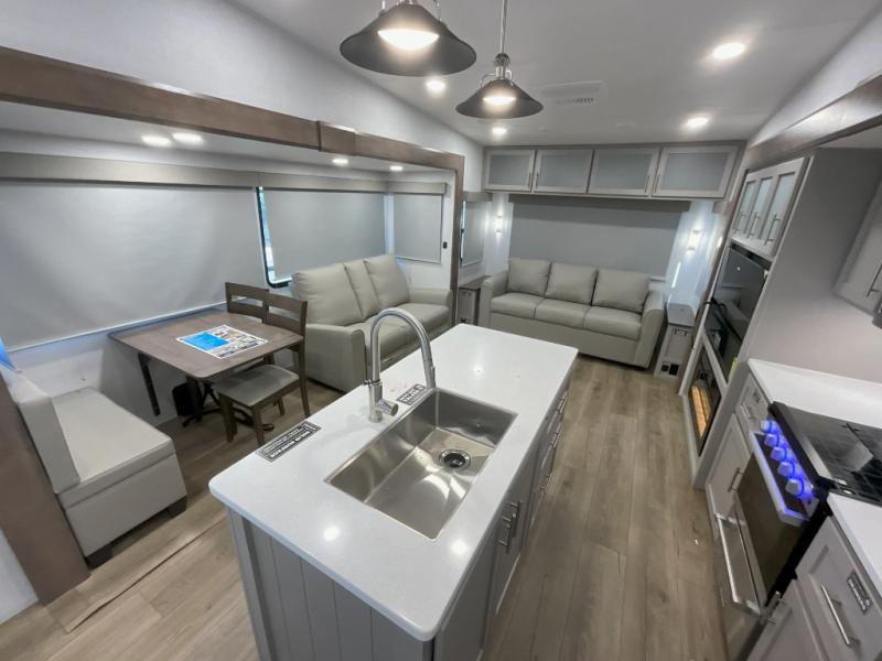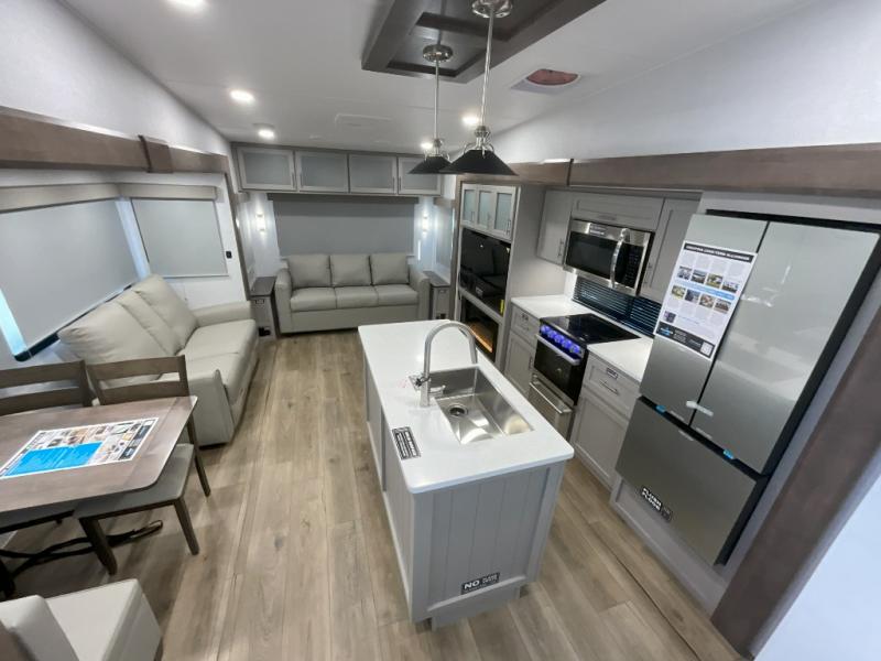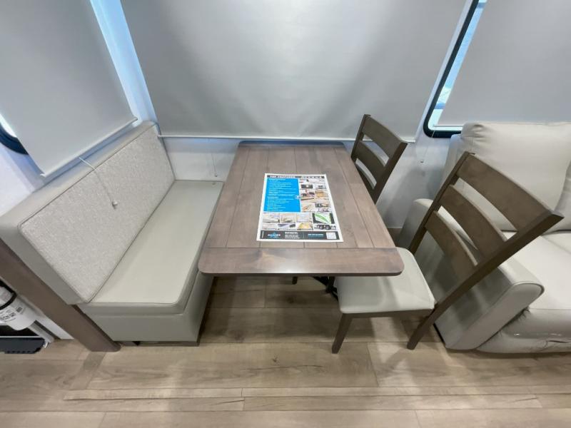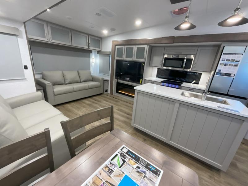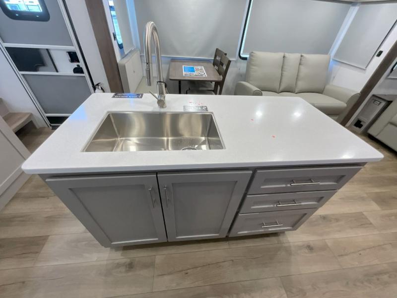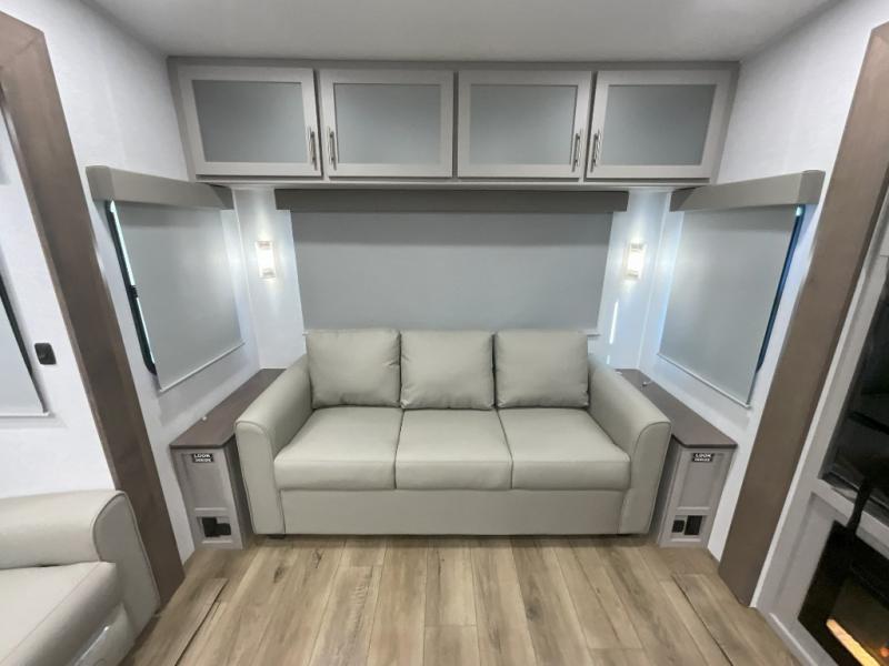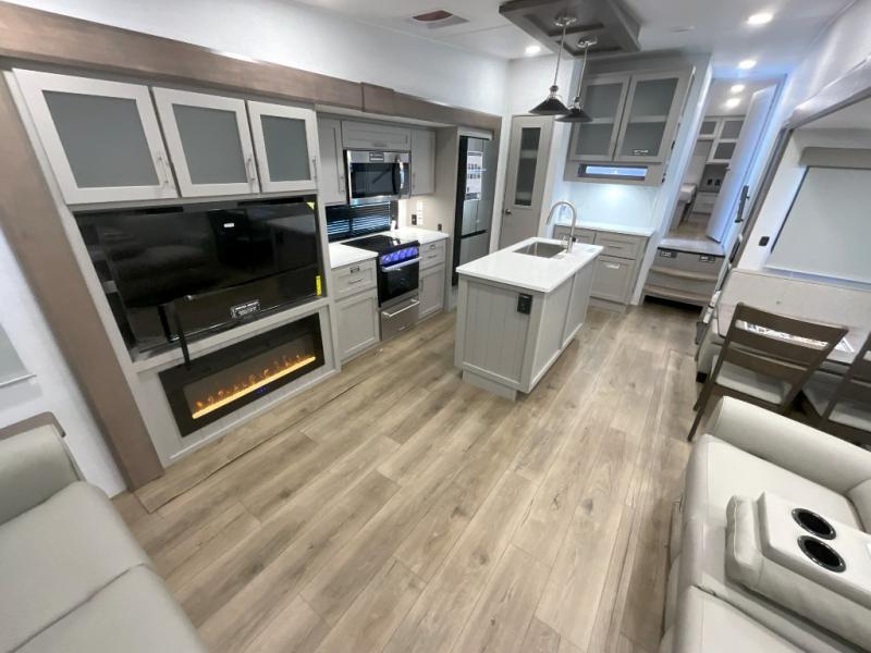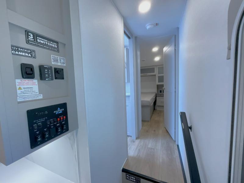 A benchmark chassis creates a space saver upper deck with each one of these Avenue All-Access fifth wheels by Alliance RV! The 101 in. wide-body construction gives you more room to walk around and the flush slide out floors throughout prevent any tripping. There are Azdel composite sidewalls inside and out, and a seamless fully walkable PVC roof for extreme durability and zero maintenance. You are sure to love no carpet throughout making each Avenue All-Access easy to clean and allergen free, not to mention pet friendly. You can maximize your space throughout with innovative storage solutions like the hidden storage behind the TV, inside the end tables, ottoman, and dinette chairs. These units also include the OTG Solar Package with a 200 watt solar panel, 15 amp MPPT charger, multiple outlets, and more to keep you powered up!