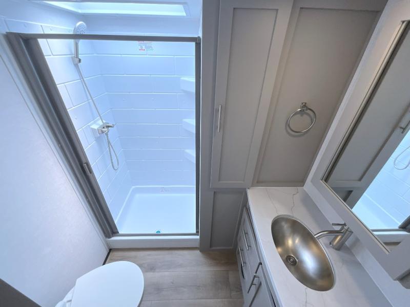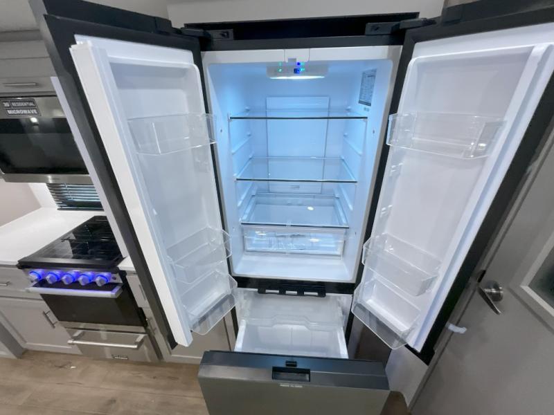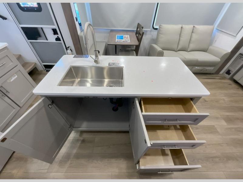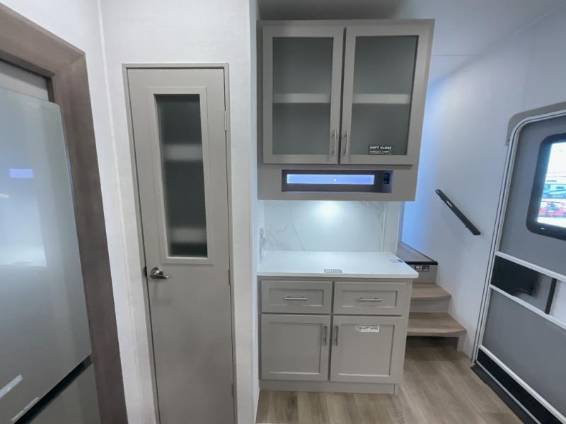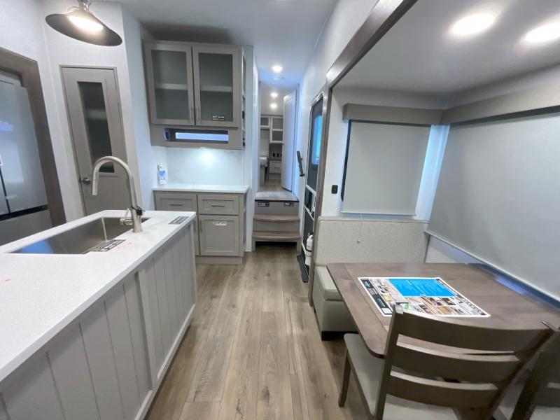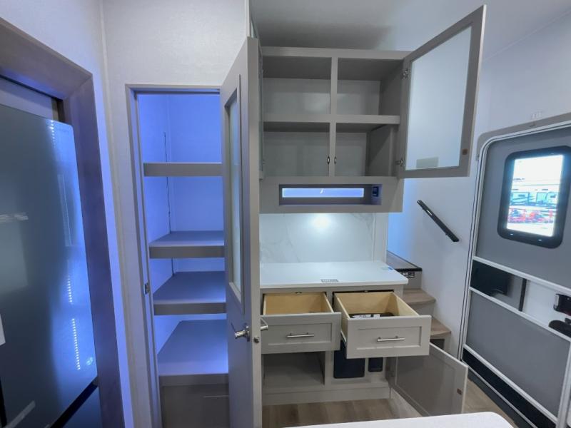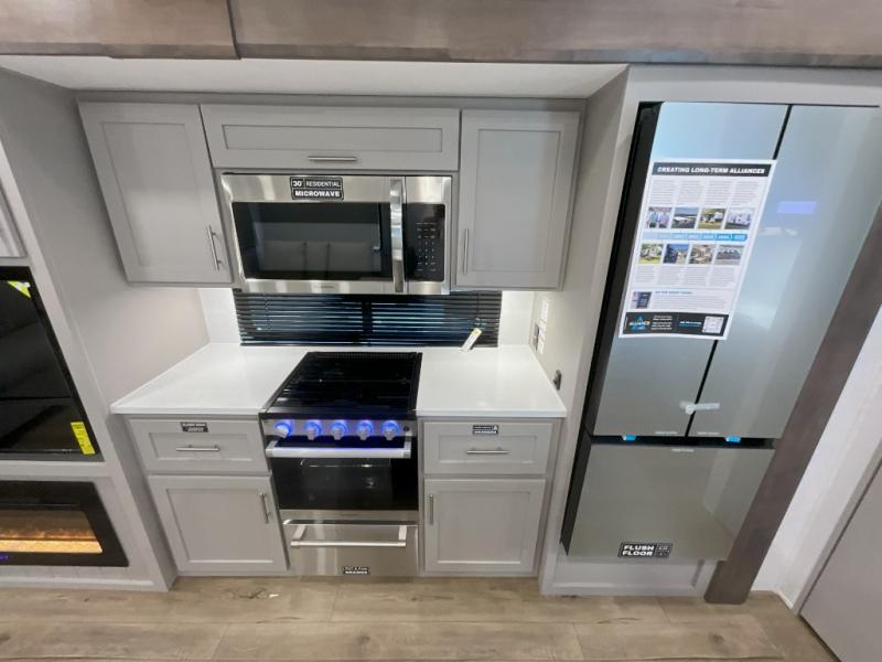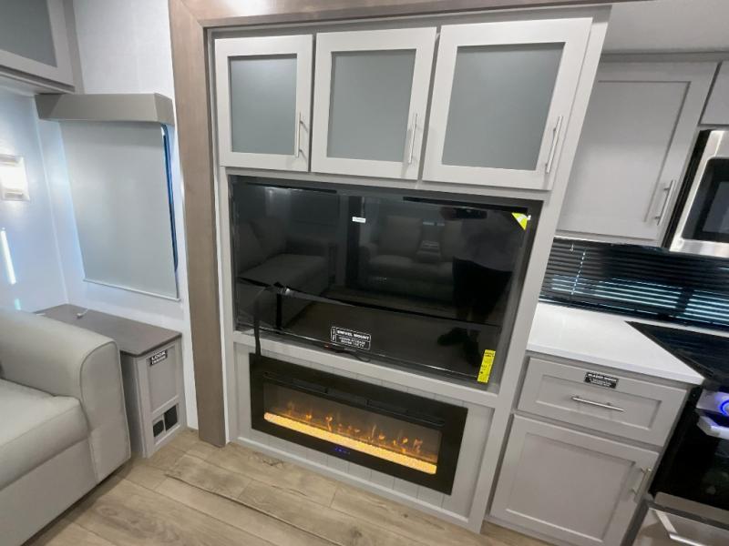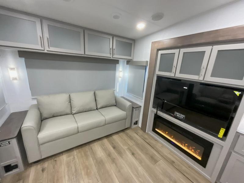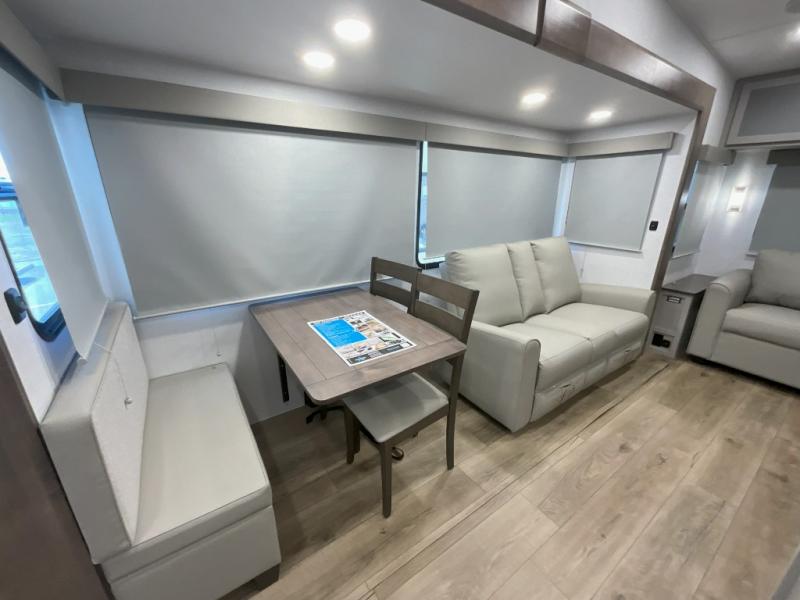 A benchmark chassis creates a space saver upper deck with each one of these Avenue All-Access fifth wheels by Alliance RV! The 101 in. wide-body construction gives you more room to walk around and the flush slide out floors throughout prevent any tripping. There are Azdel composite sidewalls inside and out, and a seamless fully walkable PVC roof for extreme durability and zero maintenance. You are sure to love no carpet throughout making each Avenue All-Access easy to clean and allergen free, not to mention pet friendly. You can maximize your space throughout with innovative storage solutions like the hidden storage behind the TV, inside the end tables, ottoman, and dinette chairs. These units also include the OTG Solar Package with a 200 watt solar panel, 15 amp MPPT charger, multiple outlets, and more to keep you powered up!