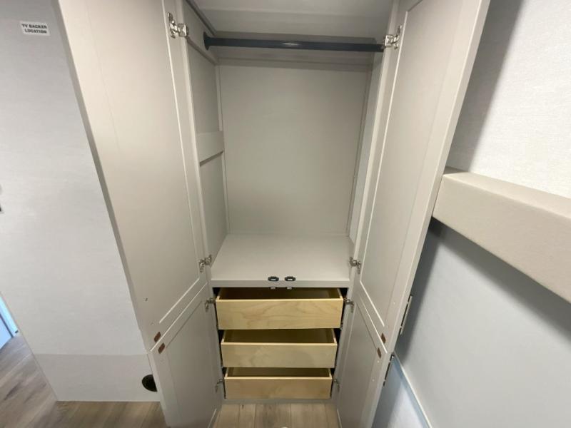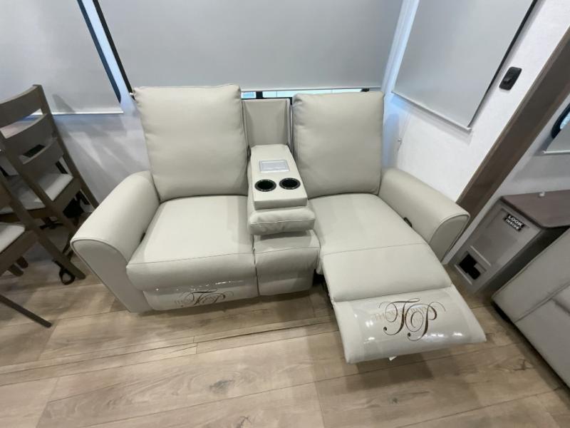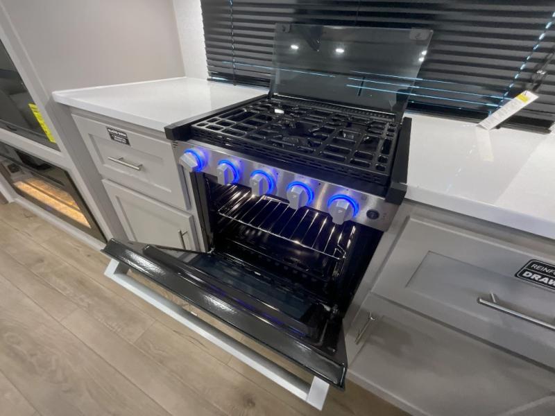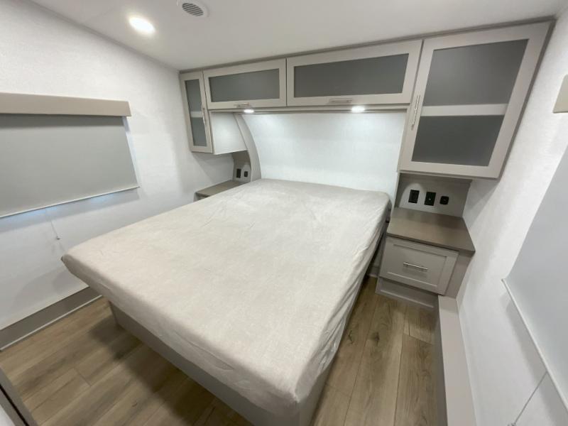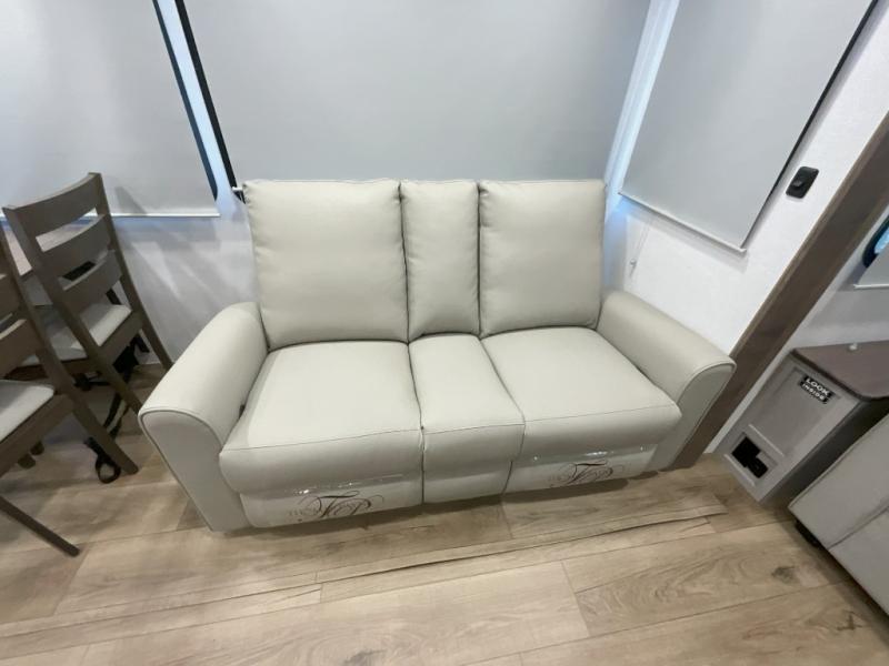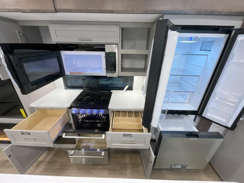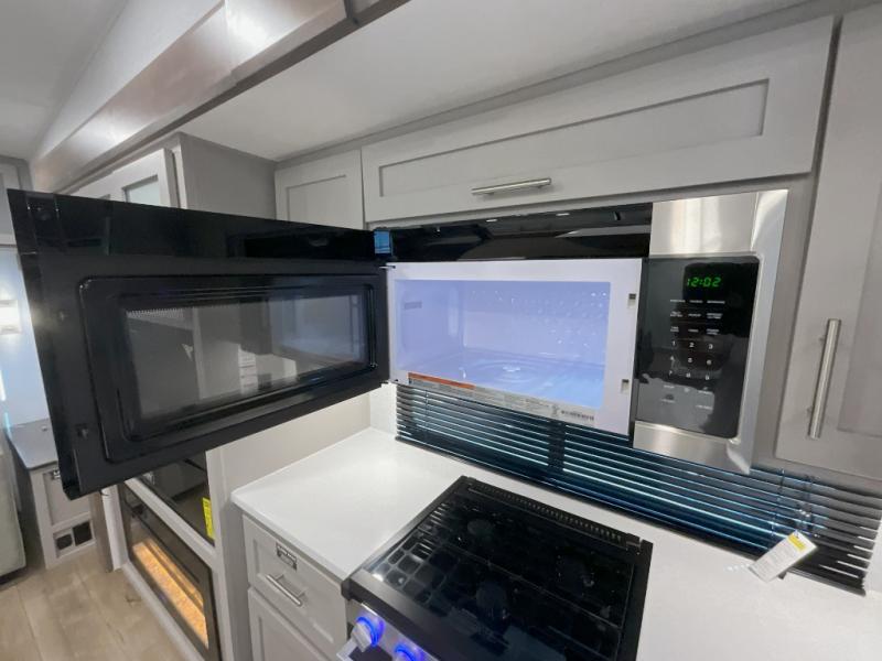 For the couple that enjoys adventures, this rear living coach has everything you need to travel comfortably and take along a couple of friends! The front private bedroom has a queen bed with nightstands on either side for your personal belongings, and a wardrobe to keep your clothes looking nice. Freshen up each morning in the full bathroom with a 30" x 36" shower, and grab a towel stored close by in the linen closet. Now that you're ready for the day, you can head to the kitchen and create a hearty breakfast with the full kitchen amenities. You will appreciate having a 10 cu. ft. 12V refrigerator and three burner cooktop, plus there is a center island with plenty of counter space and a sink to make food prep even easier. Spend your evenings in true relaxation in the dual recliner theater seats across from the swing mount 50" HDTV with hidden storage behind. You will also love the pantry and hutch in the kitchen area for storing all of your dishes and non-perishables. Dine at the floating table with two chairs along with a moveable ottoman featuring storage.