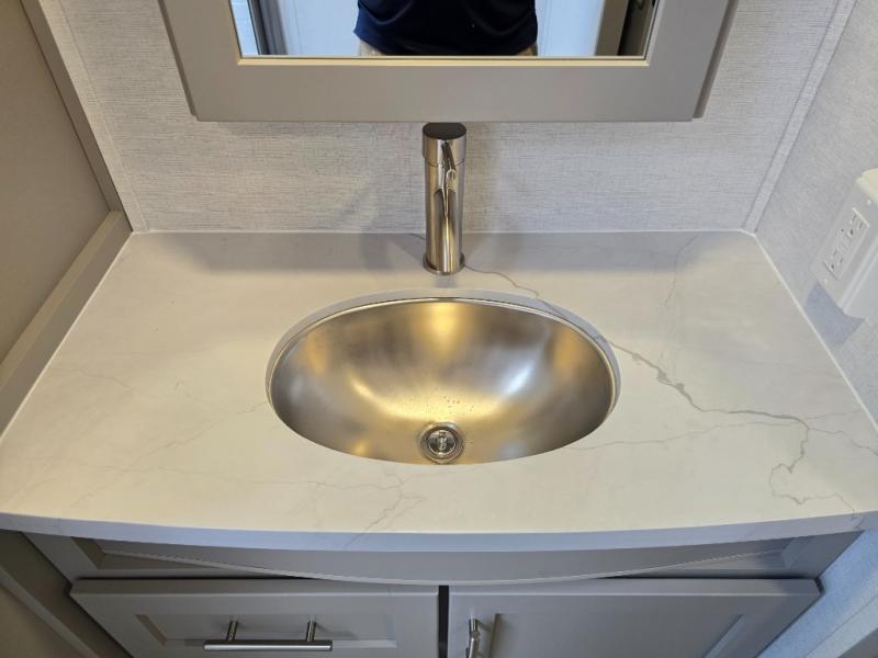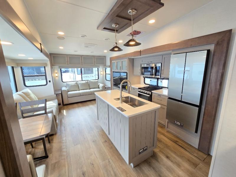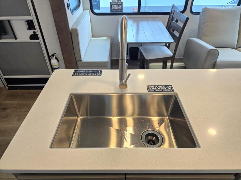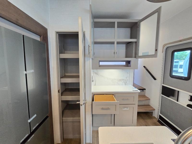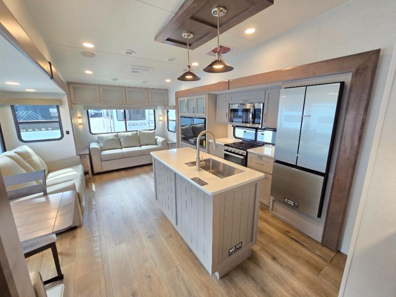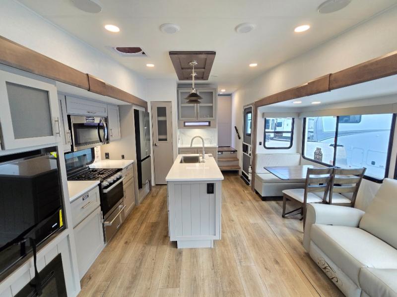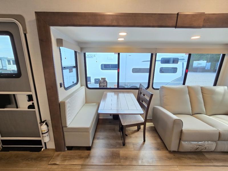 A benchmark chassis creates a space saver upper deck with each one of these Avenue All-Access fifth wheels by Alliance RV! The 101 in. wide-body construction gives you more room to walk around and the flush slide out floors throughout prevent any tripping. There are Azdel composite sidewalls inside and out, and a seamless fully walkable PVC roof for extreme durability and zero maintenance. You are sure to love no carpet throughout making each Avenue All-Access easy to clean and allergen free, not to mention pet friendly. You can maximize your space throughout with innovative storage solutions like the hidden storage behind the TV, inside the end tables, ottoman, and dinette chairs. These units also include the OTG Solar Package with a 200 watt solar panel, 15 amp MPPT charger, multiple outlets, and more to keep you powered up!