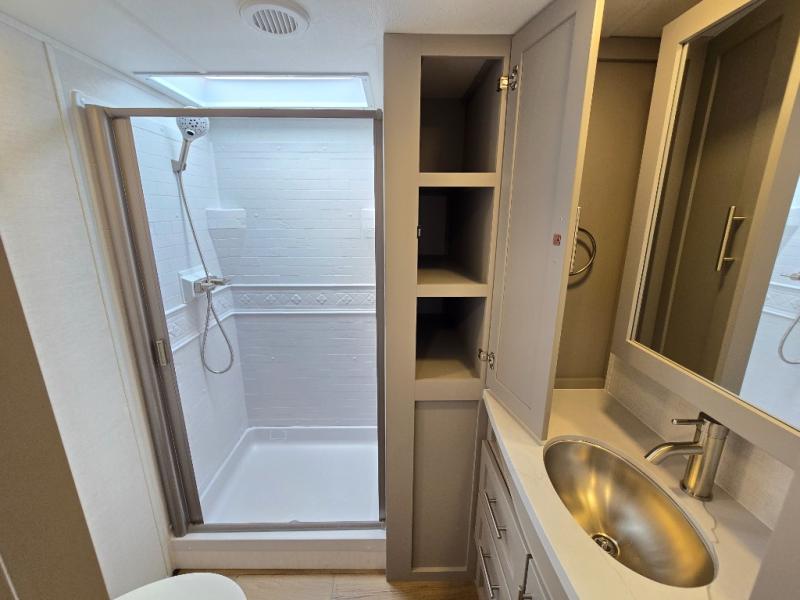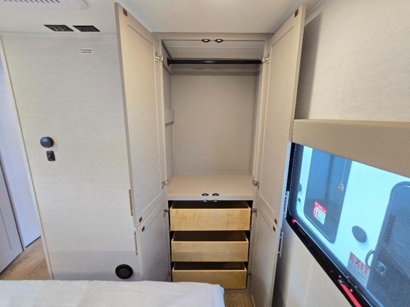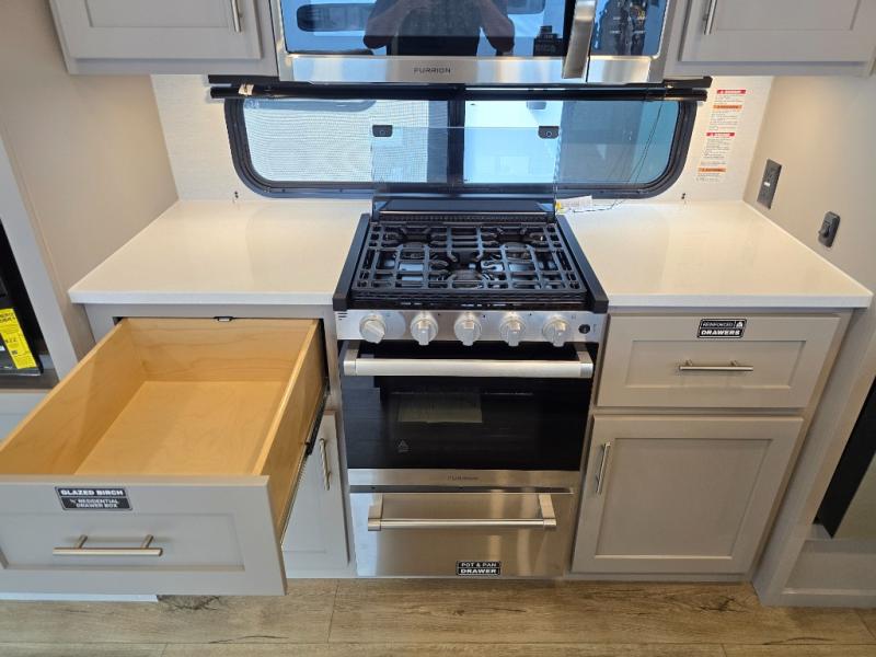 For the couple that enjoys adventures, this rear living coach has everything you need to travel comfortably and take along a couple of friends! The front private bedroom has a queen bed with nightstands on either side for your personal belongings, and a wardrobe to keep your clothes looking nice. Freshen up each morning in the full bathroom with a 30" x 36" shower, and grab a towel stored close by in the linen closet. Now that you're ready for the day, you can head to the kitchen and create a hearty breakfast with the full kitchen amenities. You will appreciate having a 10 cu. ft. 12V refrigerator and three burner cooktop, plus there is a center island with plenty of counter space and a sink to make food prep even easier. Spend your evenings in true relaxation in the dual recliner theater seats across from the swing mount 50" HDTV with hidden storage behind. You will also love the pantry and hutch in the kitchen area for storing all of your dishes and non-perishables. Dine at the floating table with two chairs along with a moveable ottoman featuring storage.