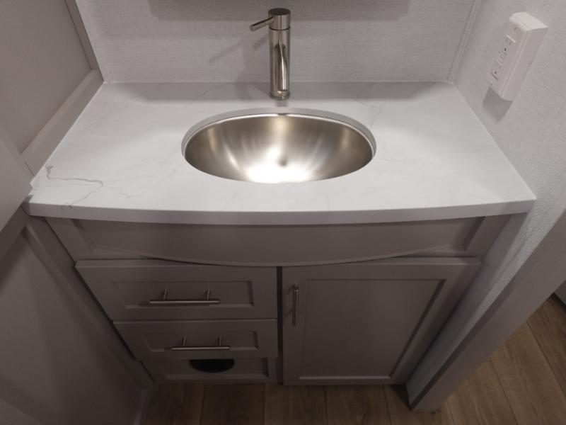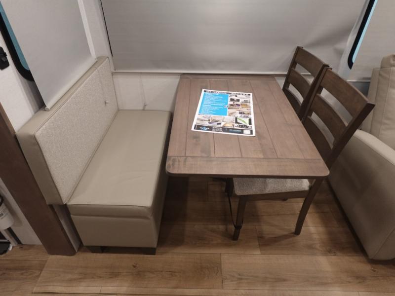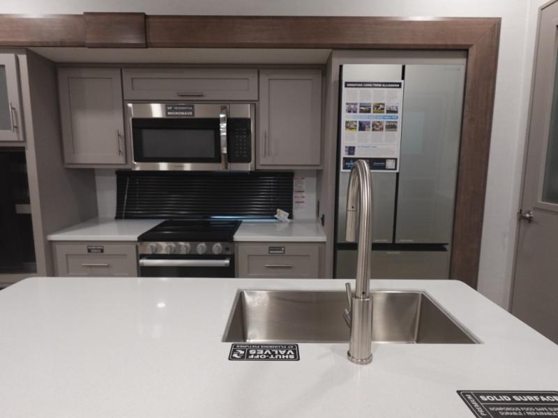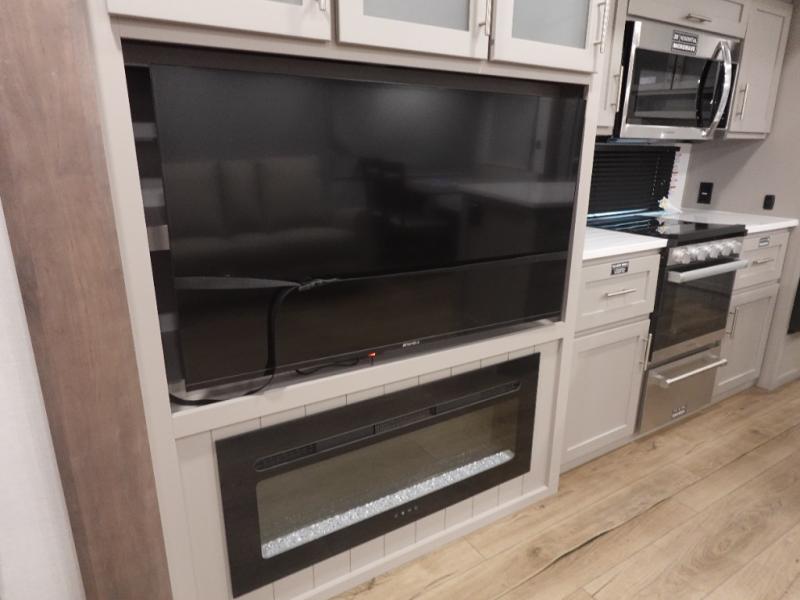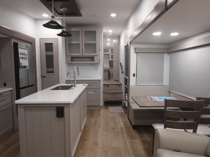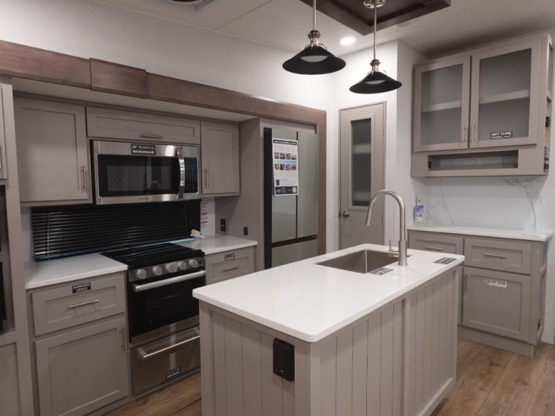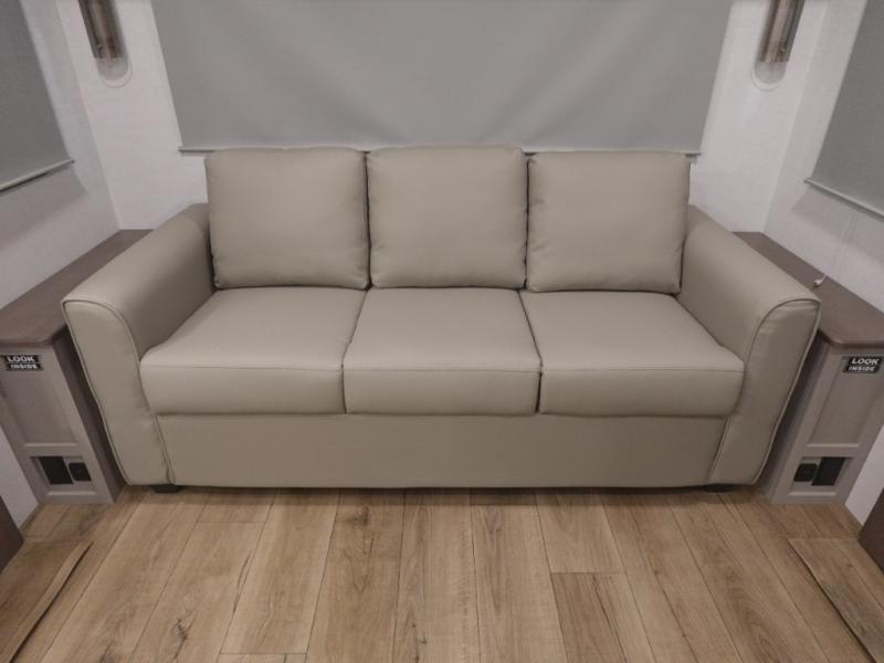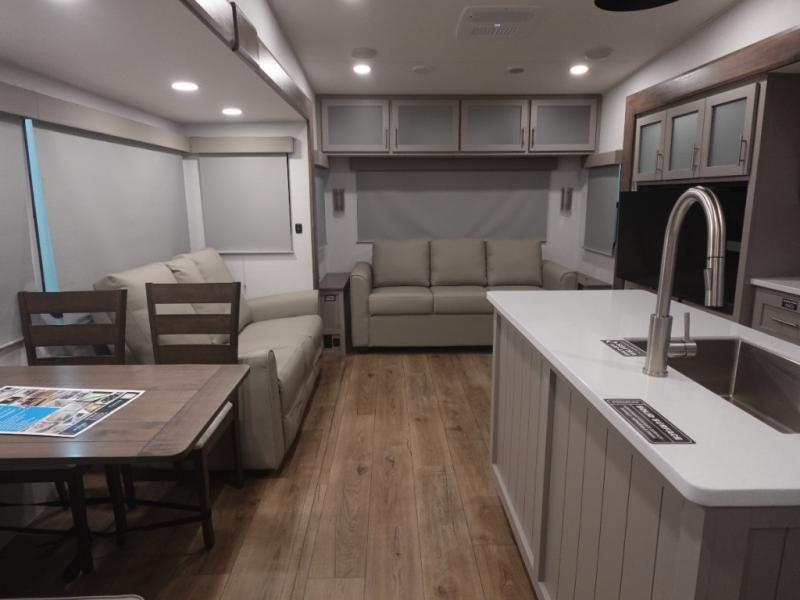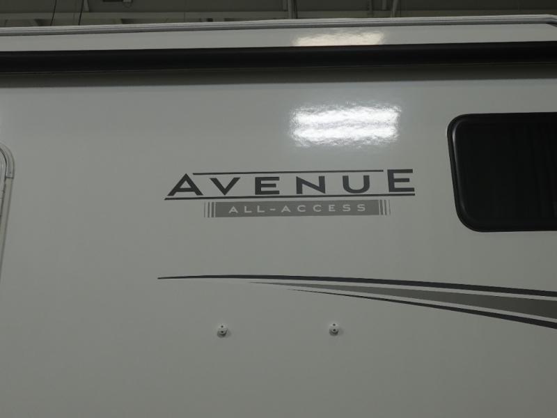 A benchmark chassis creates a space saver upper deck with each one of these Avenue All-Access fifth wheels by Alliance RV! The 101 in. wide-body construction gives you more room to walk around and the flush slide out floors throughout prevent any tripping. There are Azdel composite sidewalls inside and out, and a seamless fully walkable PVC roof for extreme durability and zero maintenance. You are sure to love no carpet throughout making each Avenue All-Access easy to clean and allergen free, not to mention pet friendly. You can maximize your space throughout with innovative storage solutions like the hidden storage behind the TV, inside the end tables, ottoman, and dinette chairs. These units also include the OTG Solar Package with a 200 watt solar panel, 15 amp MPPT charger, multiple outlets, and more to keep you powered up!