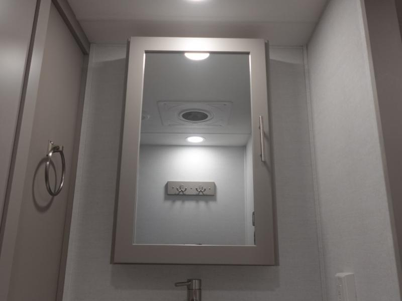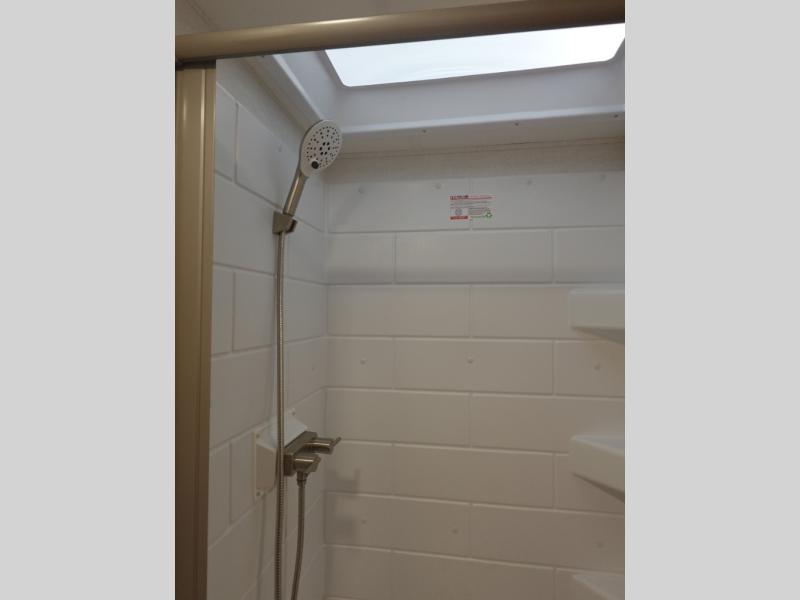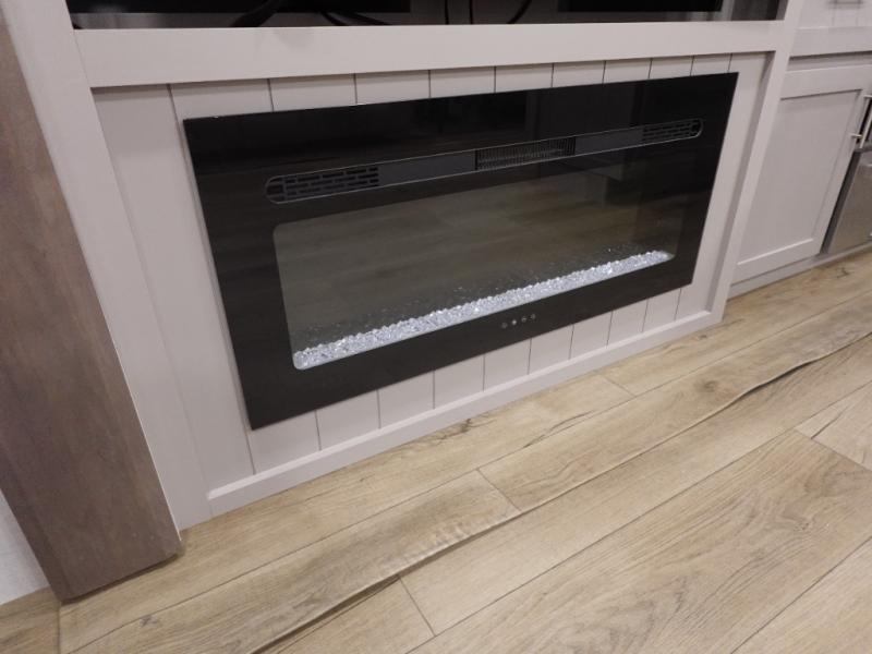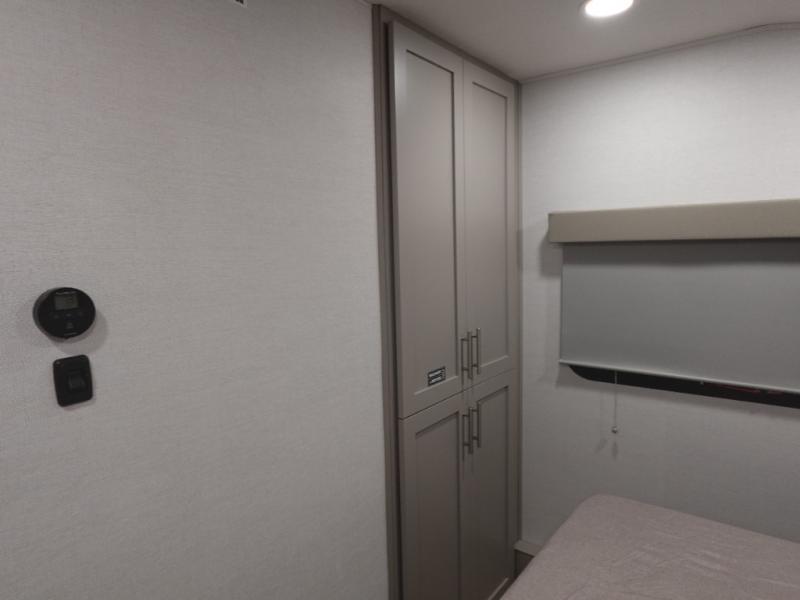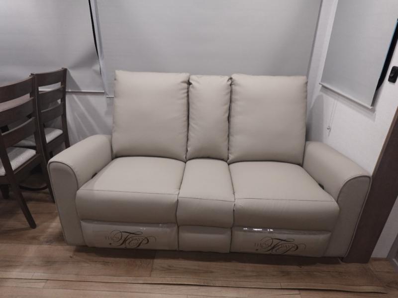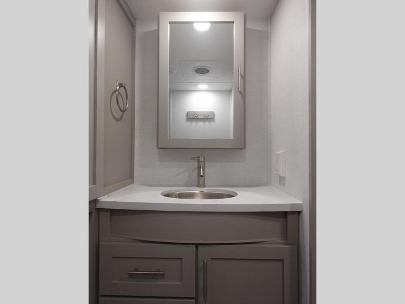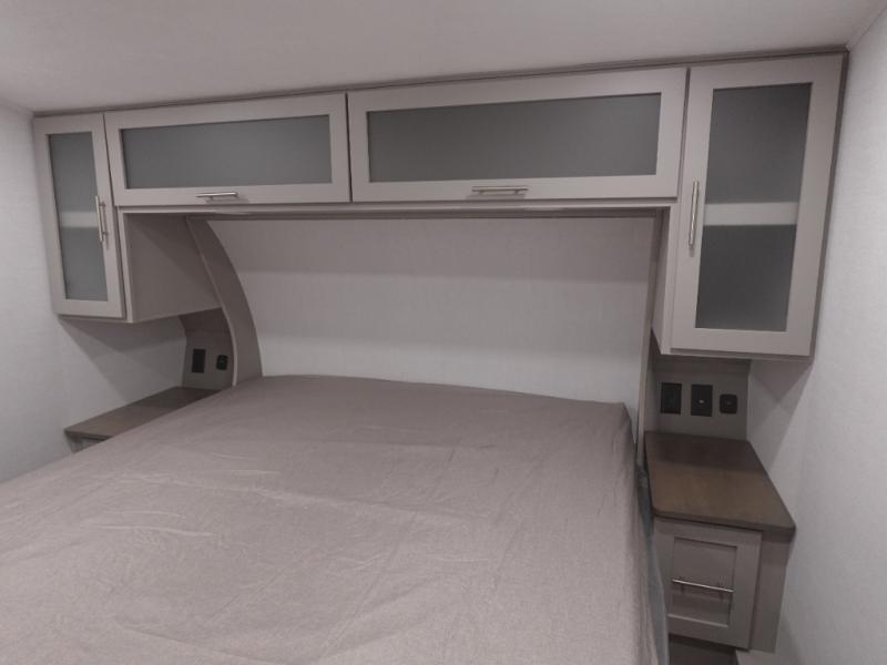 For the couple that enjoys adventures, this rear living coach has everything you need to travel comfortably and take along a couple of friends! The front private bedroom has a king bed with nightstands on either side for your personal belongings, and a wardrobe to keep your clothes looking nice. Freshen up each morning in the full bathroom with a 30" x 36" shower, and grab a towel stored close by in the linen closet. Now that you're ready for the day, you can head to the kitchen and create a hearty breakfast with the full kitchen amenities. You will appreciate having a 10 cu. ft. 12V refrigerator and three burner cooktop, plus there is a center island with plenty of counter space and a sink to make food prep even easier. Spend your evenings in true relaxation in the dual recliner theater seats across from the swing mount 50" HDTV with hidden storage behind. You will also love the pantry and hutch in the kitchen area for storing all of your dishes and non-perishables. Dine at the floating table with two chairs along with a moveable ottoman featuring storage.