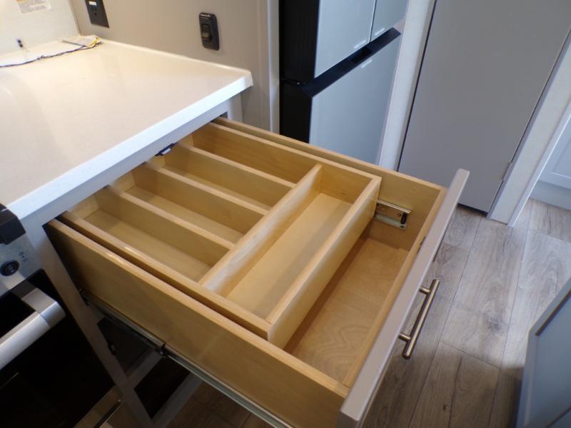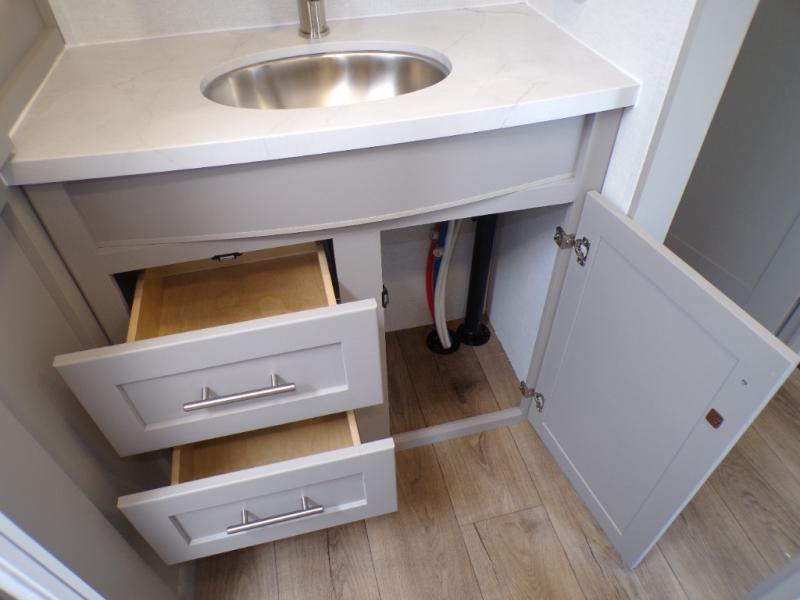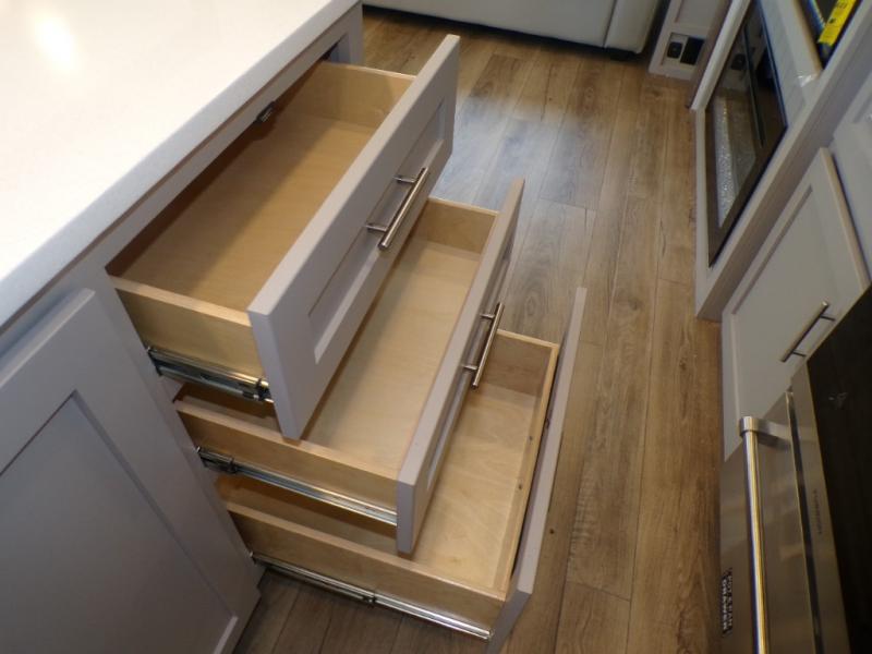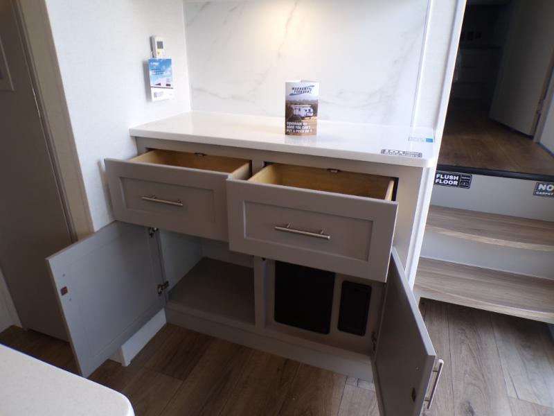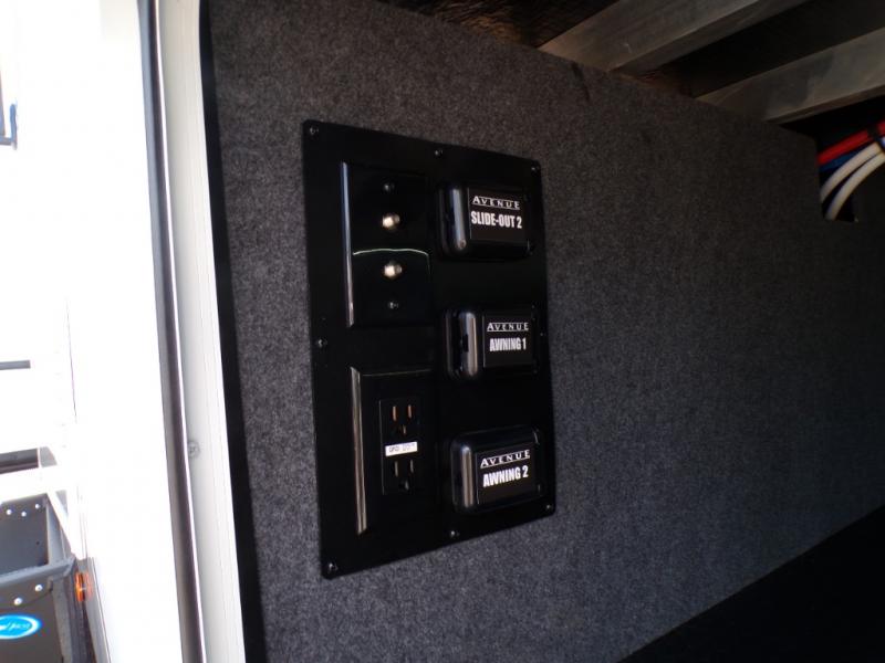 A benchmark chassis creates a space saver upper deck with each one of these Avenue All-Access fifth wheels by Alliance RV! The 101 in. wide-body construction gives you more room to walk around and the flush slide out floors throughout prevent any tripping. There are Azdel composite sidewalls inside and out, and a seamless fully walkable PVC roof for extreme durability and zero maintenance. You are sure to love no carpet throughout making each Avenue All-Access easy to clean and allergen free, not to mention pet friendly. You can maximize your space throughout with innovative storage solutions like the hidden storage behind the TV, inside the end tables, ottoman, and dinette chairs. These units also include the OTG Solar Package with a 200 watt solar panel, 15 amp MPPT charger, multiple outlets, and more to keep you powered up!