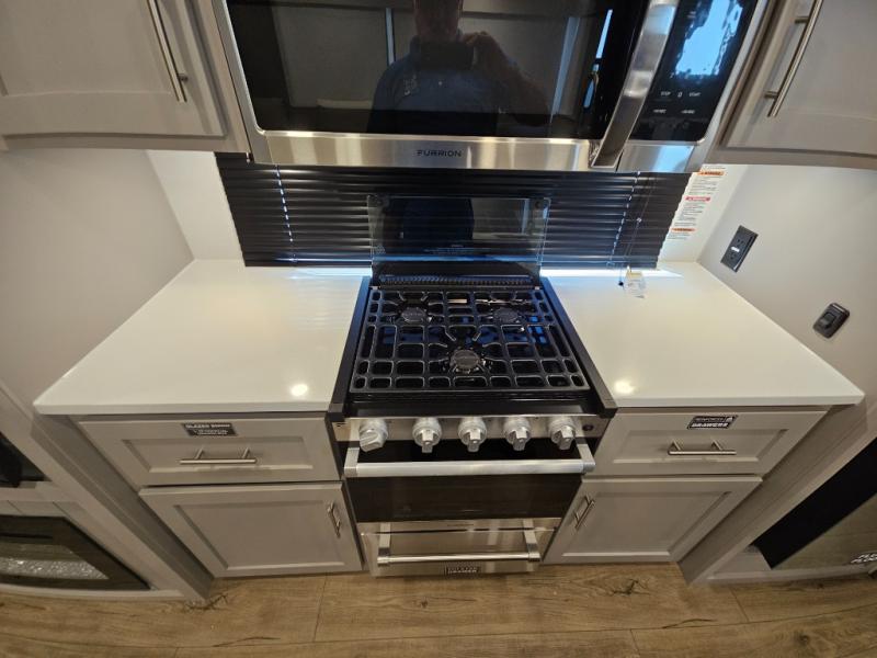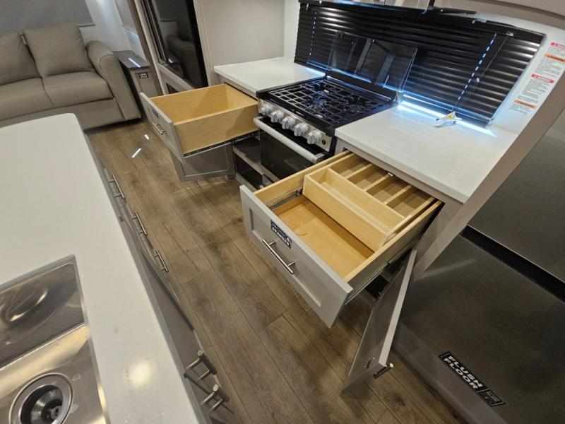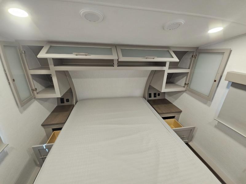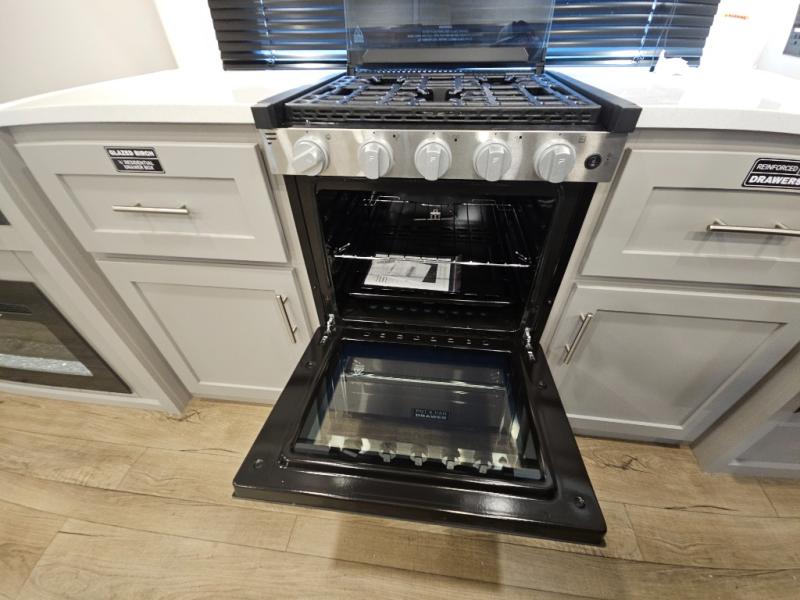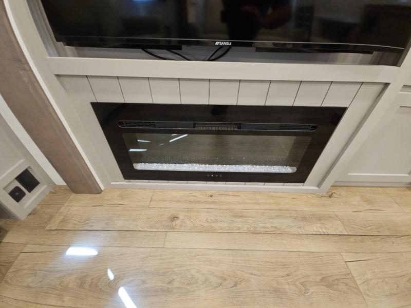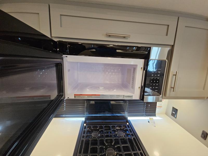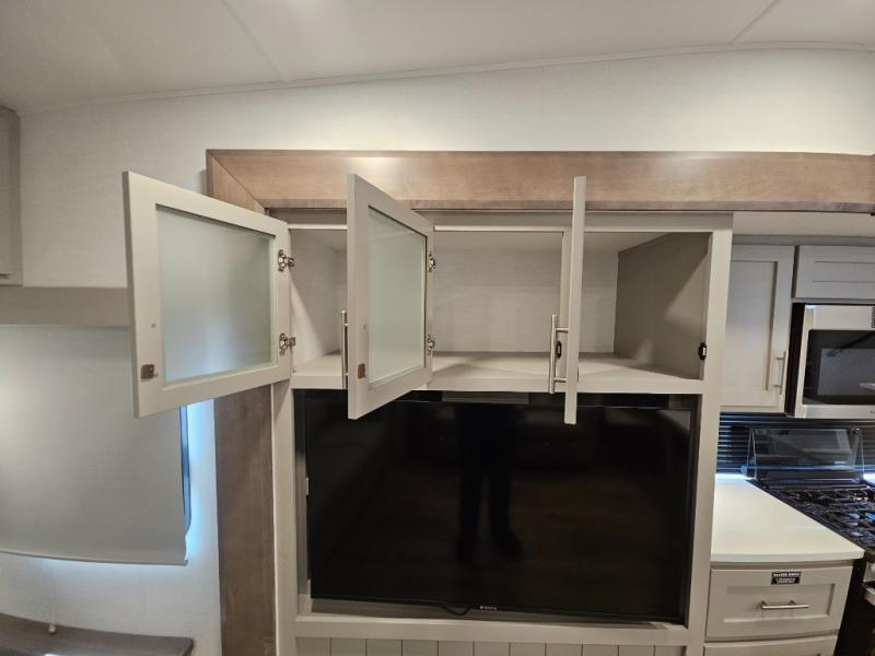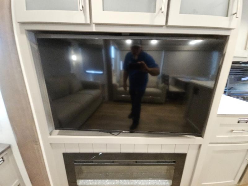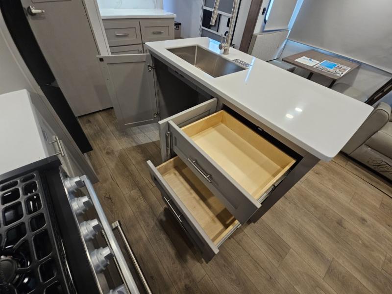 For the couple that enjoys adventures, this rear living coach has everything you need to travel comfortably and take along a couple of friends! The front private bedroom has a queen bed with nightstands on either side for your personal belongings, and a wardrobe to keep your clothes looking nice. Freshen up each morning in the full bathroom with a 30" x 36" shower, and grab a towel stored close by in the linen closet. Now that you're ready for the day, you can head to the kitchen and create a hearty breakfast with the full kitchen amenities. You will appreciate having a 10 cu. ft. 12V refrigerator and three burner cooktop, plus there is a center island with plenty of counter space and a sink to make food prep even easier. Spend your evenings in true relaxation in the dual recliner theater seats across from the swing mount 50" HDTV with hidden storage behind. You will also love the pantry and hutch in the kitchen area for storing all of your dishes and non-perishables. Dine at the floating table with two chairs along with a moveable ottoman featuring storage.