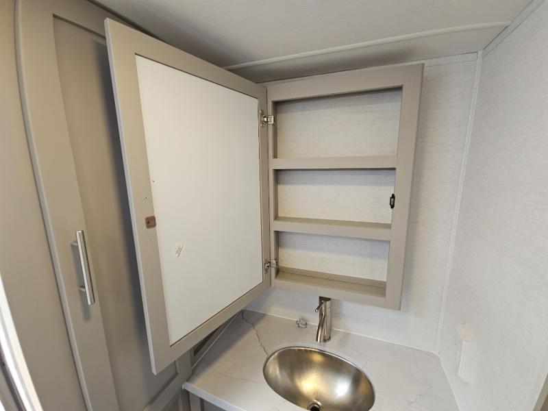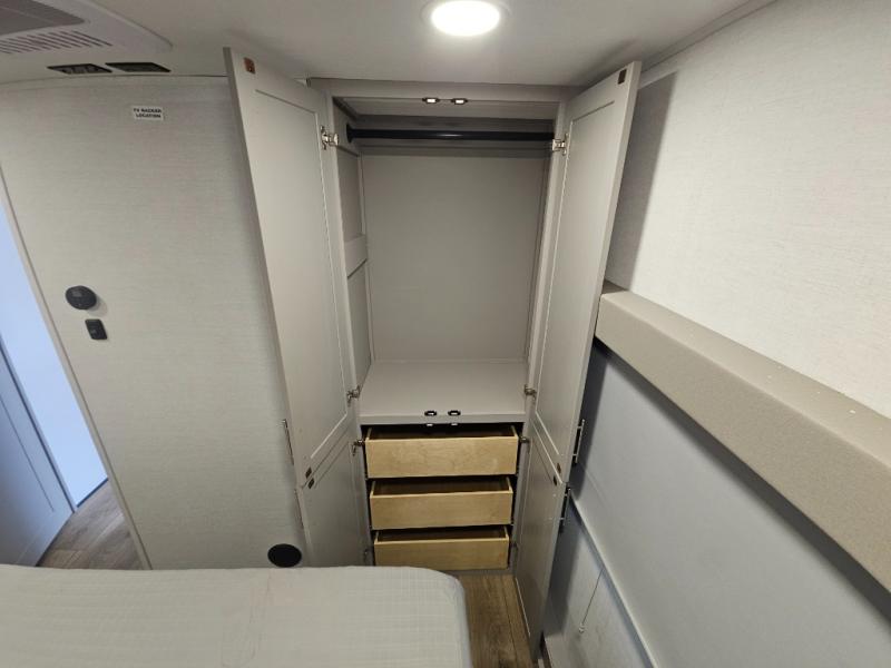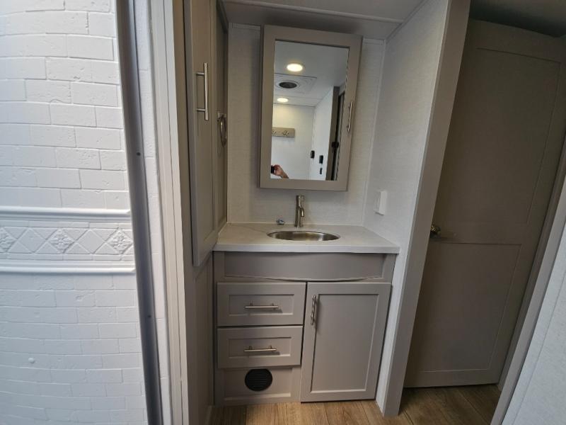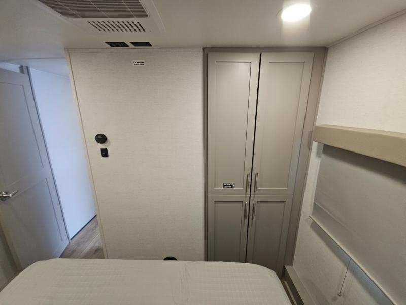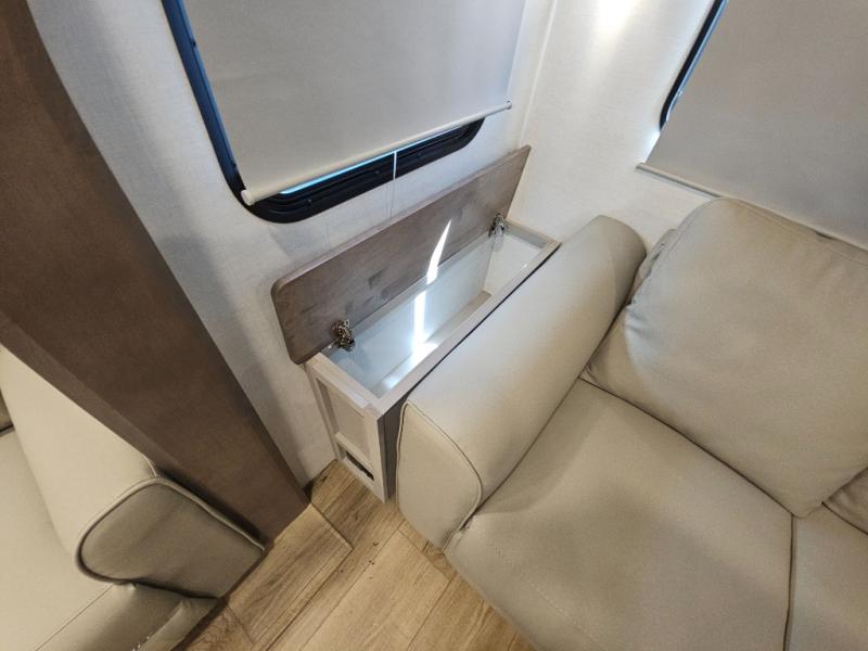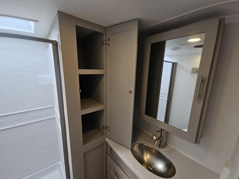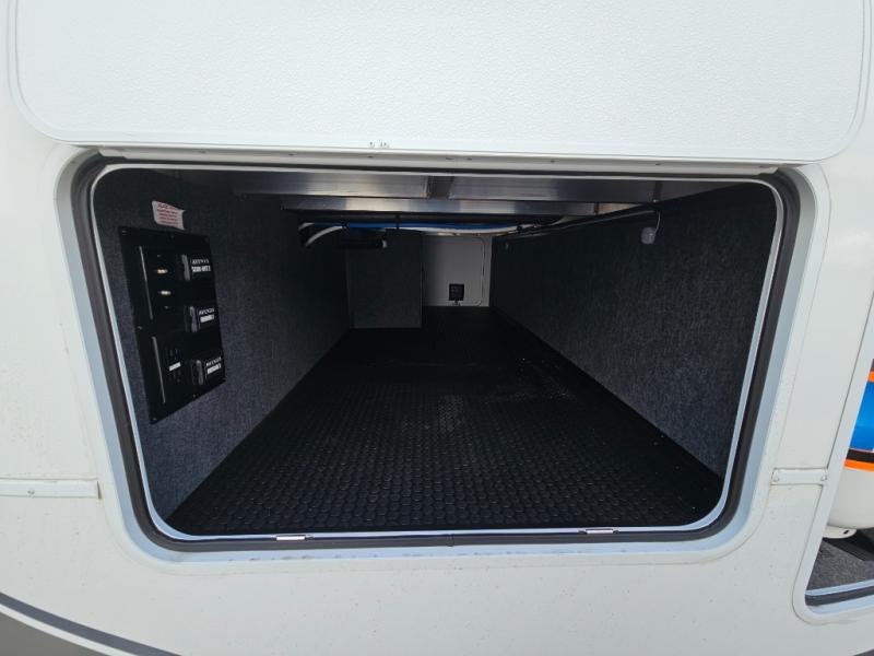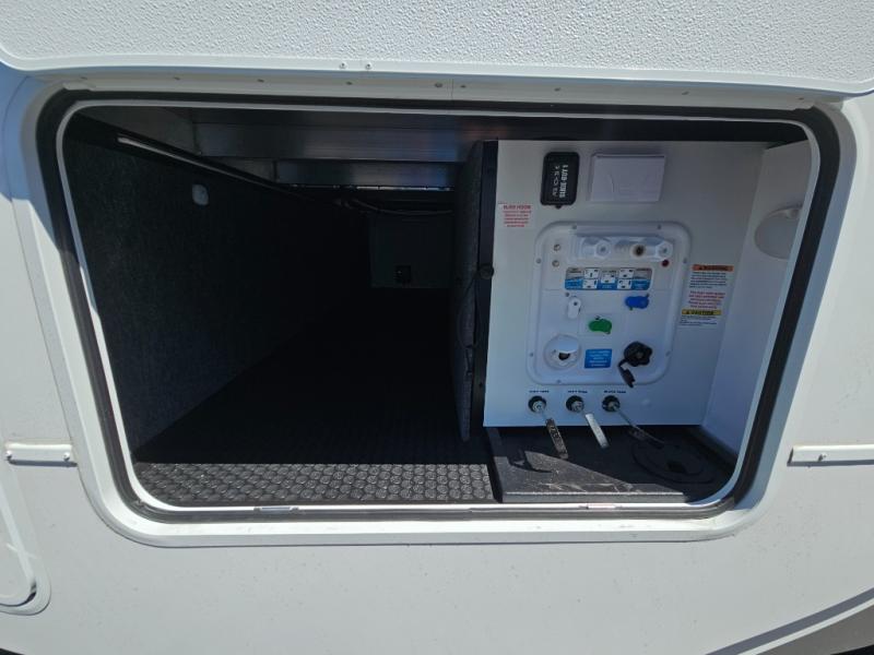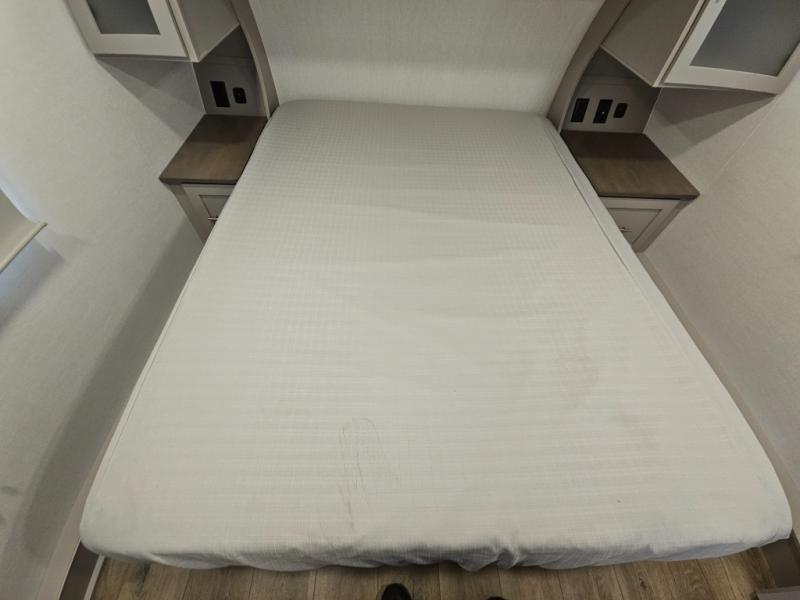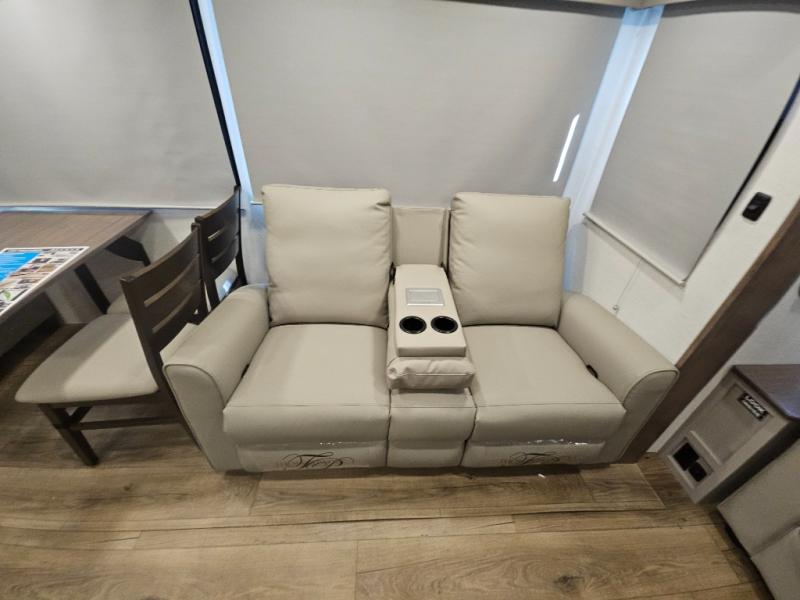 For the couple that enjoys adventures, this rear living coach has everything you need to travel comfortably and take along a couple of friends! The front private bedroom has a queen bed with nightstands on either side for your personal belongings, and a wardrobe to keep your clothes looking nice. Freshen up each morning in the full bathroom with a 30" x 36" shower, and grab a towel stored close by in the linen closet. Now that you're ready for the day, you can head to the kitchen and create a hearty breakfast with the full kitchen amenities. You will appreciate having a 10 cu. ft. 12V refrigerator and three burner cooktop, plus there is a center island with plenty of counter space and a sink to make food prep even easier. Spend your evenings in true relaxation in the dual recliner theater seats across from the swing mount 50" HDTV with hidden storage behind. You will also love the pantry and hutch in the kitchen area for storing all of your dishes and non-perishables. Dine at the floating table with two chairs along with a moveable ottoman featuring storage.