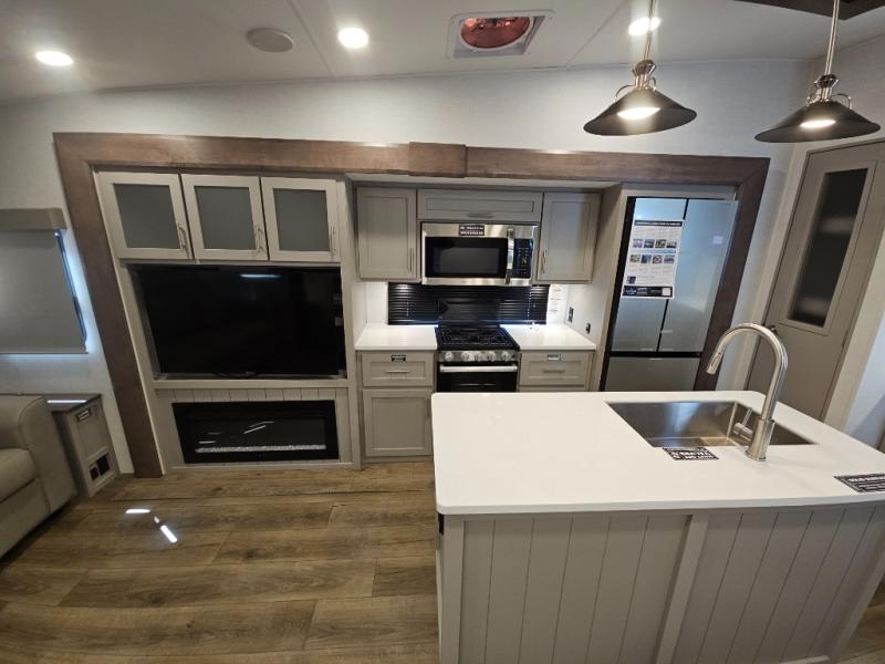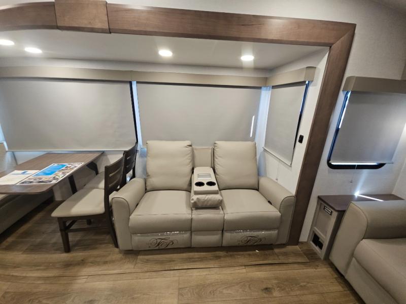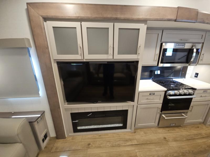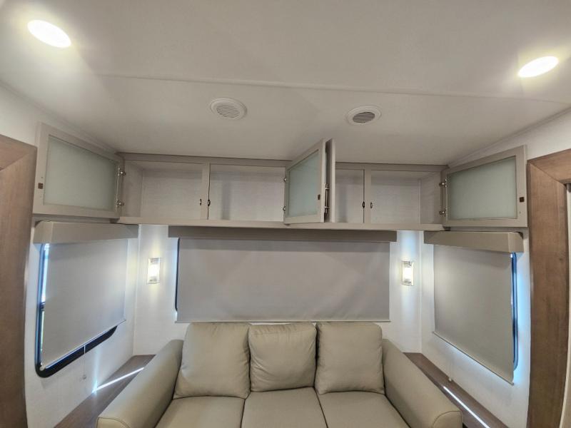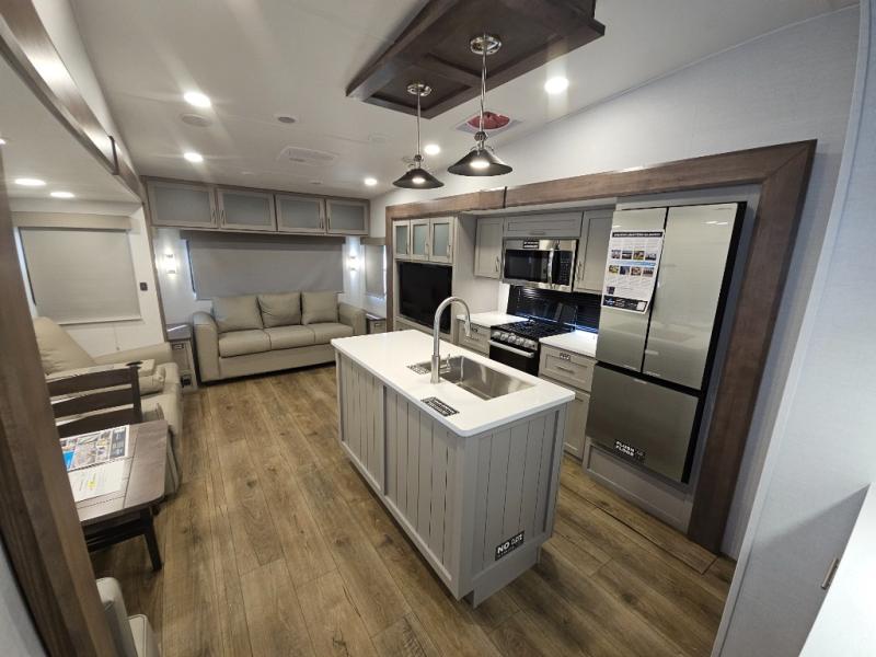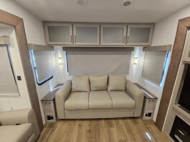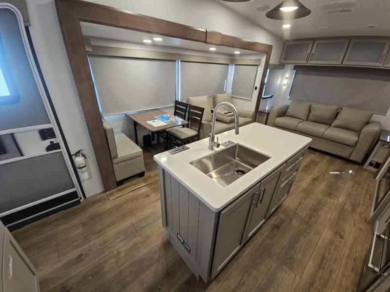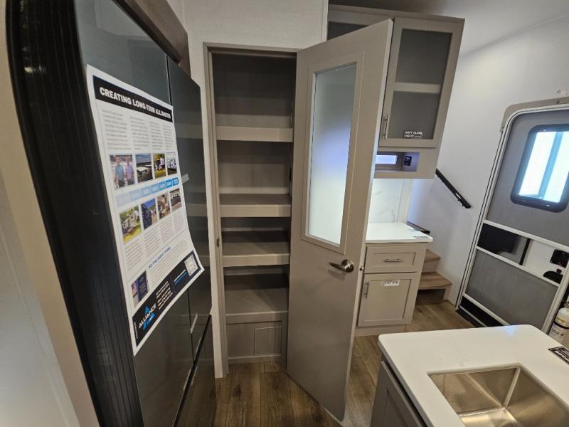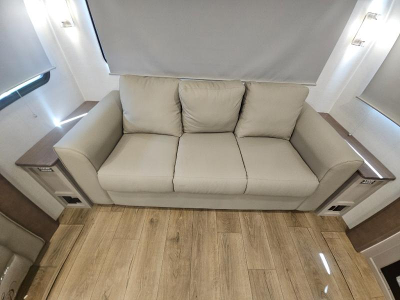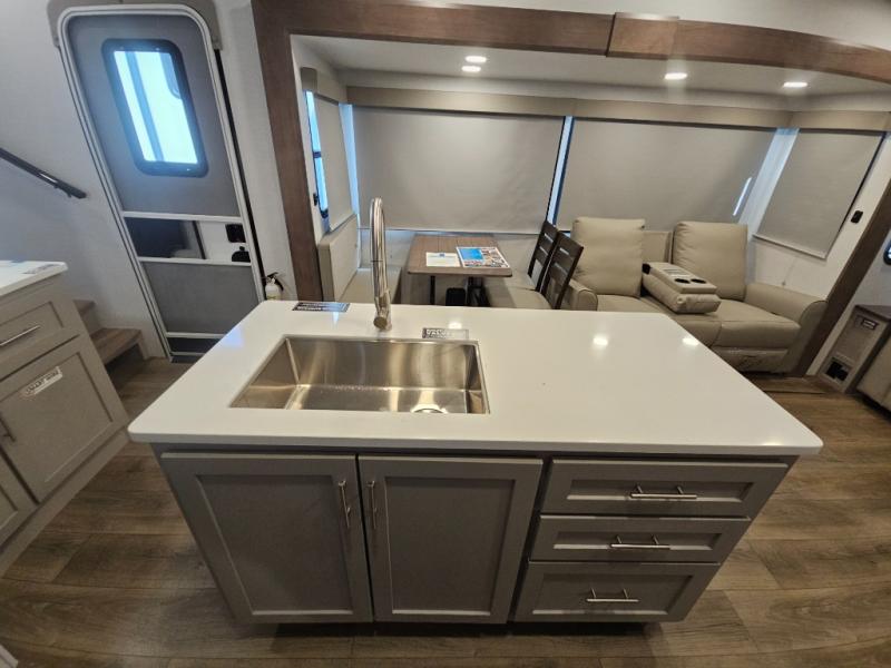 A benchmark chassis creates a space saver upper deck with each one of these Avenue All-Access fifth wheels by Alliance RV! The 101 in. wide-body construction gives you more room to walk around and the flush slide out floors throughout prevent any tripping. There are Azdel composite sidewalls inside and out, and a seamless fully walkable PVC roof for extreme durability and zero maintenance. You are sure to love no carpet throughout making each Avenue All-Access easy to clean and allergen free, not to mention pet friendly. You can maximize your space throughout with innovative storage solutions like the hidden storage behind the TV, inside the end tables, ottoman, and dinette chairs. These units also include the OTG Solar Package with a 200 watt solar panel, 15 amp MPPT charger, multiple outlets, and more to keep you powered up!