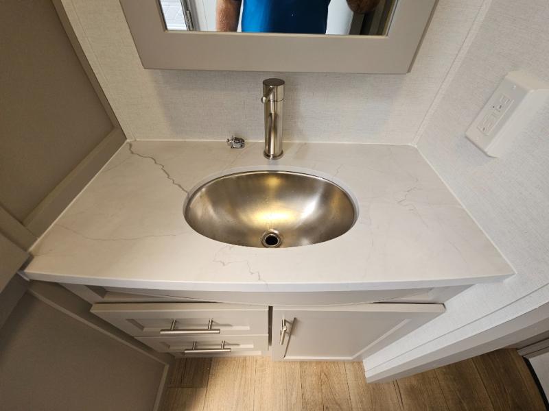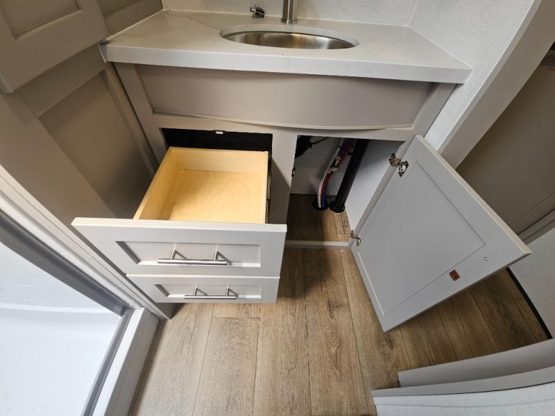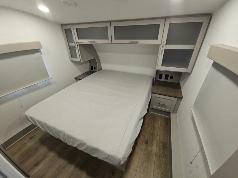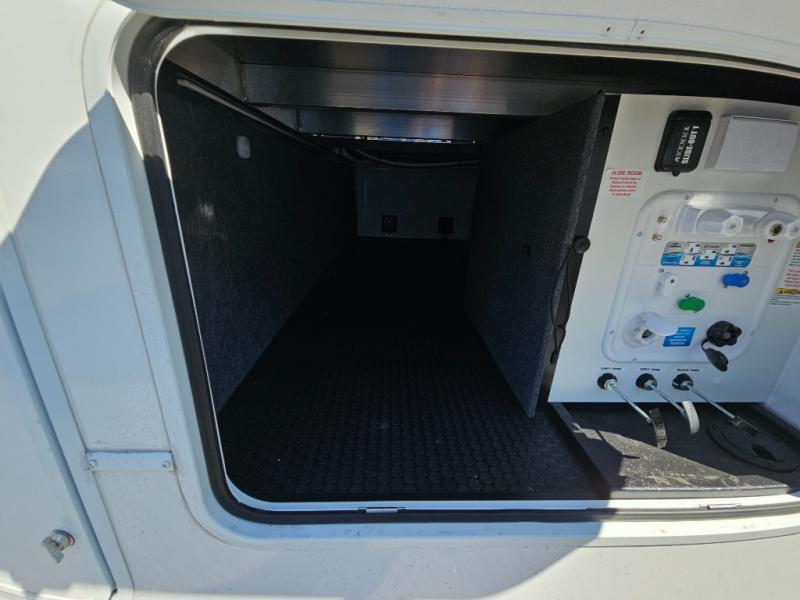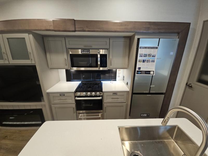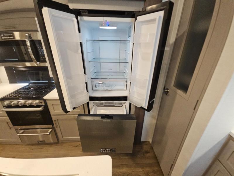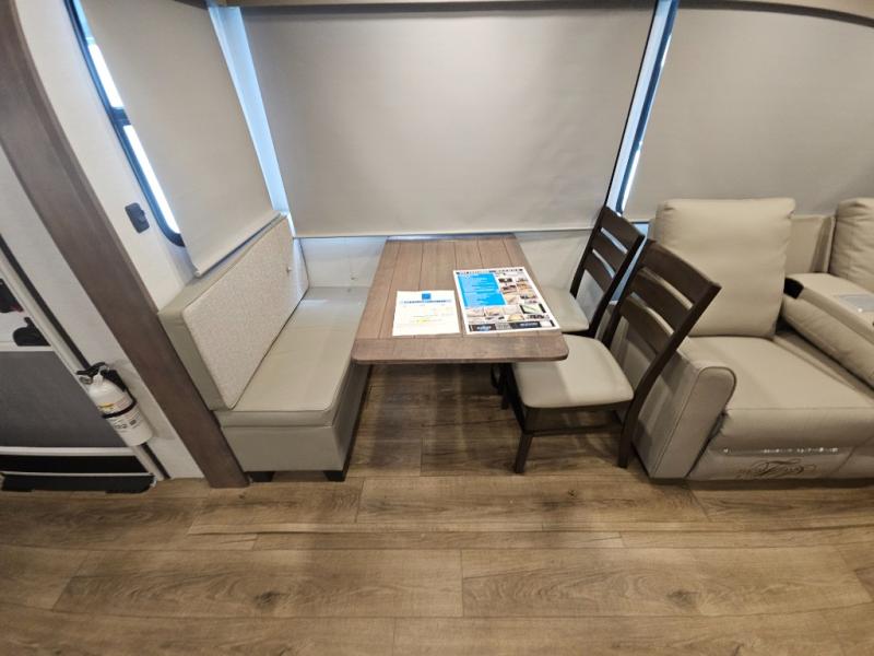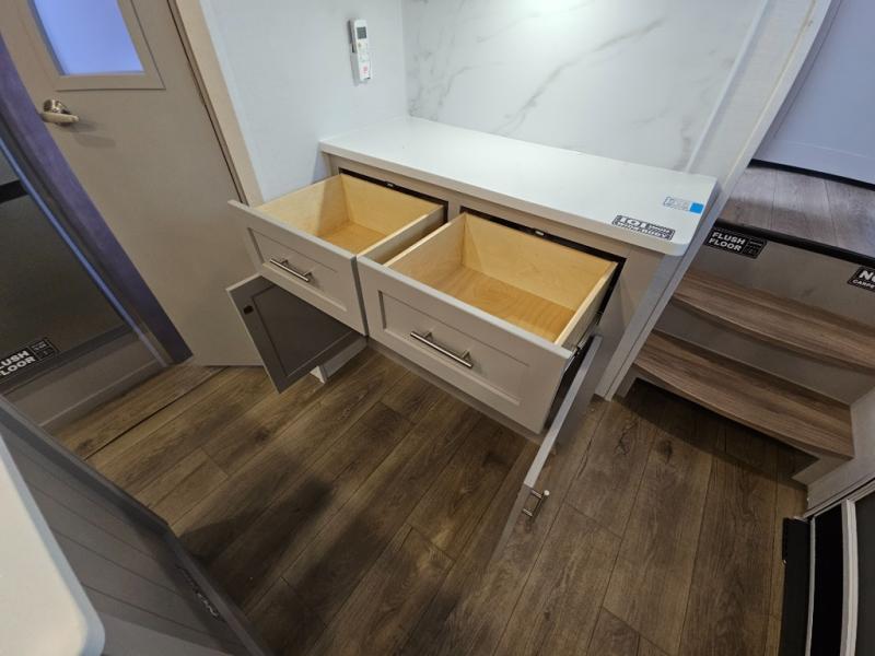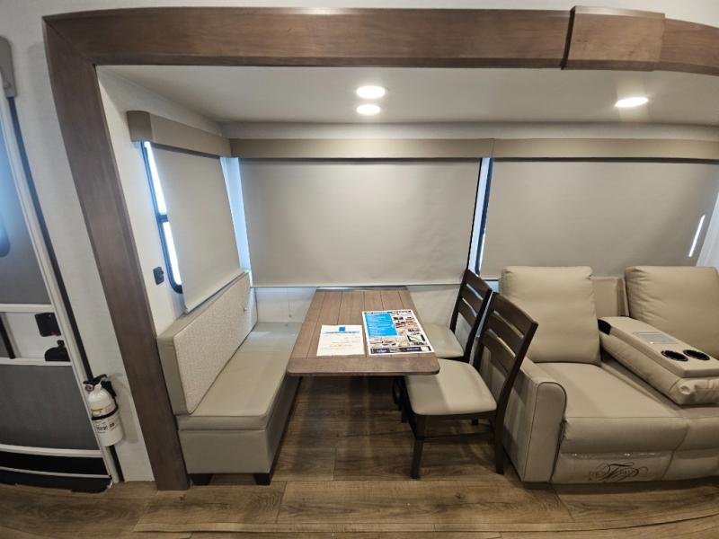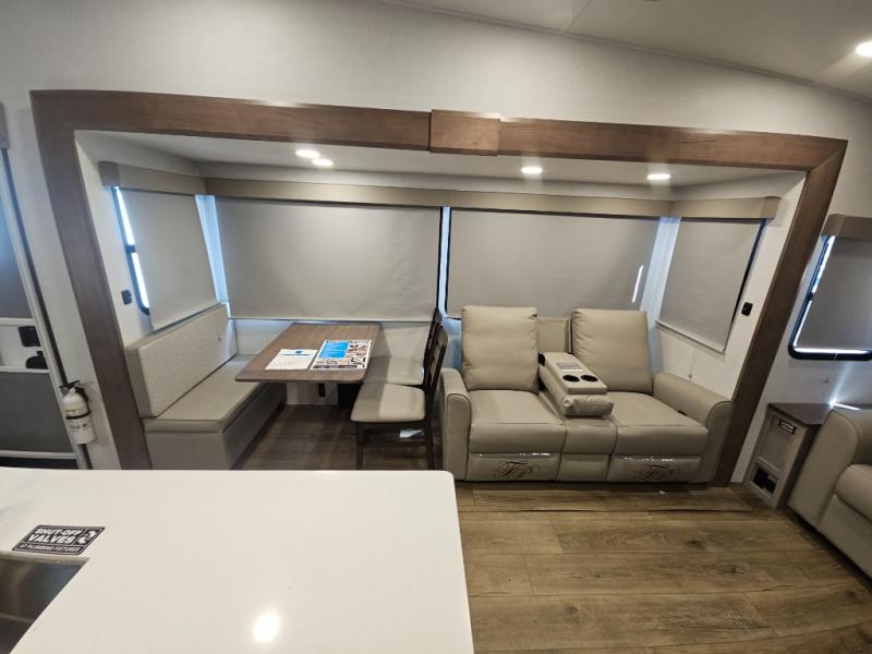 A benchmark chassis creates a space saver upper deck with each one of these Avenue All-Access fifth wheels by Alliance RV! The 101 in. wide-body construction gives you more room to walk around and the flush slide out floors throughout prevent any tripping. There are Azdel composite sidewalls inside and out, and a seamless fully walkable PVC roof for extreme durability and zero maintenance. You are sure to love no carpet throughout making each Avenue All-Access easy to clean and allergen free, not to mention pet friendly. You can maximize your space throughout with innovative storage solutions like the hidden storage behind the TV, inside the end tables, ottoman, and dinette chairs. These units also include the OTG Solar Package with a 200 watt solar panel, 15 amp MPPT charger, multiple outlets, and more to keep you powered up!