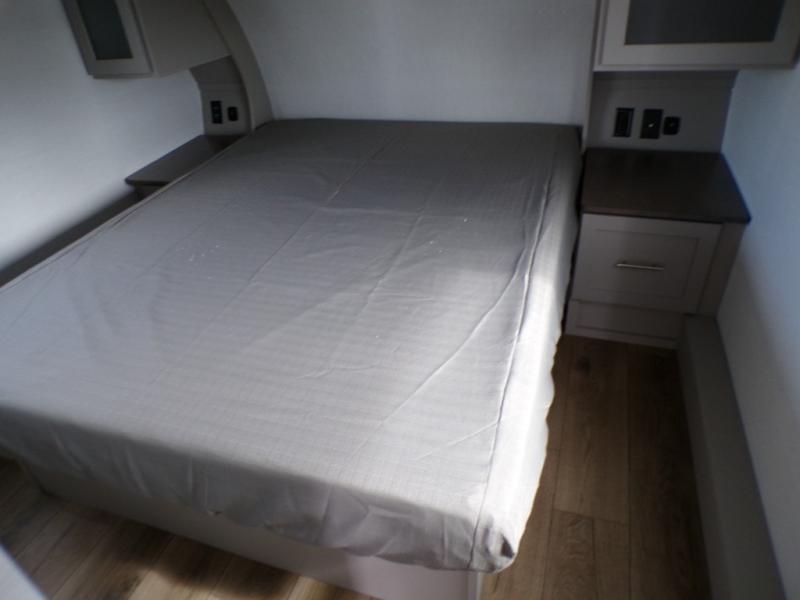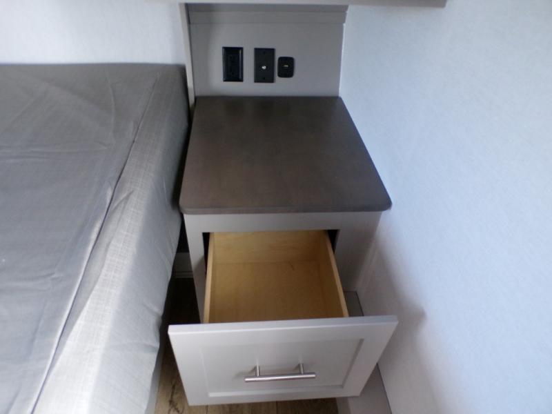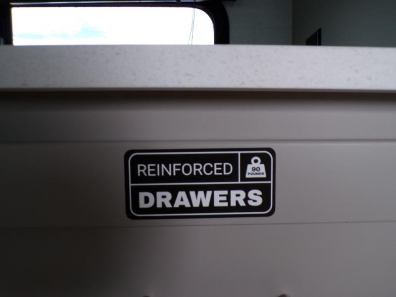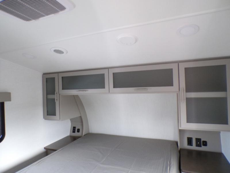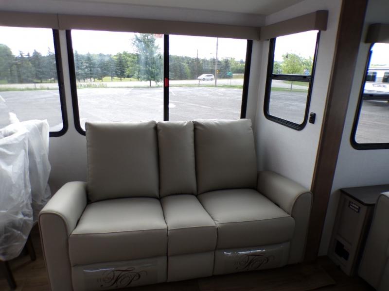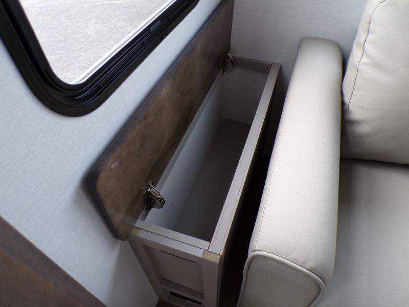 For the couple that enjoys adventures, this rear living coach has everything you need to travel comfortably and take along a couple of friends! The front private bedroom has a queen bed with nightstands on either side for your personal belongings, and a wardrobe to keep your clothes looking nice. Freshen up each morning in the full bathroom with a 30" x 36" shower, and grab a towel stored close by in the linen closet. Now that you're ready for the day, you can head to the kitchen and create a hearty breakfast with the full kitchen amenities. You will appreciate having a 10 cu. ft. 12V refrigerator and three burner cooktop, plus there is a center island with plenty of counter space and a sink to make food prep even easier. Spend your evenings in true relaxation in the dual recliner theater seats across from the swing mount 50" HDTV with hidden storage behind. You will also love the pantry and hutch in the kitchen area for storing all of your dishes and non-perishables. Dine at the floating table with two chairs along with a moveable ottoman featuring storage.