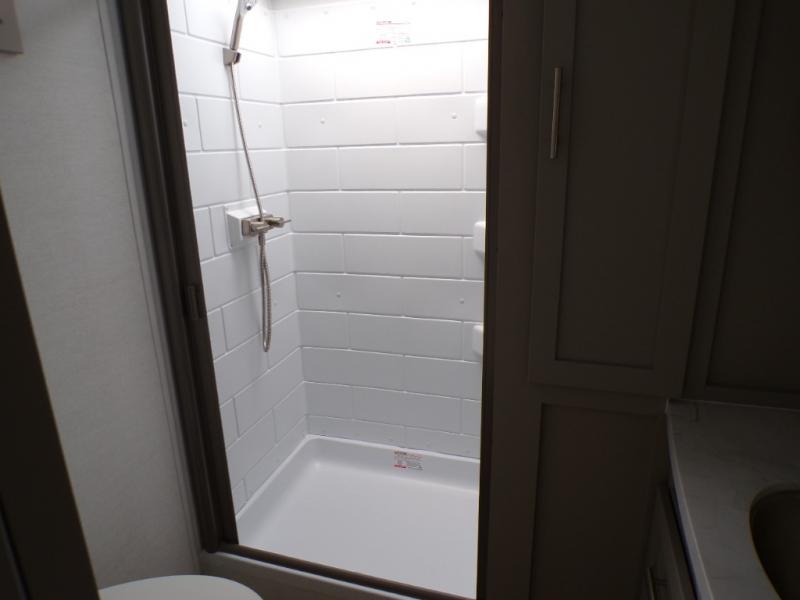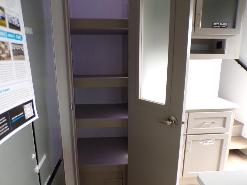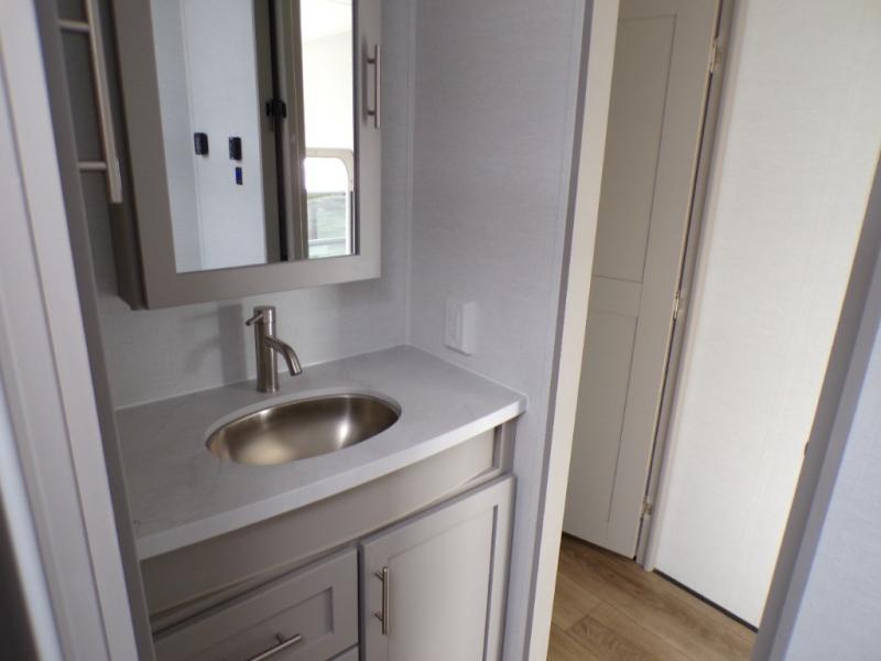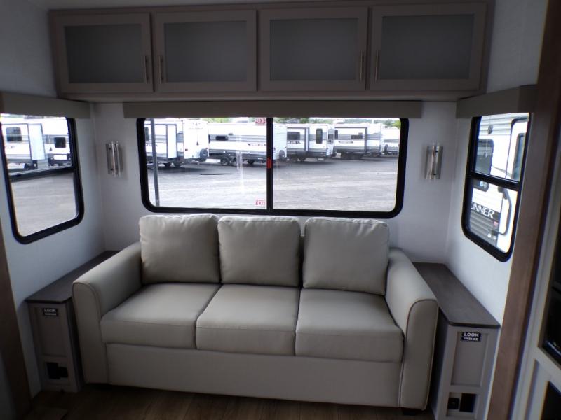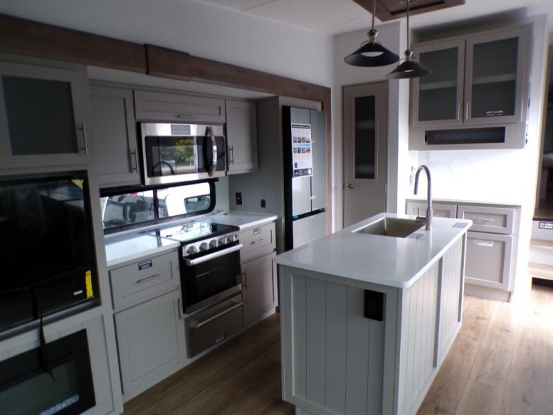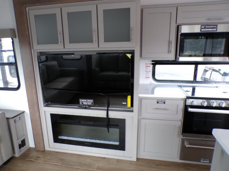 A benchmark chassis creates a space saver upper deck with each one of these Avenue All-Access fifth wheels by Alliance RV! The 101 in. wide-body construction gives you more room to walk around and the flush slide out floors throughout prevent any tripping. There are Azdel composite sidewalls inside and out, and a seamless fully walkable PVC roof for extreme durability and zero maintenance. You are sure to love no carpet throughout making each Avenue All-Access easy to clean and allergen free, not to mention pet friendly. You can maximize your space throughout with innovative storage solutions like the hidden storage behind the TV, inside the end tables, ottoman, and dinette chairs. These units also include the OTG Solar Package with a 200 watt solar panel, 15 amp MPPT charger, multiple outlets, and more to keep you powered up!