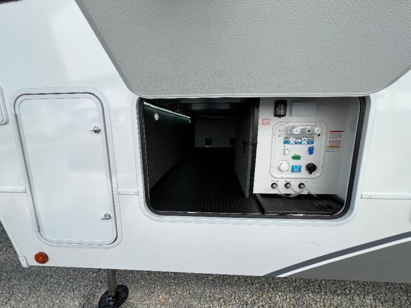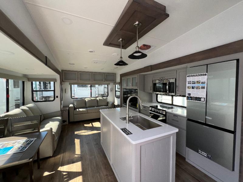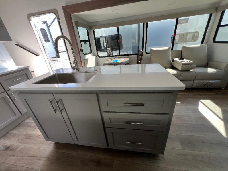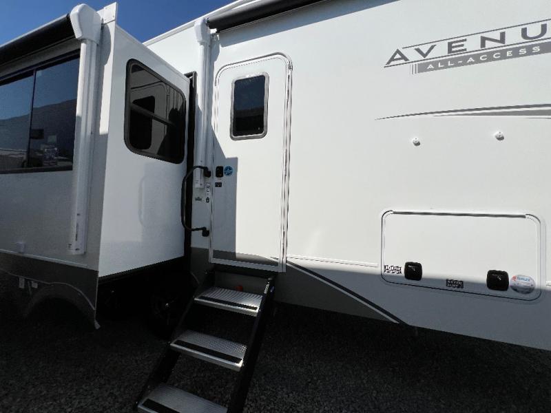 A benchmark chassis creates a space saver upper deck with each one of these Avenue All-Access fifth wheels by Alliance RV! The 101 in. wide-body construction gives you more room to walk around and the flush slide out floors throughout prevent any tripping. There are Azdel composite sidewalls inside and out, and a seamless fully walkable PVC roof for extreme durability and zero maintenance. You are sure to love no carpet throughout making each Avenue All-Access easy to clean and allergen free, not to mention pet friendly. You can maximize your space throughout with innovative storage solutions like the hidden storage behind the TV, inside the end tables, ottoman, and dinette chairs. These units also include the OTG Solar Package with a 200 watt solar panel, 15 amp MPPT charger, multiple outlets, and more to keep you powered up!